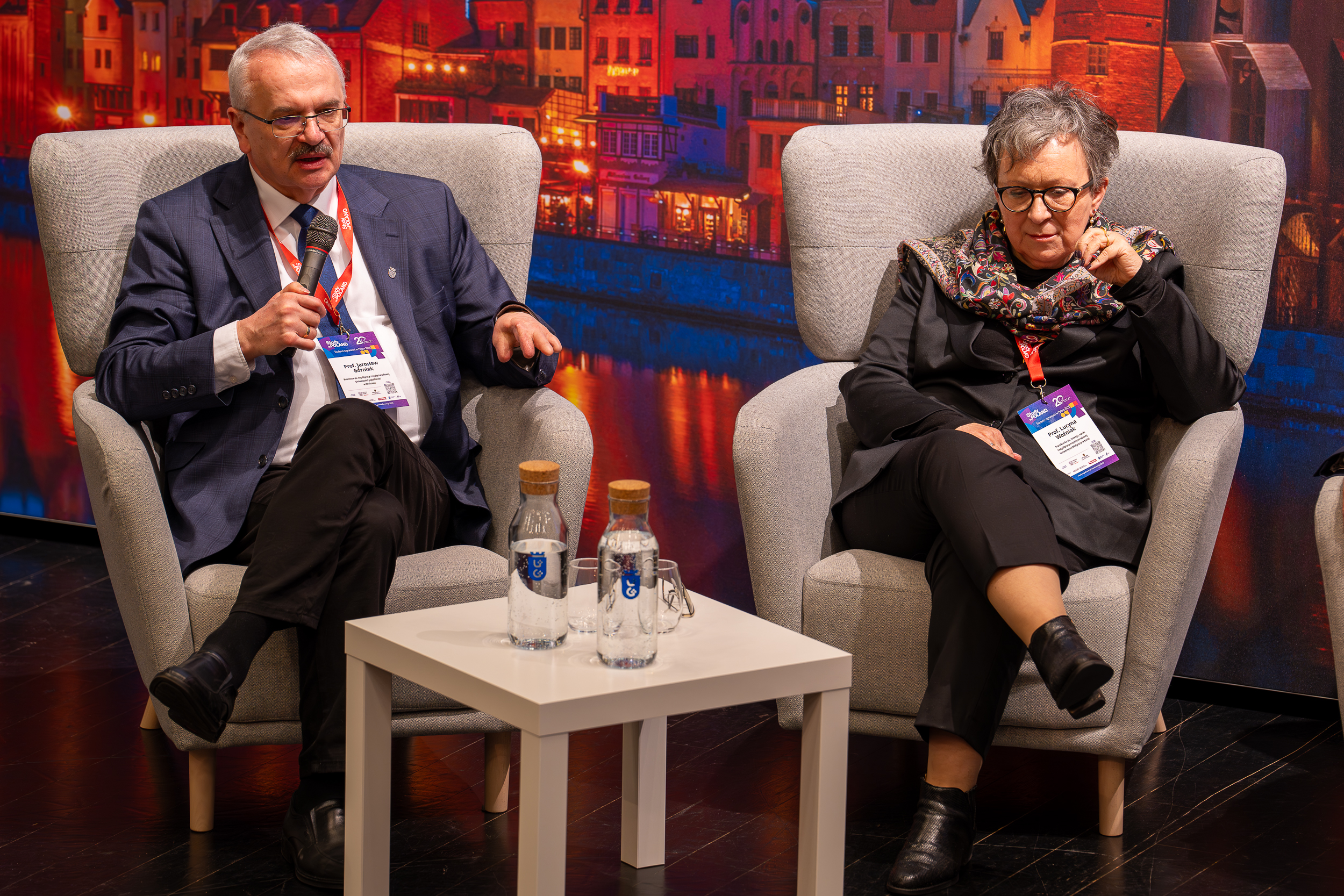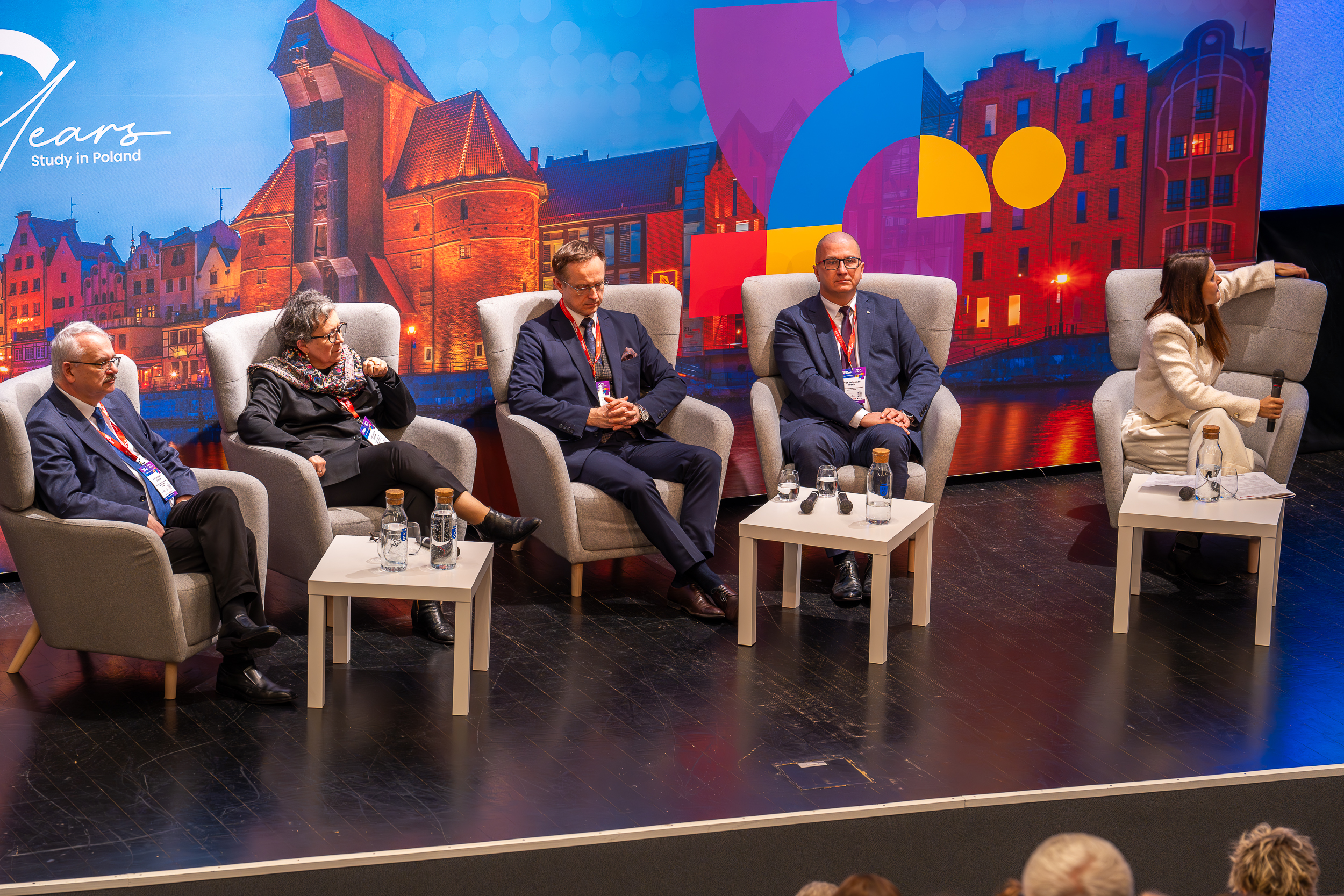 The topic of the first plenary session was ‘Main Challenges of Internationalisation of Higher Education in Poland 2025-28’. The internationalisation rate of Polish higher education is 8.5% and is currently at a high level of the European average. With the cooperation and support of government institutions, non-profit organisations and companies operating in the international knowledge and education market, it is necessary to strengthen the quantitative success with a qualitative dimension. The invited speakers discussed the key internationalisation tasks facing Polish science and higher education. The panel included the heads of institutions and organisations funded by national and EU budgets: Prof. Bogumiła Kaniewska, Chairwoman of the Conference of Rectors of Academic Schools in Poland, Rector of Adam Mickiewicz University in Poznań. The discussion was chaired by prof . Bogumiła Kaniewska, Chairwoman of the Conference of Rectors of Academic Schools in Poland, Rector of Adam Mickiewicz University in Poznań, Ludwik Szakiel, Deputy Director of the Department of Economic Development at the Marshal's Office of Pomorskie Voivodeship, Mirosław Marczewski, General Director of the National Agency of Erasmus+ Programme and European Solidarity Corps (FRSE), dr Wojciech Karczewski, Director of the National Agency for Academic Exchange (NAWA), prof. Janusz Uriasz, President of the Polish Accreditation Committee, and prof. Grzegorz Mazurek, Rector of Leon Koźmiński Academy. The discussion was chaired by Waldemar Siwiński, President of the IREG Observatory on Academic Ranking and Excellence, Founding President of the ‘Perspektywy’ Educational Foundation.