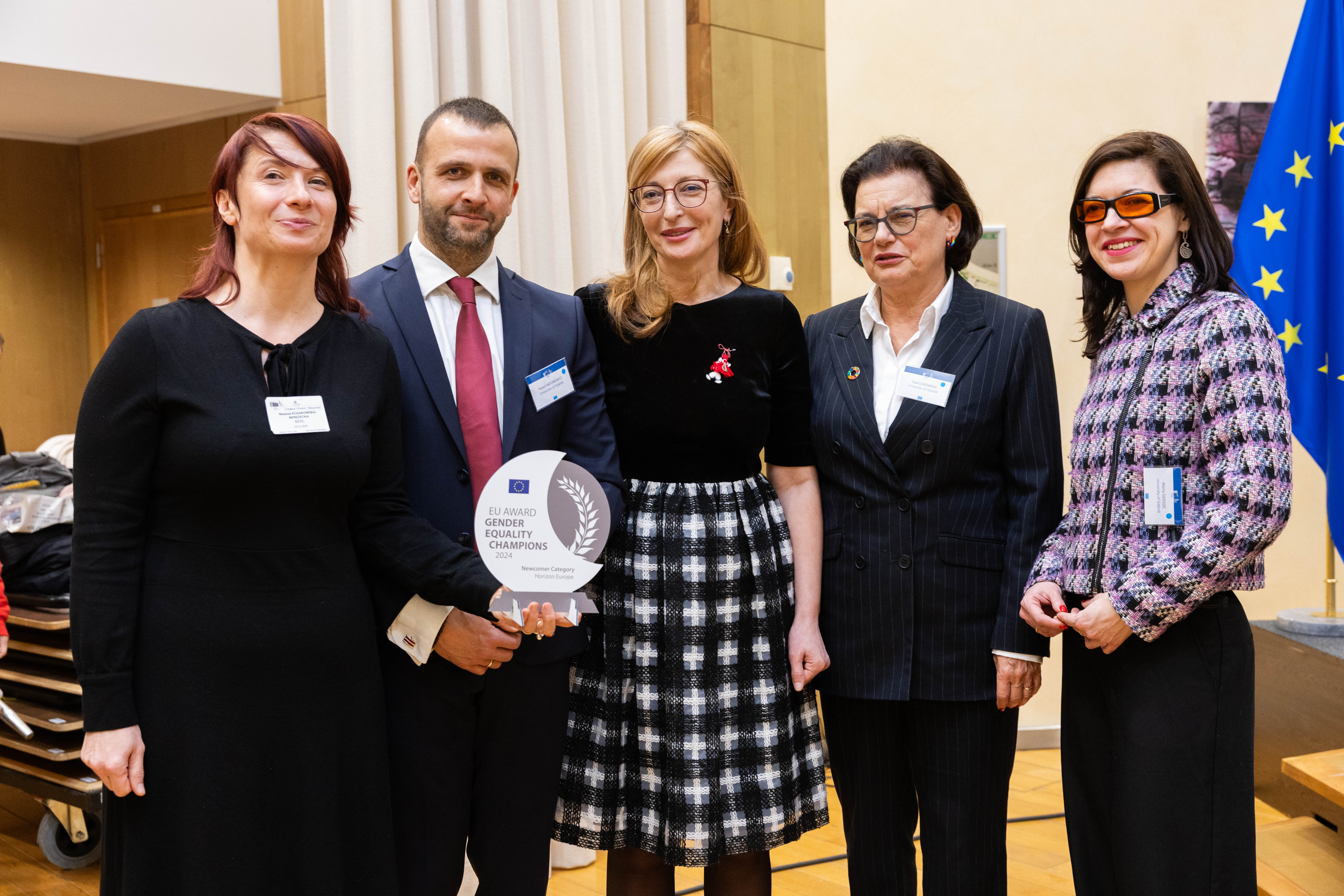 The European Commission has announced the winners of the third edition of the award for gender equality leaders in research and innovation, recognising their outstanding achievements in promoting gender equality in academic and research institutions. The University of Gdańsk was awarded in the Newcomer Gender Equality Champions category, which recognised organisations that have recently implemented their first Gender Equality Plan (GEP) and can demonstrate the greatest progress achieved through its implementation. On behalf of the University of Gdańsk, the award was collected during a gala held in Brussels by the Vice-Rector for Development and Finance, dr hab. Paweł Antonowicz, prof. UG, prof. dr hab. Ewa Łojkowska, dr hab. Natasza Kosakowska-Berezecka, prof. UG and mgr Marta Dziedzic. The University of Gdańsk, like the winners in other categories, received a financial prize of 100,000 euros. The award was presented by Ekaterina Zaharieva, Commissioner for Start-ups, Research and Innovation.