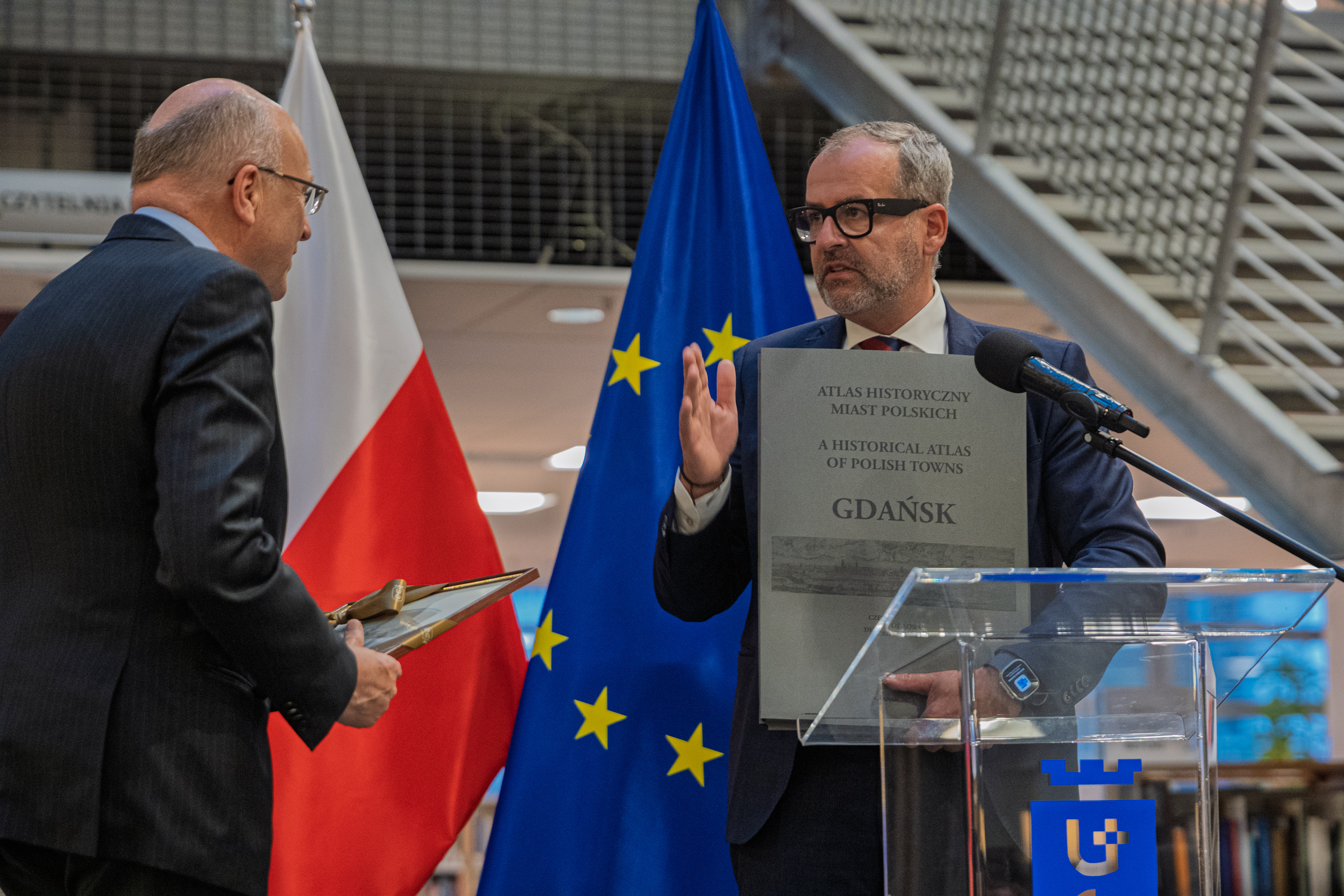 At the end, the Rector presented Mr Lenaerts with the framed representation of Gdańsk's Golden Gate as well as the unique collection of maps of Gdańsk published by the University of Gdańsk Press.
