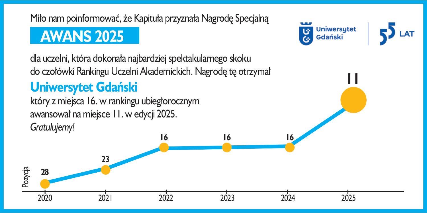 ‘The University of Gdańsk's rise to 11th place, 5 places up, in the Perspektywy 2025 University Ranking is a huge success for us, a source of pride and proof of the importance of consistent teamwork by the entire academic community. It is their commitment and professionalism that allow us to develop a modern, open and innovative university, which is at the forefront of Polish higher education institutions,’ said UG Rector prof. dr hab. Piotr Stepnowski. ‘When I began my mission as Rector of the University of Gdańsk in 2020, we were ranked 28th in the Perspektywy ranking and 8th in the university classification. We knew that we were capable of much more, and we mustered the incredible strength that has brought us to where we are today! This promotion gives us new energy and motivation for further action. This ranking confirms that we are a university that sets the highest standards in science and teaching, cooperates intensively with business and actively builds its position on the international arena. I am also pleased that, despite the high and demanding competition, we maintain our strong position among the leading classical universities. As President of the Conference of Rectors of Polish Universities, I closely follow the dynamic development of all member universities, and I know what a challenge it is to maintain our current position and high rating by the Perspektywy Ranking Committee. This is a confirmation of the high quality of education, research and international activity at our university.’