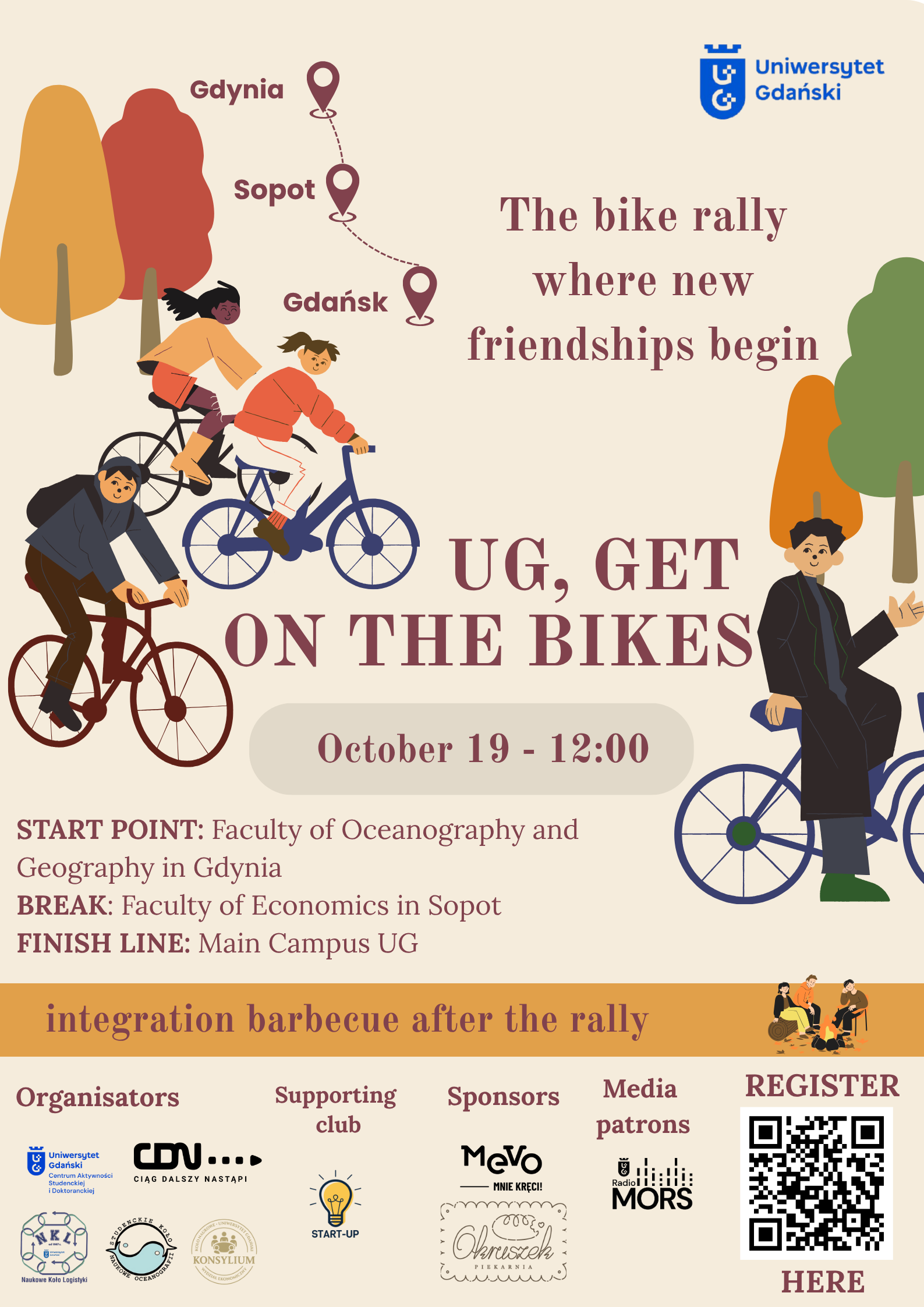 Would you like to spend your time actively, meet new people and see the three campuses of the University of Gdańsk from a cyclist's perspective? Join the UG Bike Rally! We invite all members of the academic community to ride from Gdynia (the park opposite the Faculty of Oceanography and Geography) to Gdańsk (Oliwa campus), with a break at the Sopot campus. The rally will take place on Sunday, 19 October 2025. The event will end with a barbecue!