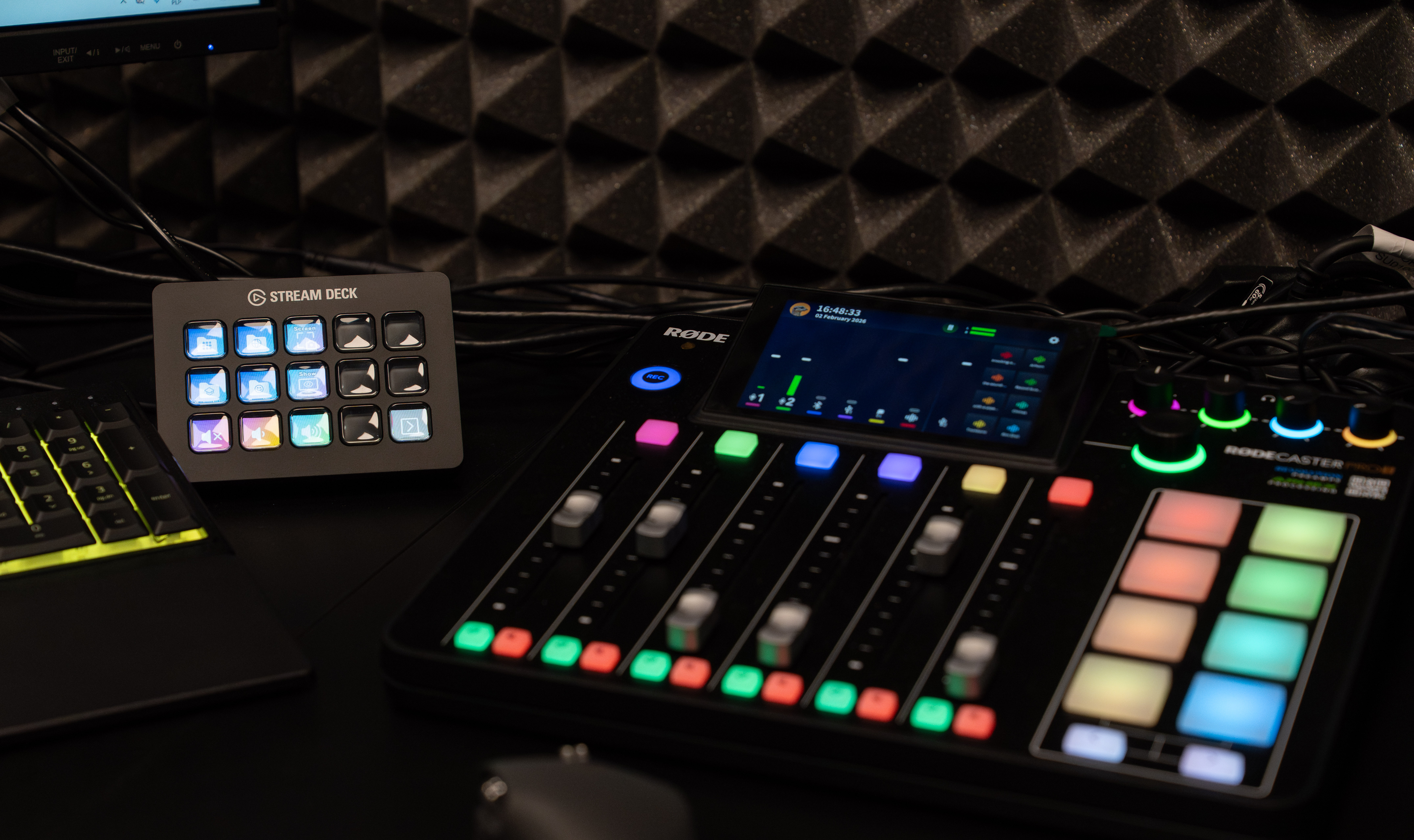 W skład studia wchodzą m.in. profesjonalne mikrofony pojemnościowe Rode NT1 5th Gen wraz z ramionami studyjnymi i popfiltrami, interfejs audio RØDECaster Pro II oraz słuchawki studyjne Rode NTH-100, zapewniające wysoką jakość rejestracji i odsłuchu dźwięku.