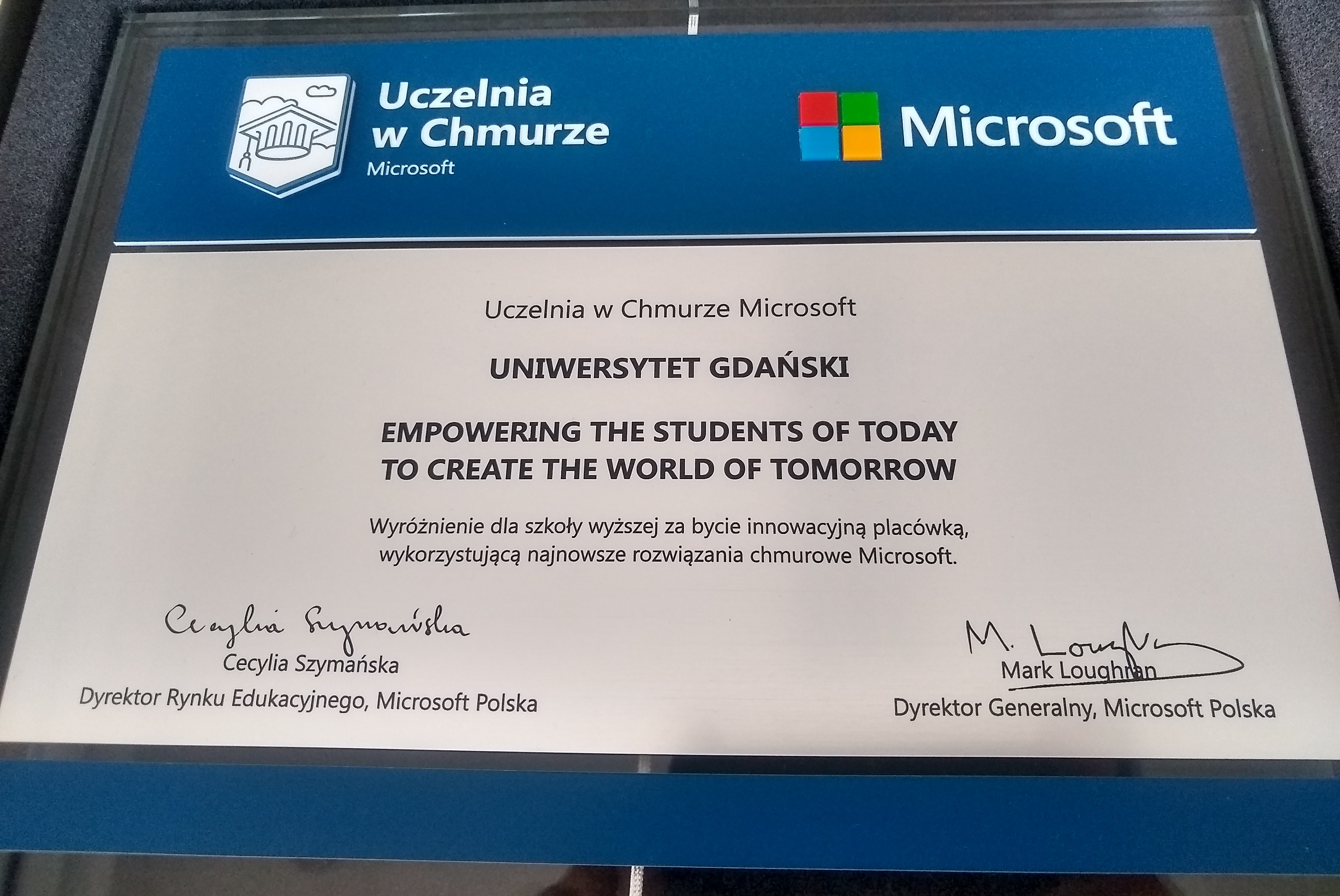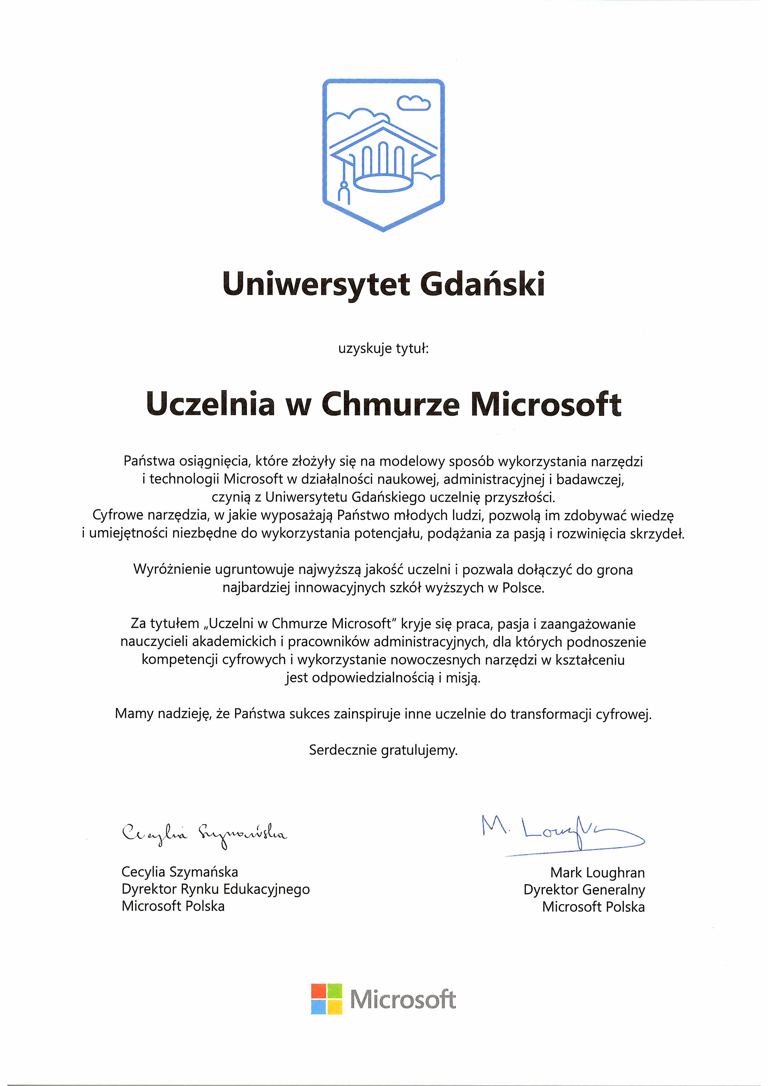 Wyróżnienie przyznane przez firmę Microsoft Uniwersytetowi Gdańskiemu odebrał dziś (28.04.2021) Rektor prof. dr hab. Piotr Stepnowski. Uczelnia w chmurze to nowy program realizowany przez firmę Microsoft wyróżniający i zrzeszający uczelnie, które w modelowy sposób wykorzystują narzędzia i technologie Microsoft w swojej działalności naukowej, administracyjnej i badawczej.