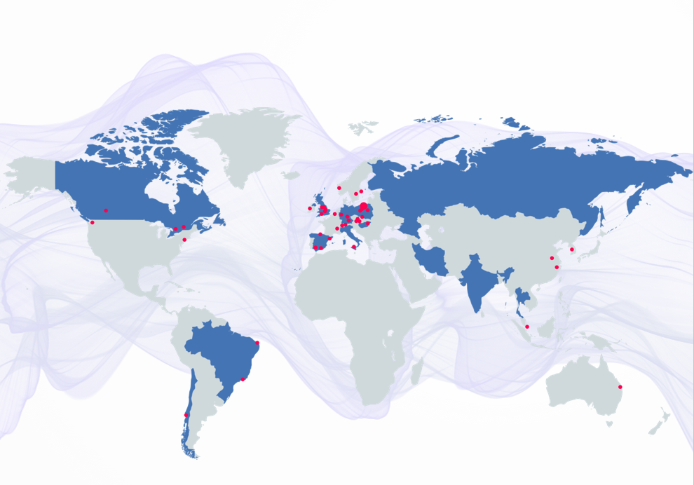 Kolorem niebieskim zaznaczono kraje pochodzenia pracowników i studentów ICTQT, a czerwonym grupy badawcze, współpracujące z ICTQT.