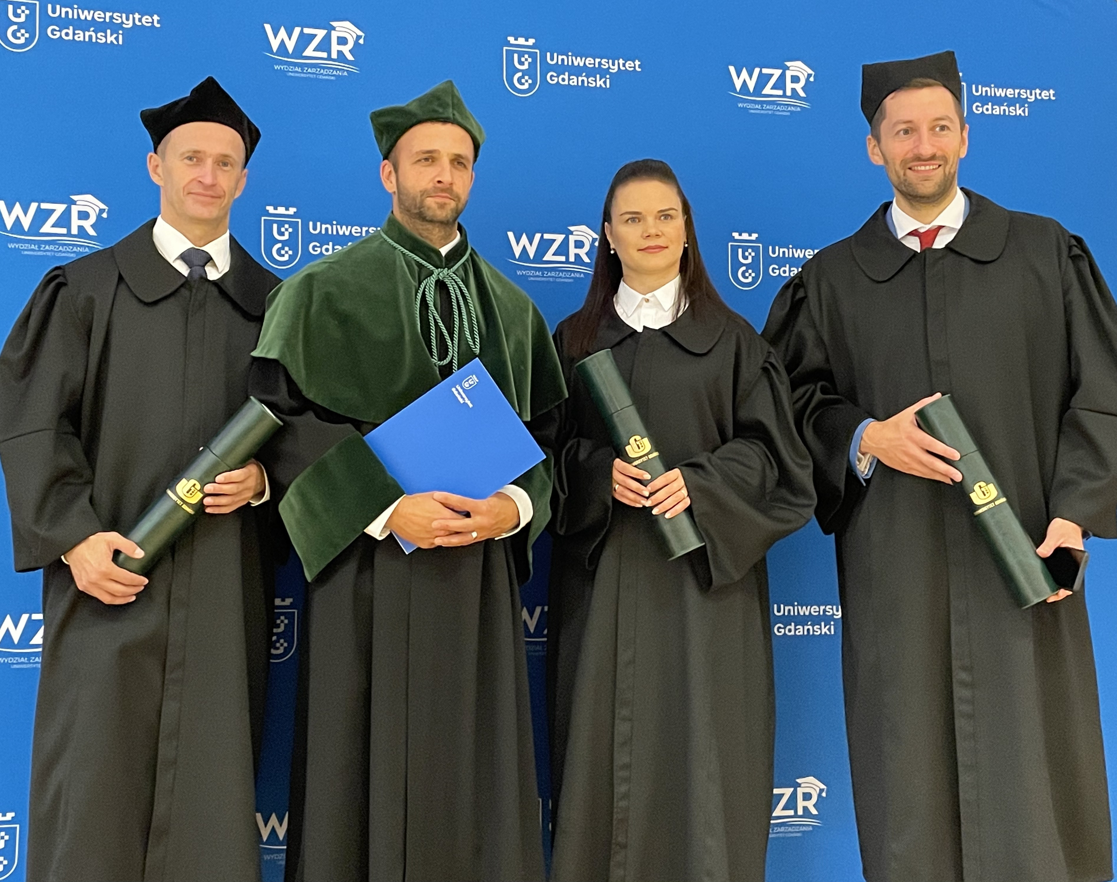 W dalszej części uroczystości odbyła się uroczysta promocja doktorska - ślubowanie przeprowadził Rektor UG, a o wystąpienie proszeni zostali promotorzy doktorantów: dr Ulyana Zaremba - promotor: dr hab. Paweł Antonowicz, prof. uczelni., dr Jędrzej Siciński - promotor: dr hab. Paweł Antonowicz, prof. uczelni., promotor pomocniczy: dr Anna Gierusz, dr Piotr Skrzyniarz - promotor: dr hab. Paweł Antonowicz, prof. uczelni.