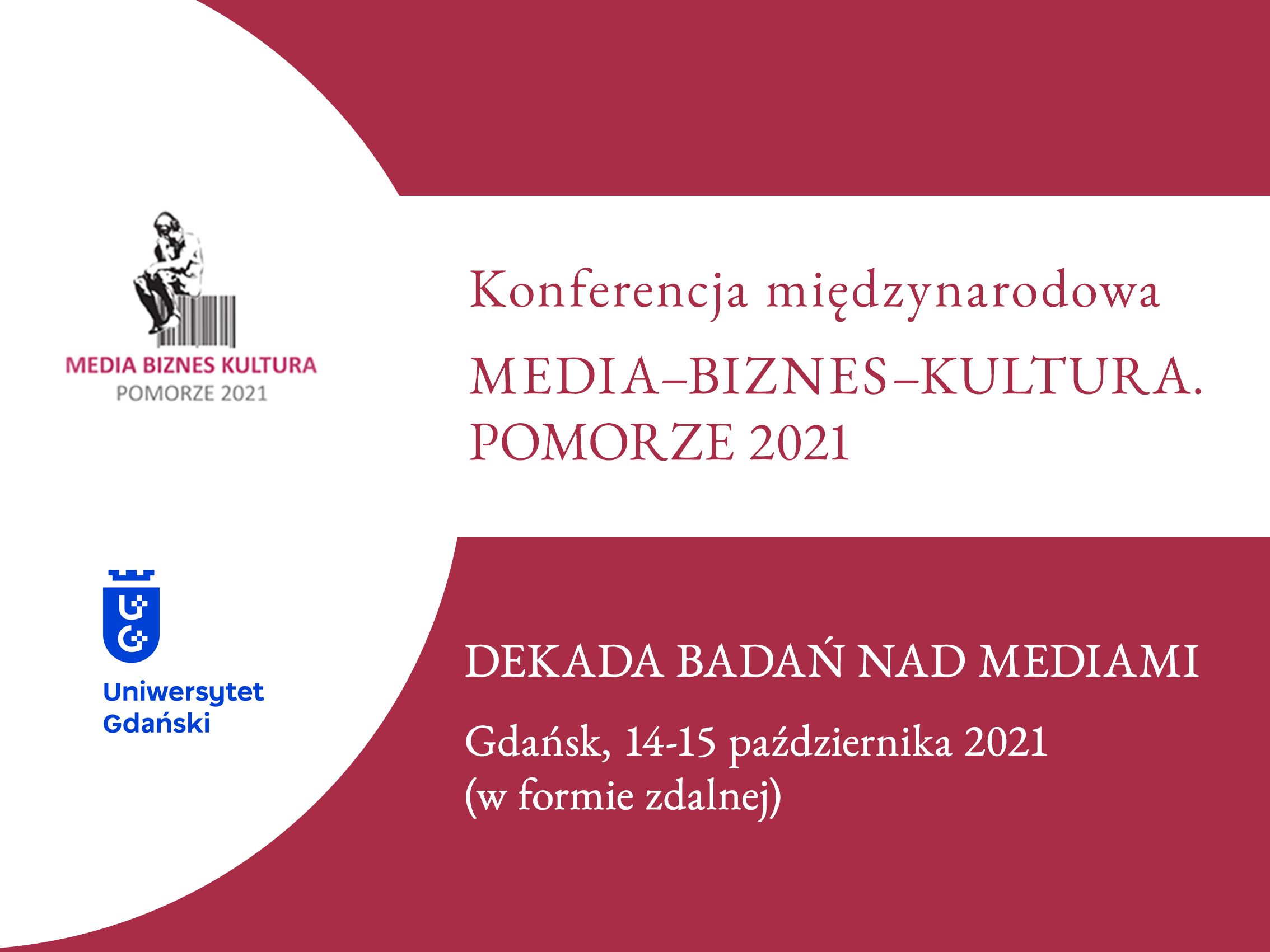 Tegoroczna Konferencja Media-Biznes-Kultura. Pomorze 2021 będzie miała wyjątkowy charakter. W tym roku przypada 10-lecie powołania dyscypliny – nauki o komunikacji społecznej i mediach, stąd konferencja odbywa się pod hasłem: Dekada badań nad mediami. W programie: gala VI i VII edycji konkursu na najlepszą pracę magisterską z wiedzy o mediach Medi@stery oraz wręczenie nagród laureatom, forum najwybitniejszych polskich medioznawców, panele dyskusyjne oraz 100 referatów wygłoszonych przez badaczy z ośrodków naukowych z całej Polski. Wykład plenarny „Nowa normalność” czy zmiana paradygmatu? Ekosystem mediów w procesie adaptacji do epoki Cyfry wygłosi prof. Alicja Jaskiernia z Uniwersytetu Warszawskiego