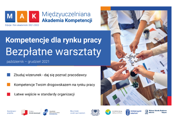 Szukasz pierwszej poważnej pracy i nie wiesz od czego zacząć? Zastanawiasz się co zrobić, by być atrakcyjnym na rynku pracy? Biuro Karier Uniwersytetu Gdańskiego wraz z Pomorską Specjalną Strefą Ekonomiczną i trzema innymi biurami karier pomorskich uczelni zapraszają do udziału w projekcie pt. Międzyuczelniana Akademia Kompetencji (MAK), podczas którego studenci zapoznają się z kompetencjami poszukiwanymi obecnie na rynku pracy.