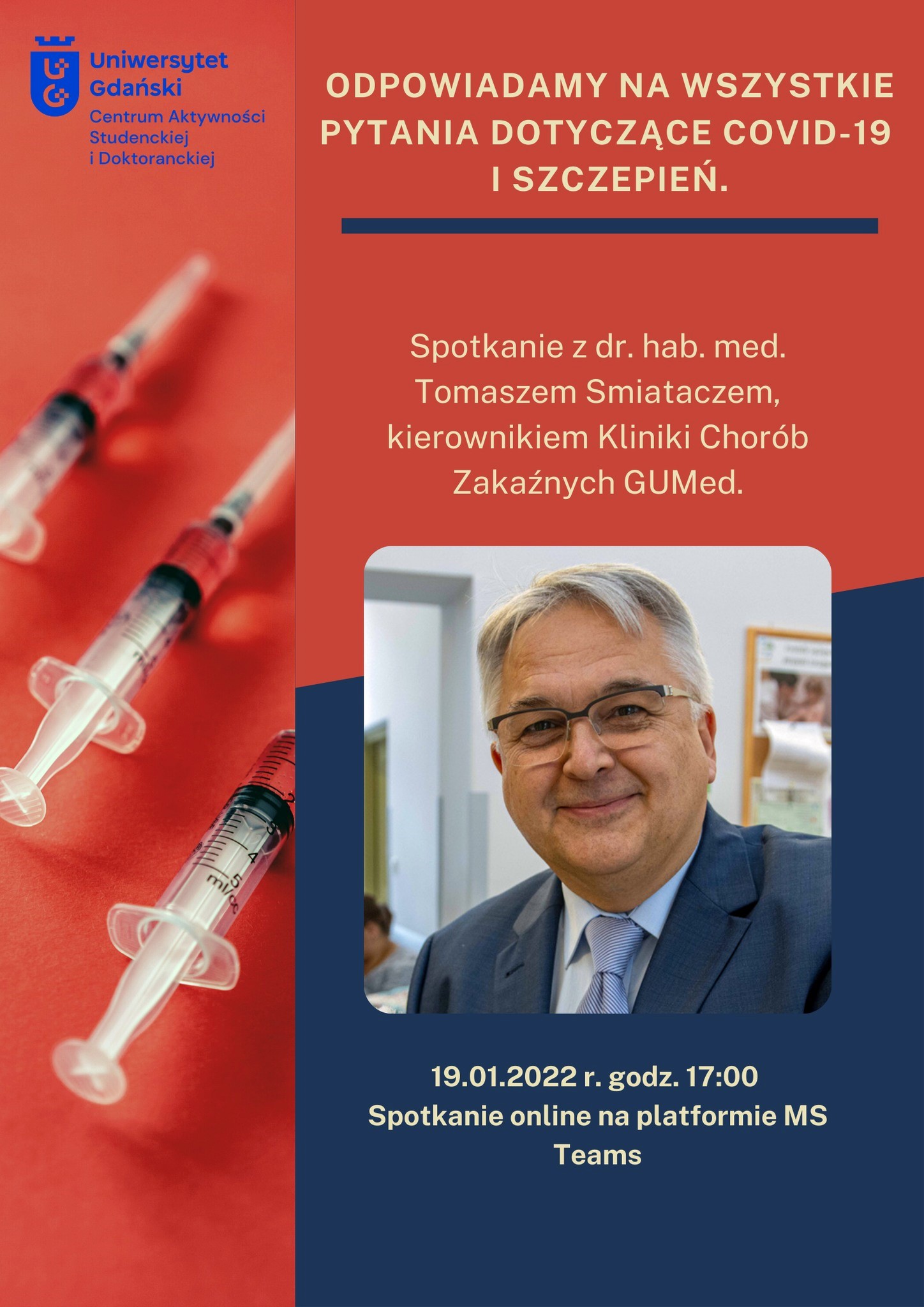 Centrum Aktywności Studenckiej i Doktoranckiej zaprasza 19.01.2021 na spotkanie z dr. hab. n. med. Tomaszem Smiataczem, Prorektorem ds. Studenckich Gdańskiego Uniwersytetu Medycznego oraz Kierownikiem Kliniki Chorób Zakaźnych Gdańskiego Uniwersytetu Medycznego.