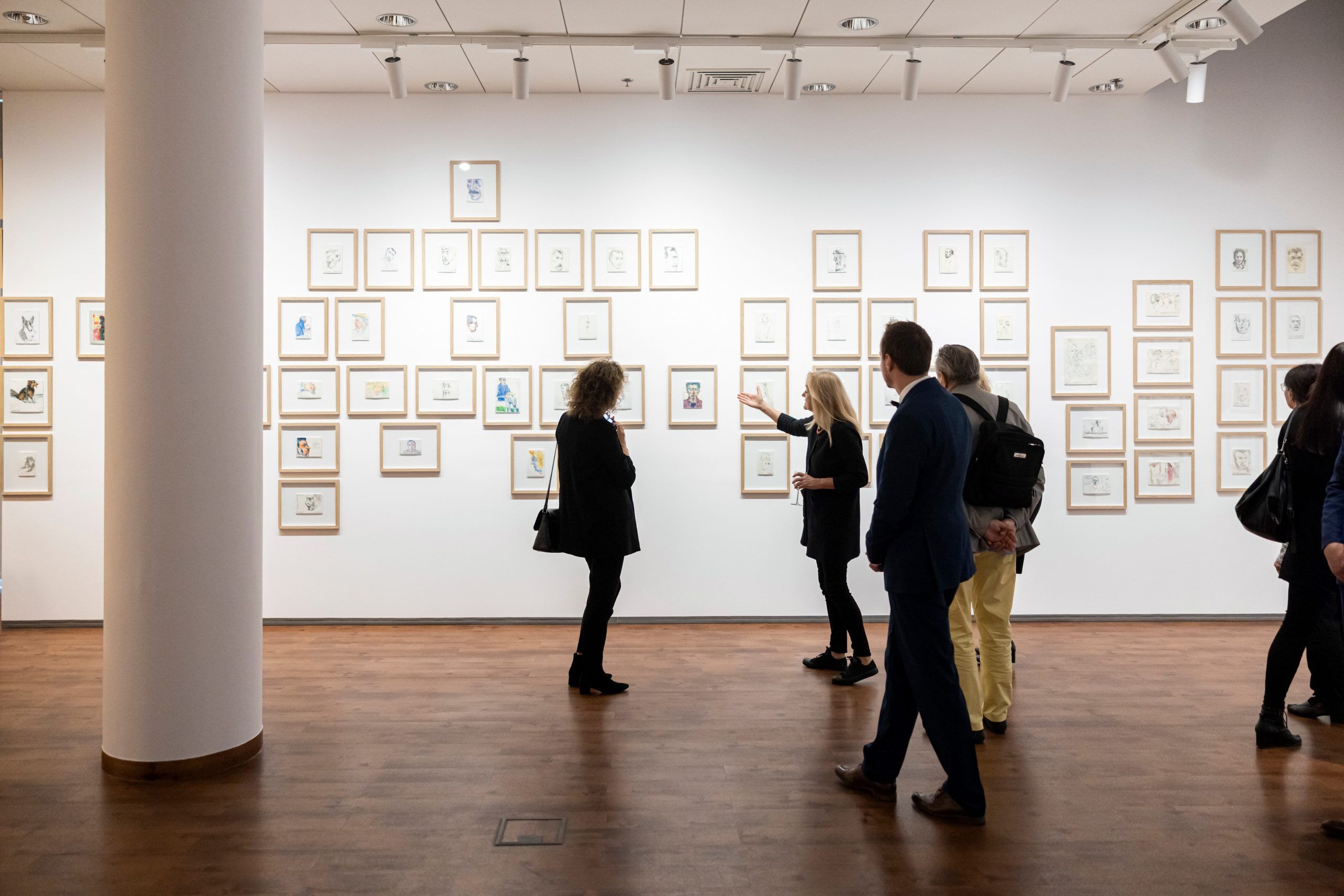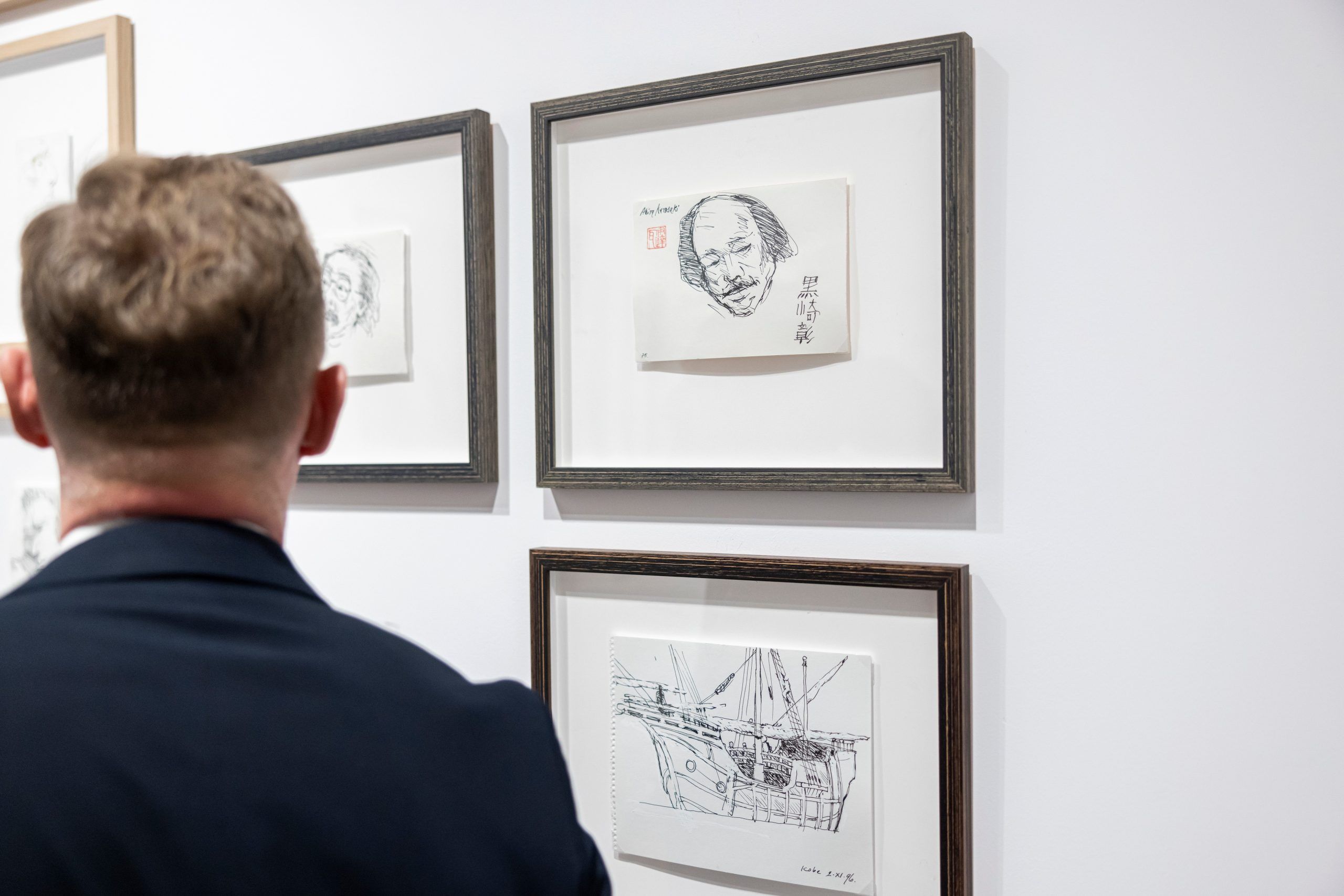 Sporą część wystawy zajęły portrety. Sporządzone często na szybko, przy pomocy kilku zdecydowanych kresek piórem, kredką lub flamastrem, oddając charakterystyczne cechy znanych twarzy ze świata artystycznego lat 80. i 90. Wśród zaprezentowanych na wystawie prac są także zwierzęta i widoki z podróży, w tym wiele obrazów Japonii, jej architektury czy scen z tradycyjnego teatru.