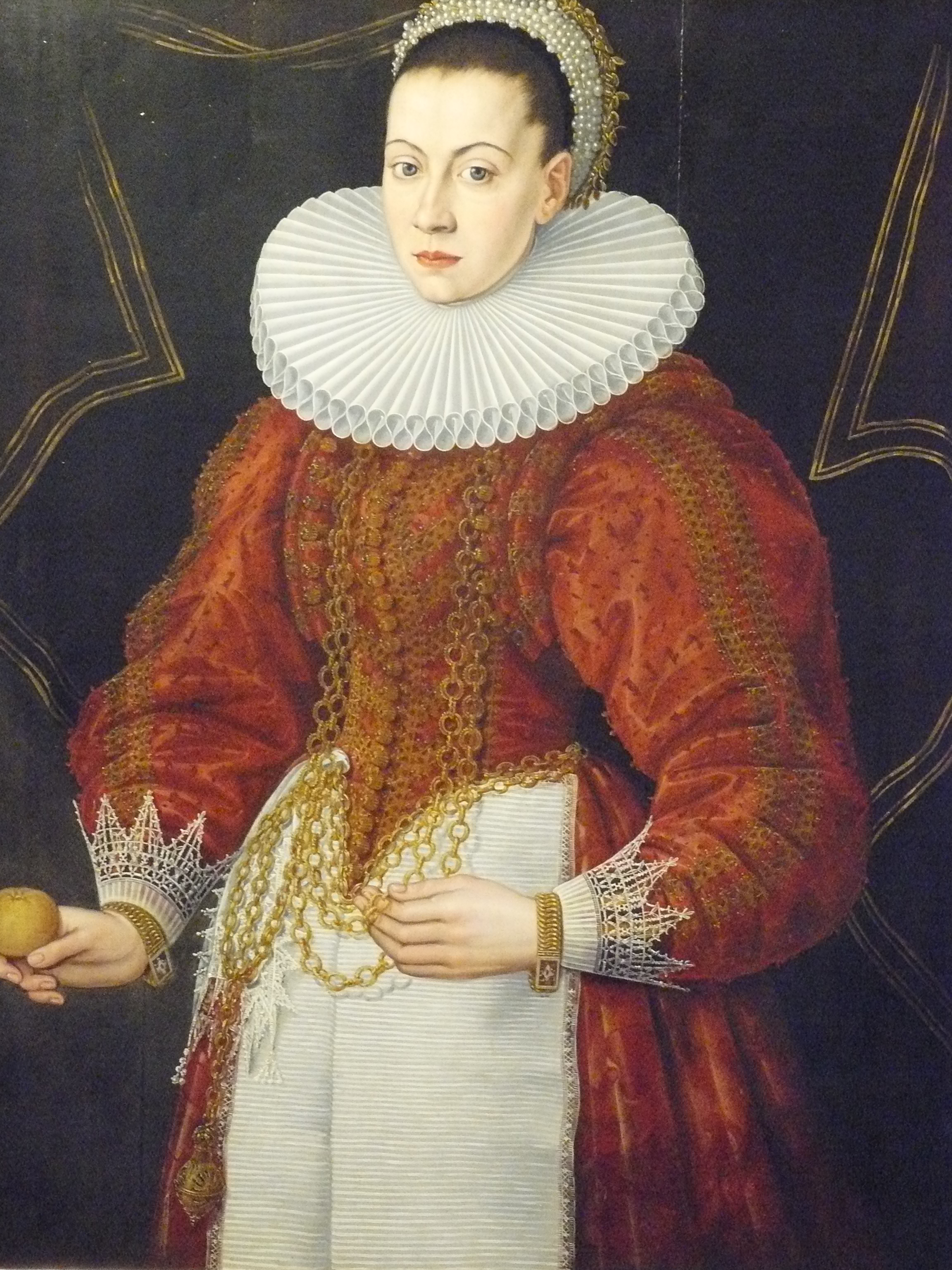 - Ubiory na portretach obywateli Gdańska były strojami codziennymi lub odświętnymi. Znana gdańska patrycjuszka z 1598 roku ukazuje poprzez swój ubiór także swój status majątkowy, poprzez dodatki jak koronkowe mankiety i kryza oraz skromną (jak na młodą osobę) biżuterię: perły i złote cekiny na czepku, złote łańcuchy i bransolety z emaliowanymi wykończeniami przy zapięciu oraz niezwykle wyrafinowane akcesorium pochodzące z kultury orientalnej jakim był pomander – małe okrągłe pudełeczko na perfumowane zioła.