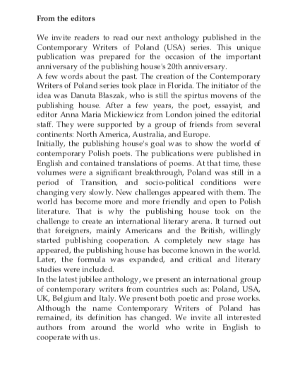 Jak napisały Danuta Błaszak (USA) i Anna Maria Mickiewicz (Wielka Brytania) we wstępie, antologia jest specjalną, jubileuszową edycją ważnej międzynarodowej inicjatywy wydawniczej – zapoczątkowanej 20 lat temu prestiżową serią, rokrocznie promującą współczesnych polskich twórców w języku angielskim.