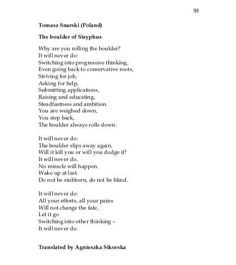 Do współpracy zaproszono 89 autorów, reprezentujących aktywne polskie środowiska literackie, a wśród nich Tomasza Snarskiego z Uniwersytetu Gdańskiego, którego wiersz „Kamień Syzyfa” z tomu „Przezpatrzenia”, wydanego w 2012 i 2014 roku przez Wydawnictwo Uniwersytetu Gdańskiego, ukazał się w tłumaczeniu Agnieszki Sikorskiej na język angielski.