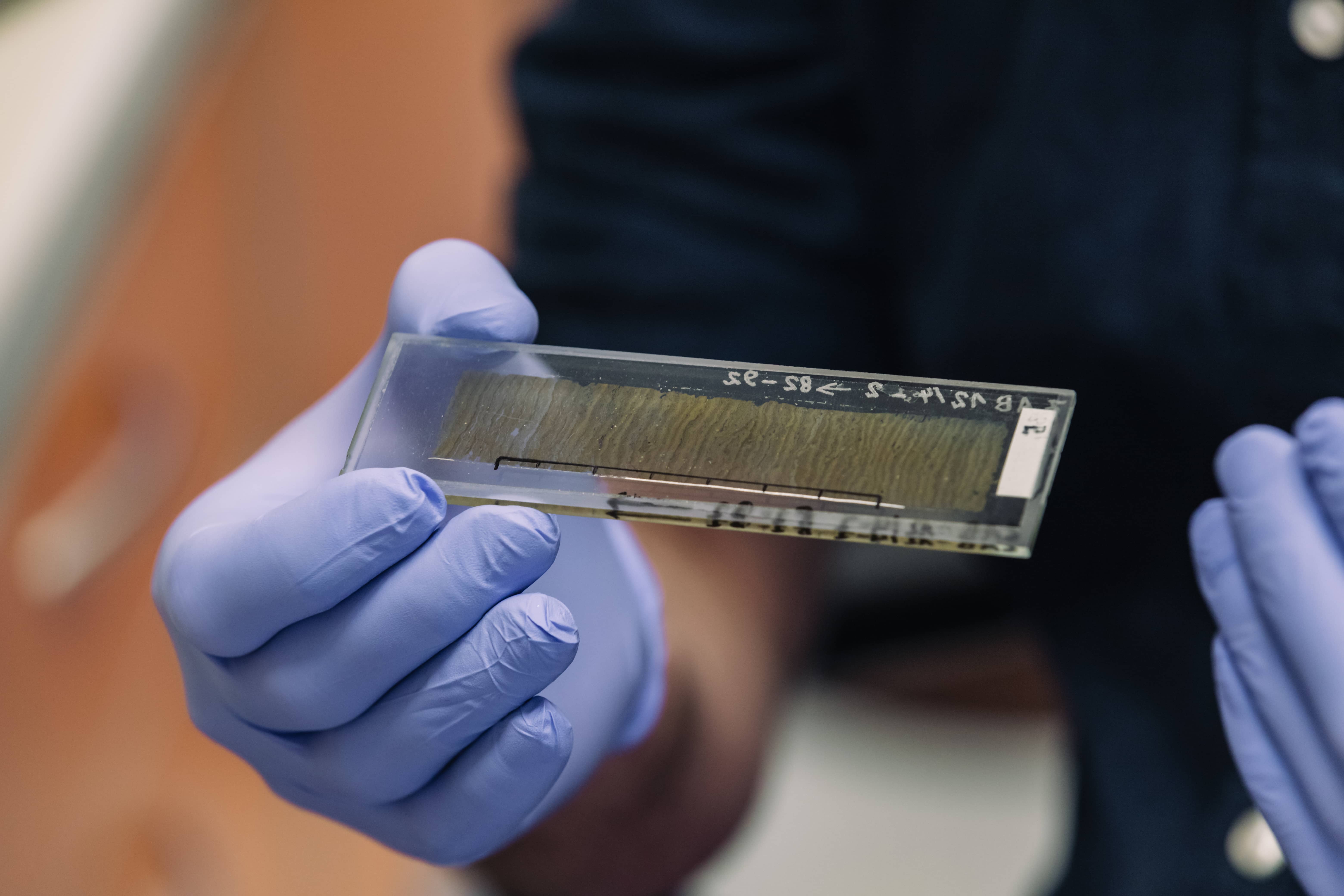 - Przede wszystkim pobrany rdzeń dzielimy wzdłuż na pół. Jedną połowę wykorzystujemy do analiz niedestrukcyjnych, w których uzyskujemy informacje nie tracąc materiału. Drugą połowę dzielimy na potrzeby klasycznych metod destrukcyjnych (np. w przypadku osadów warwowych zawsze robimy tak zwane cienkie szlify, wyciągamy monolity, by móc zrobić trwały preparat mikroskopowy, gdzie zachowana jest struktura osadów). Część osadu opróbowujemy, z czego wychodzą nam tak podstawowe rzeczy jak gęstość osadu. Kolejną część suszymy, jeszcze inna część trafia na analizy związane z okrzemkami, innymi grupami planktonu i pyłkiem. Tak jak mówiłem, wszystko to nas o czymś informuje.