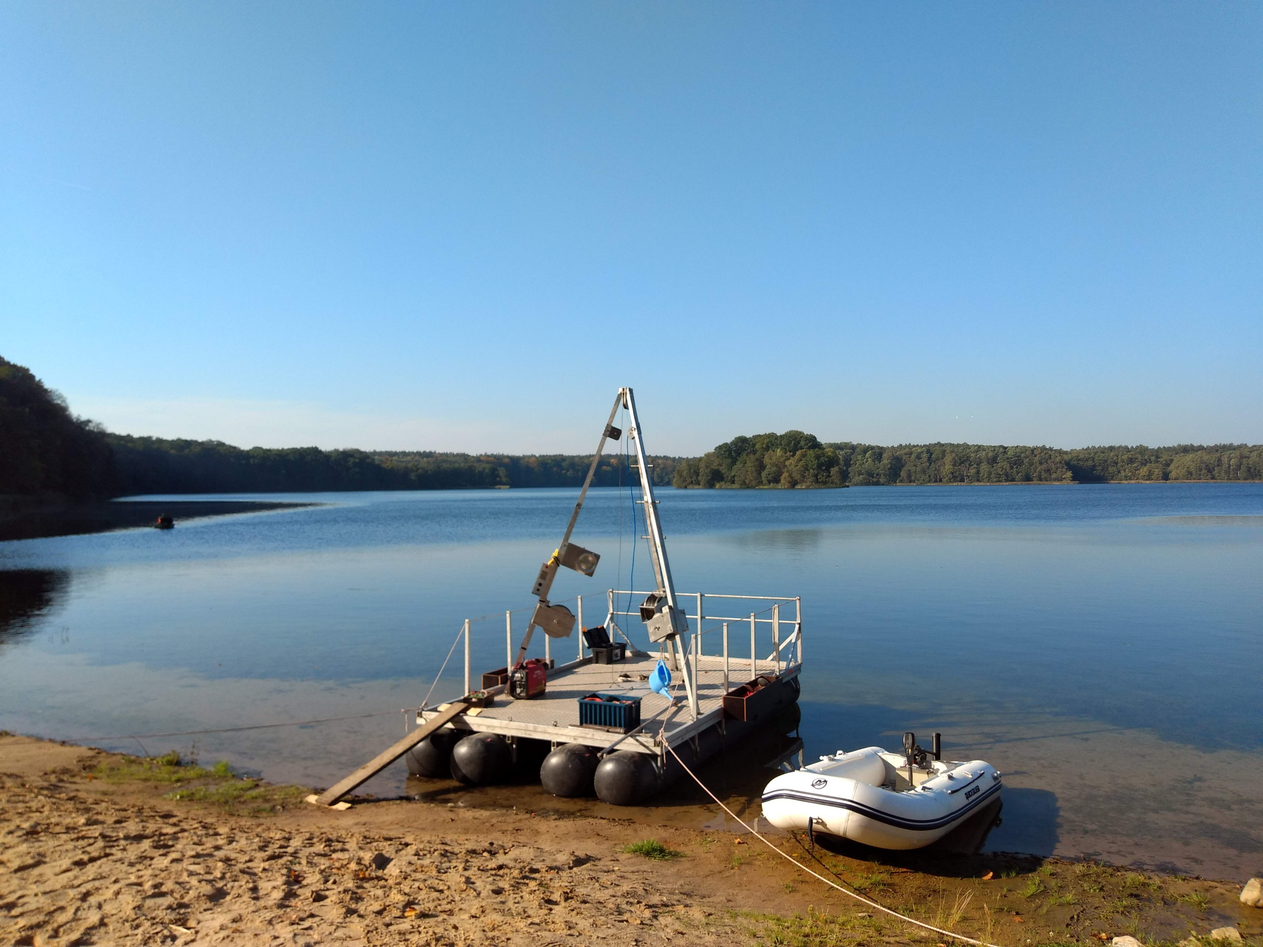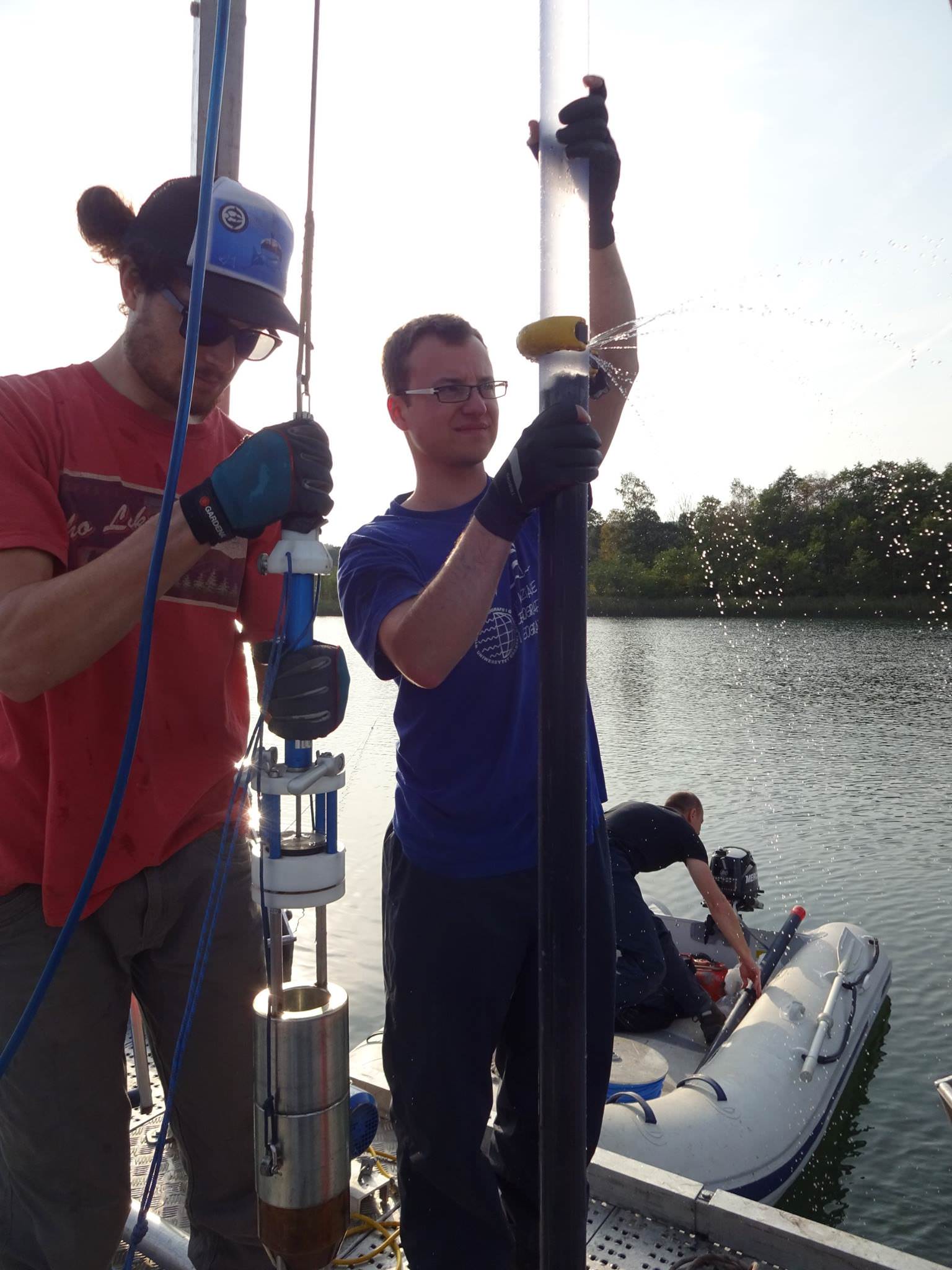 - Ładujemy się we dwie do czterech osób na jeden lub dwa pontony, wypływamy na środek jeziora i działamy. Do próbnika, takiej obejmy z metalu i teflonu, wkłada się rurę i spuszcza ją na linach na samo dno, gdzie rura wbija się w osad. Pobrany w ten sposób materiał wyciągany jest przez nas ręcznie i bardzo ostrożnie. Staramy się przy tym trzymać próbnik pionowo, by nie zaburzyć powierzchni woda-osad. Przy trzymetrowym rdzeniu to całkiem trudne, zwłaszcza jak wieje wiatr – zależnie od materiału i długości taki próbnik z pobranym osadem może ważyć nawet kilkadziesiąt kg. Do wydobycia dłuższych rdzeni niezbędna jest specjalna platforma. Taki sprzęt wypożyczamy.