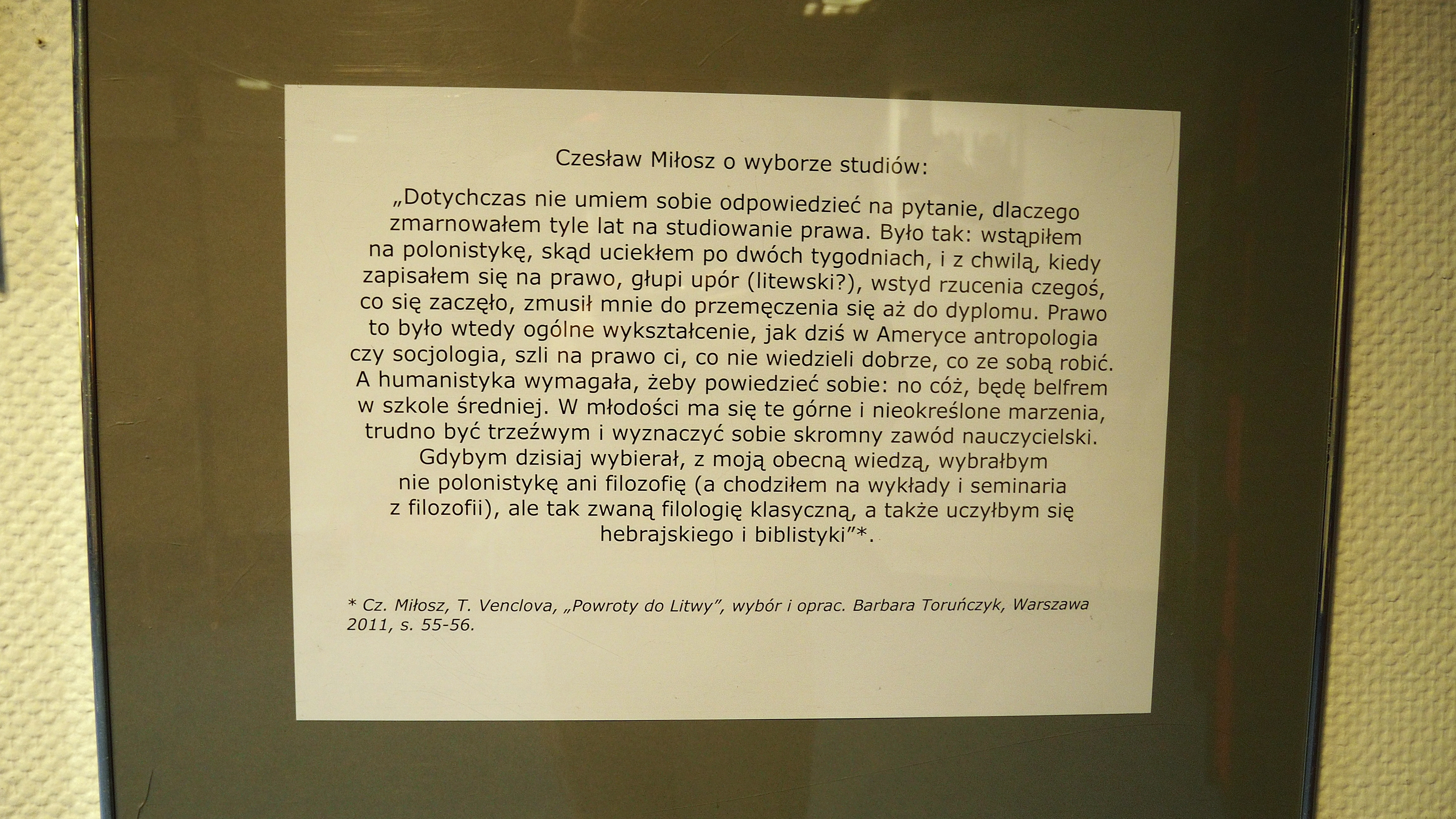 - Dotychczas nie umiem sobie odpowiedzieć na pytanie, dlaczego zmarnowałem tyle lat na studiowanie prawa (...) Szli na prawo ci, co nie wiedzieli dobrze, co ze sobą robić - powiedział Czesław Miłosz w rozmowie z Tomasem Venclovą.