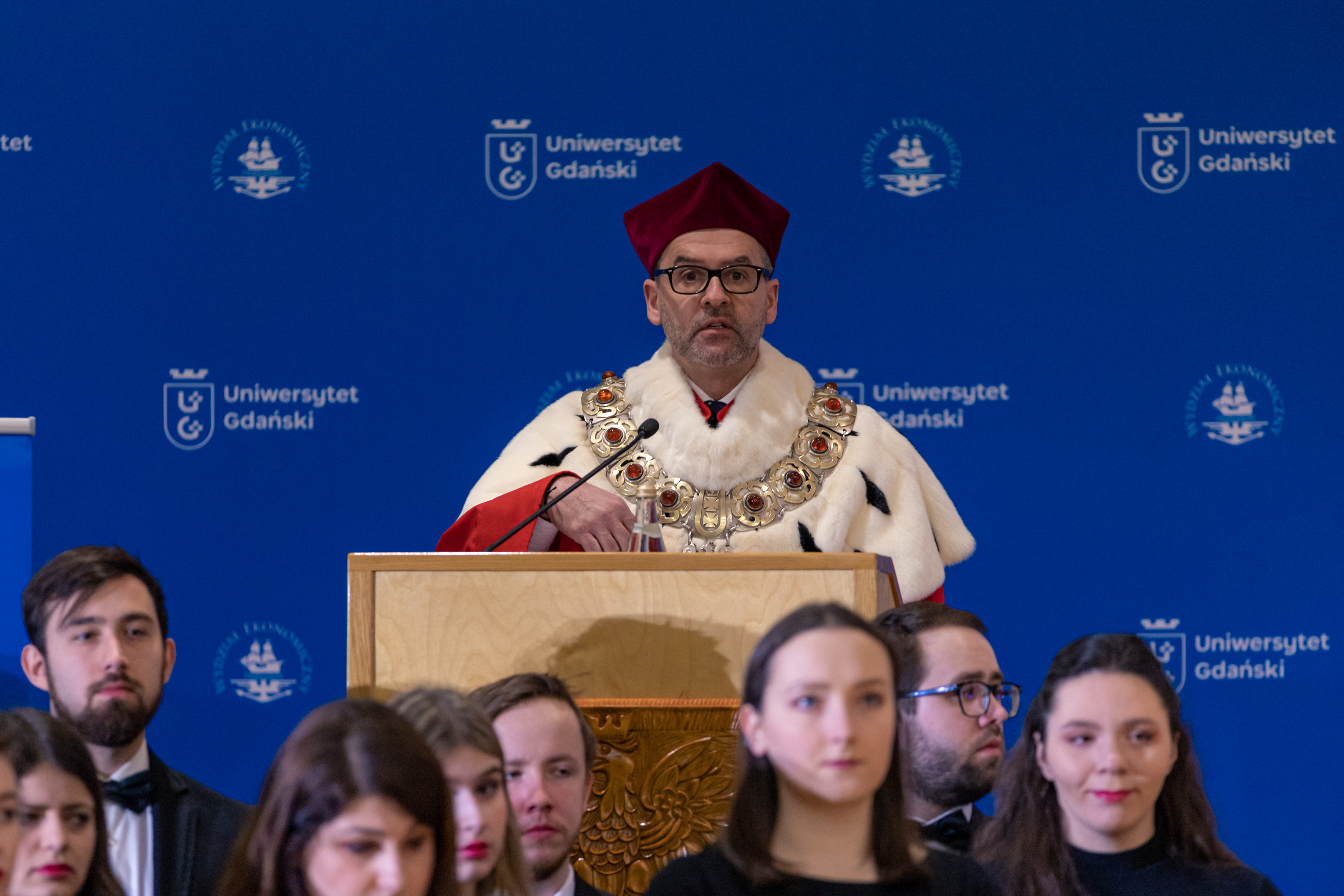 W dalszej części uroczystości głos zabrała Dziekan prof. Monika Bąk z Wydziału Ekonomicznego, która serdecznie powitała wszystkich w progach wydziału i przedstawiła krótko jego historię, sięgając korzeni, czyli czasów II wojny św., kiedy w 1942 r. utworzono konspiracyjny Instytut Morski przy tajnym Uniwersytecie Ziem Zachodnich. Następnie przedstawiła osiągnięcia Wydziału na tle sylwetek doktorów honoris causa UG z obszaru ekonomii.