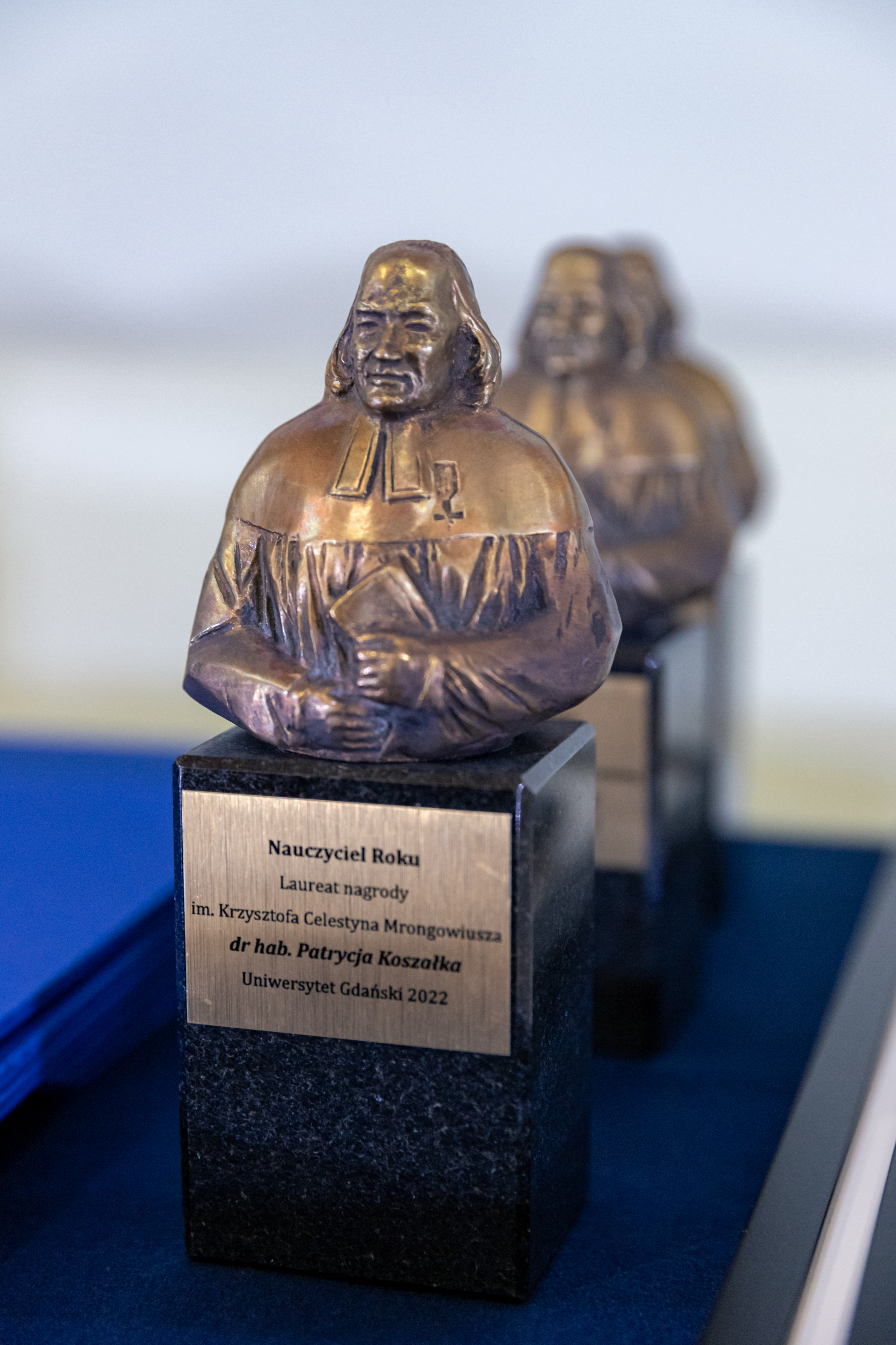 Prorektor ds. studentów i jakości kształcenia, prof. Arnold Kłonczyński i Prorektor ds. innowacji i współpracy z otoczeniem społeczno-gospodarczym, prof. Krzysztof Bielawski wręczyli nagrody i wyróżnienia laureatom Nagrody Nauczyciel Roku im. Krzysztofa Celestyna Mrongowiusza. Nagrodę otrzymali: dr Paula Gorszczyńska z Wydziału Filologicznego, dr Krzysztof Piekarski z Wydziału Nauk Społecznych oraz dr hab. Patrycja Koszałka z Międzyuczelnianego Wydziału Biotechnologii UG i GUMed. Wyróżnienia otrzymali zaś: dr Jan Patok z Centrum Wychowania Fizycznego i Sportu, dr Joanna Gondek z Wydziału Matematyki, Fizyki i Informatyki oraz dr hab. Mariusz Bogusz, prof. UG z Wydziału Prawa i Administracji.