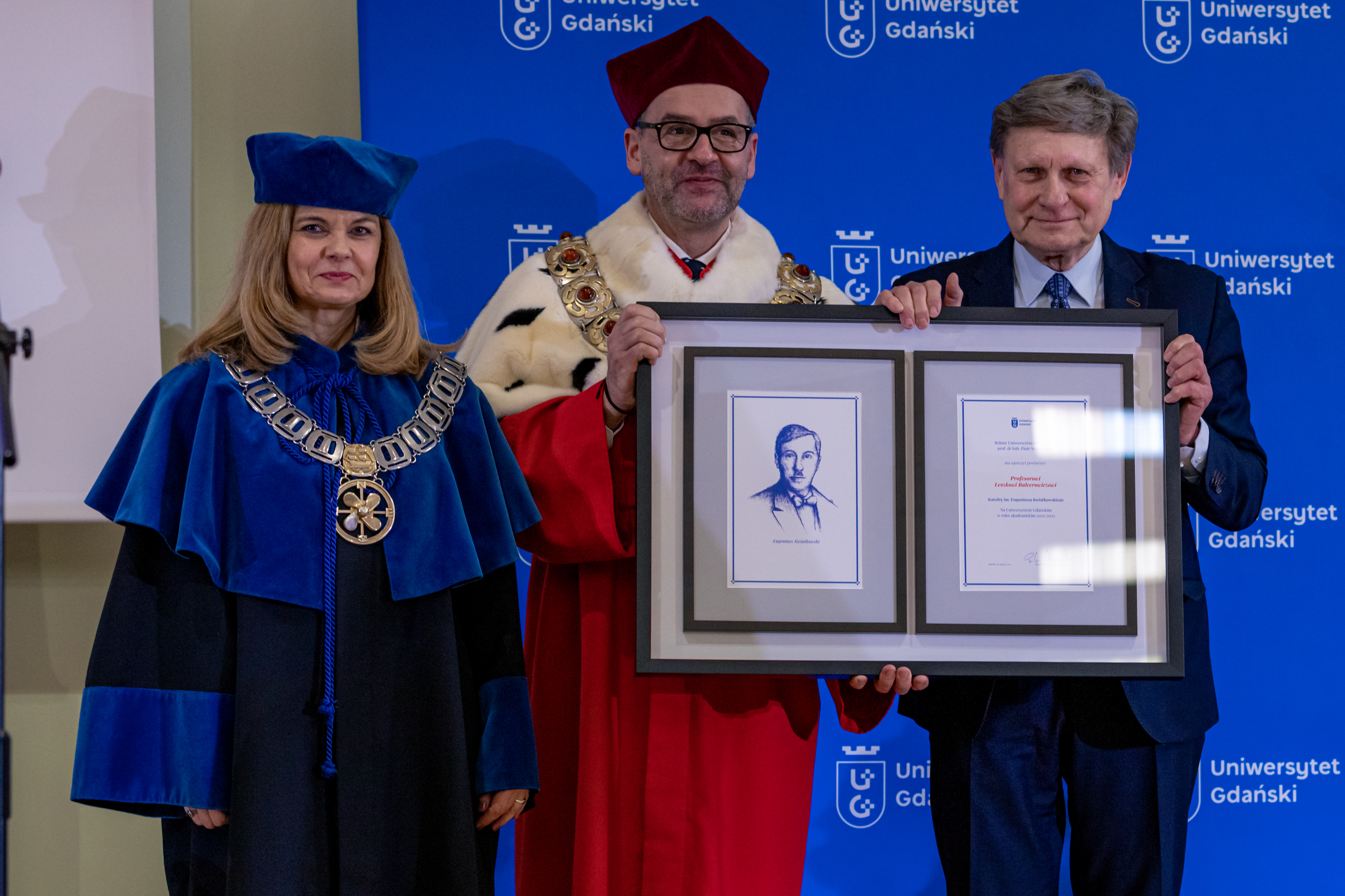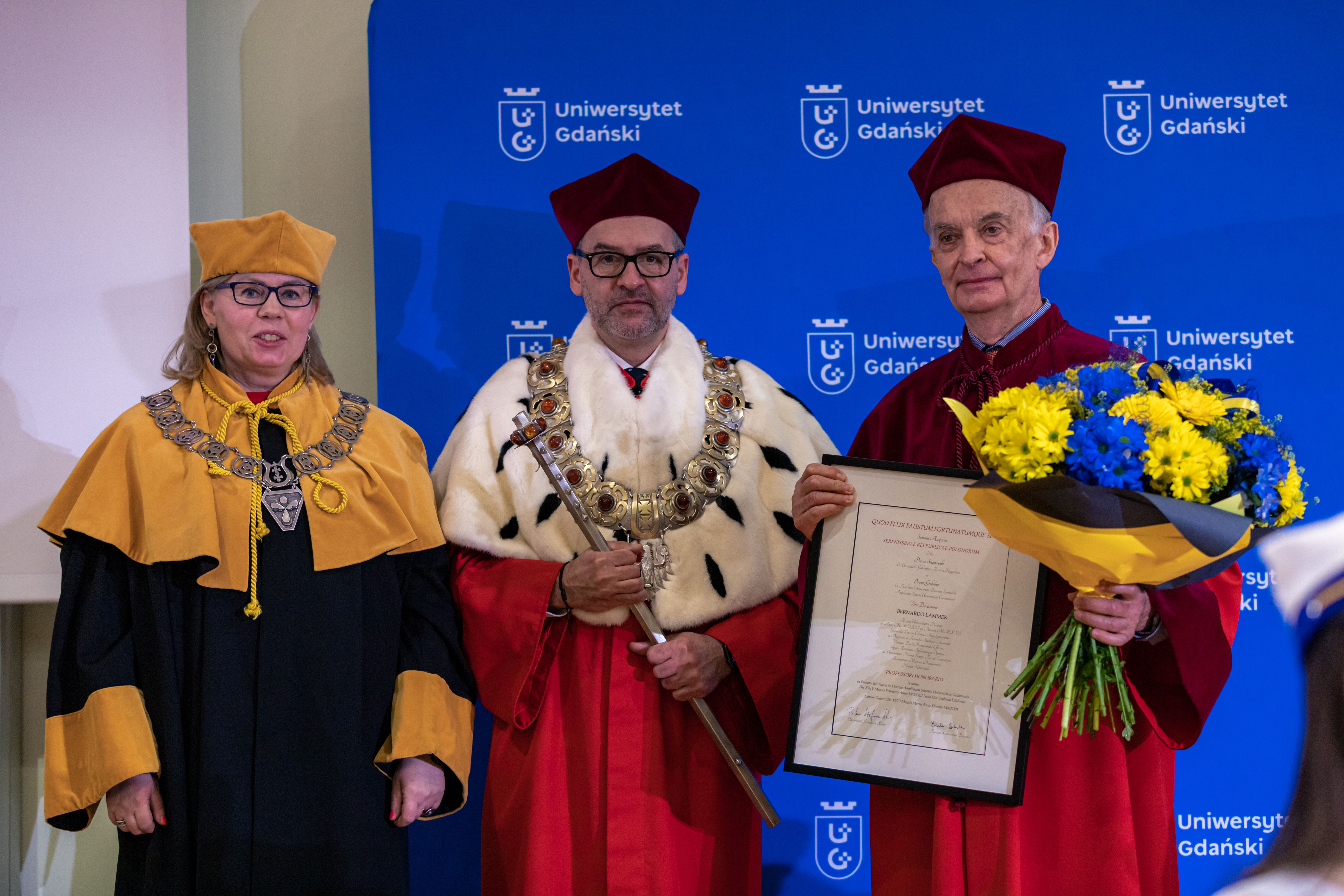 Przedostatnim punktem programu było uroczyste objęcie katedry im. Eugeniusza Kwiatkowskiego przez prof. Leszka Balcerowicza. - Na Uniwersytecie Gdańskim patronami katedr są nasi wybitni doktorzy honorowi, których pamięć chcemy szczególnie kultywować ze względu na ich nieprzemijający wkład w rozwój naszego ośrodka akademickiego. Dziś inicjujemy ten piękny akademicki zwyczaj w naszym Uniwersytecie powierzając pierwszą z trzech imiennych katedr, Katedrę im. Eugeniusza Kwiatkowskiego na rok akademicki 2022/23 Panu Profesorowi Leszkowi Balcerowiczowi – powiedział Rektor UG.