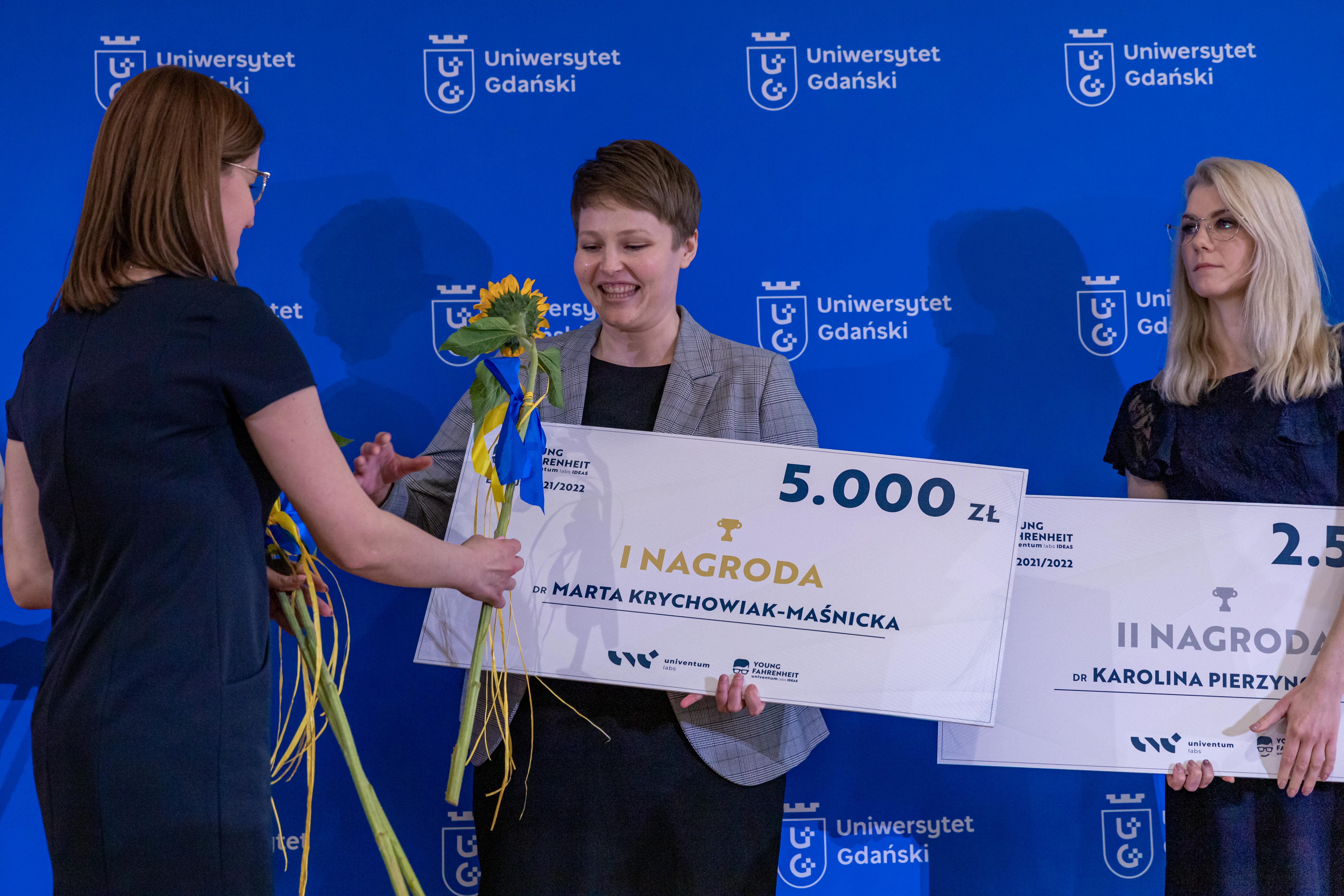 Następnie dr Magdalena Markiewicz poprosiła o zabranie głosu dr. hab. Wojciecha Bizona, prof. UG, prezesa zarządu spółki celowej Uniwersytetu Gdańskiego Univentum Labs, który poprowadził część dotyczącą wręczenia nagród laureatom I edycji konkursu dla młodych naukowców Young Fahrenheit. Nagrodę z rąk Rektora odebrali: dr Marta Krychowiak-Maśnicka z Międzyuczelnianego Wydziału Biotechnologii UG i GUMed, dr Karolina Pierzynowska z Wydziału Biologii oraz mgr Mateusz Baluk, doktorant w Katedrze Technologii Środowiska Wydziału Chemii.