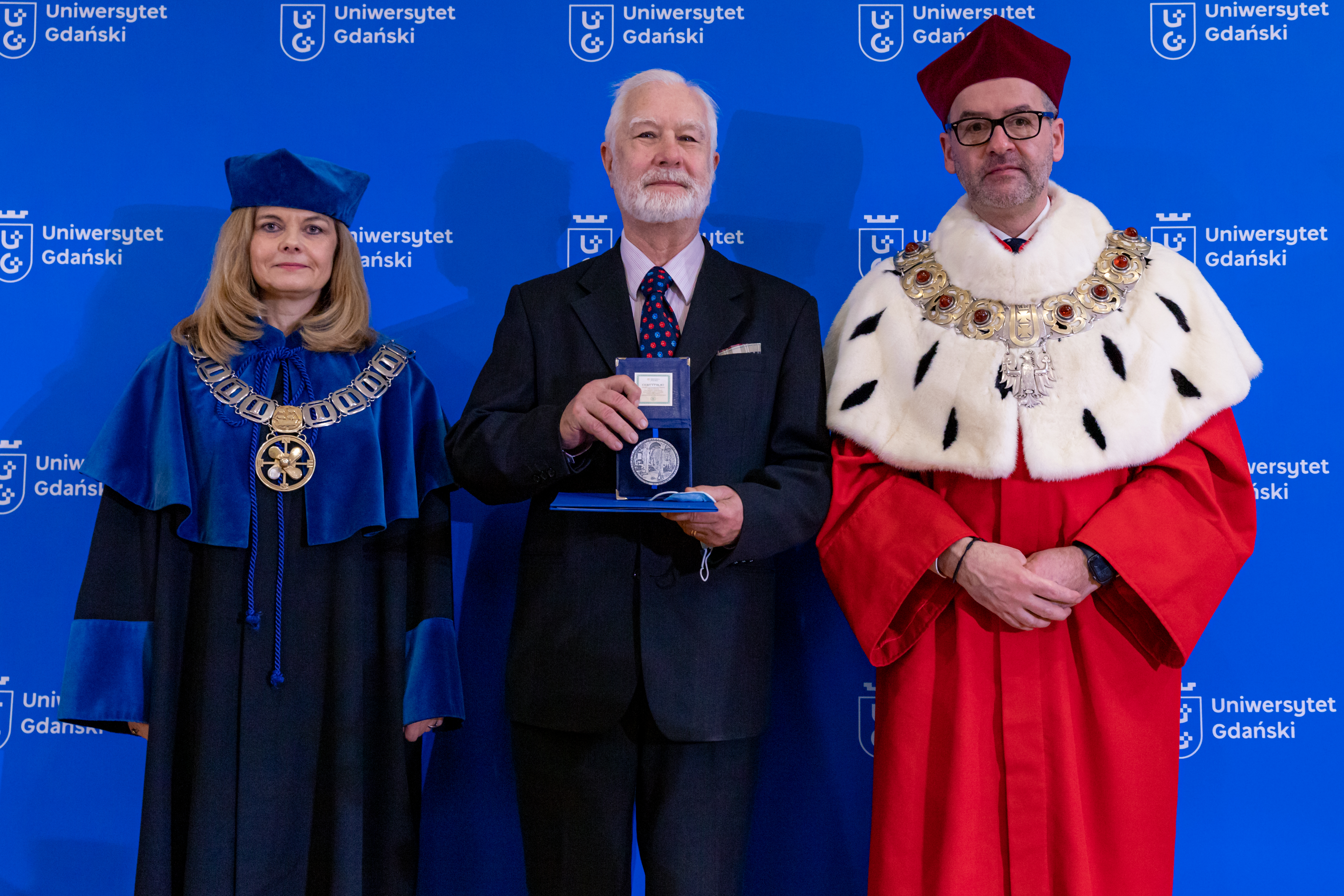 Dr hab. Monika Bąk, prof. UG oraz prof. dr hab. Piotr Stepnowski dokonali, w dalszej części uroczystości, wręczenia Srebrnych Medali UG, które - za długoletnią i pełną zaangażowania działalność na rzecz rozwoju Uniwersytetu Gdańskiego, otrzymali: wieloletni pracownik UG - dr hab. Witold Toczyski oraz Jacek Tymiński, Prezes Vetro Port & Shipping Services.