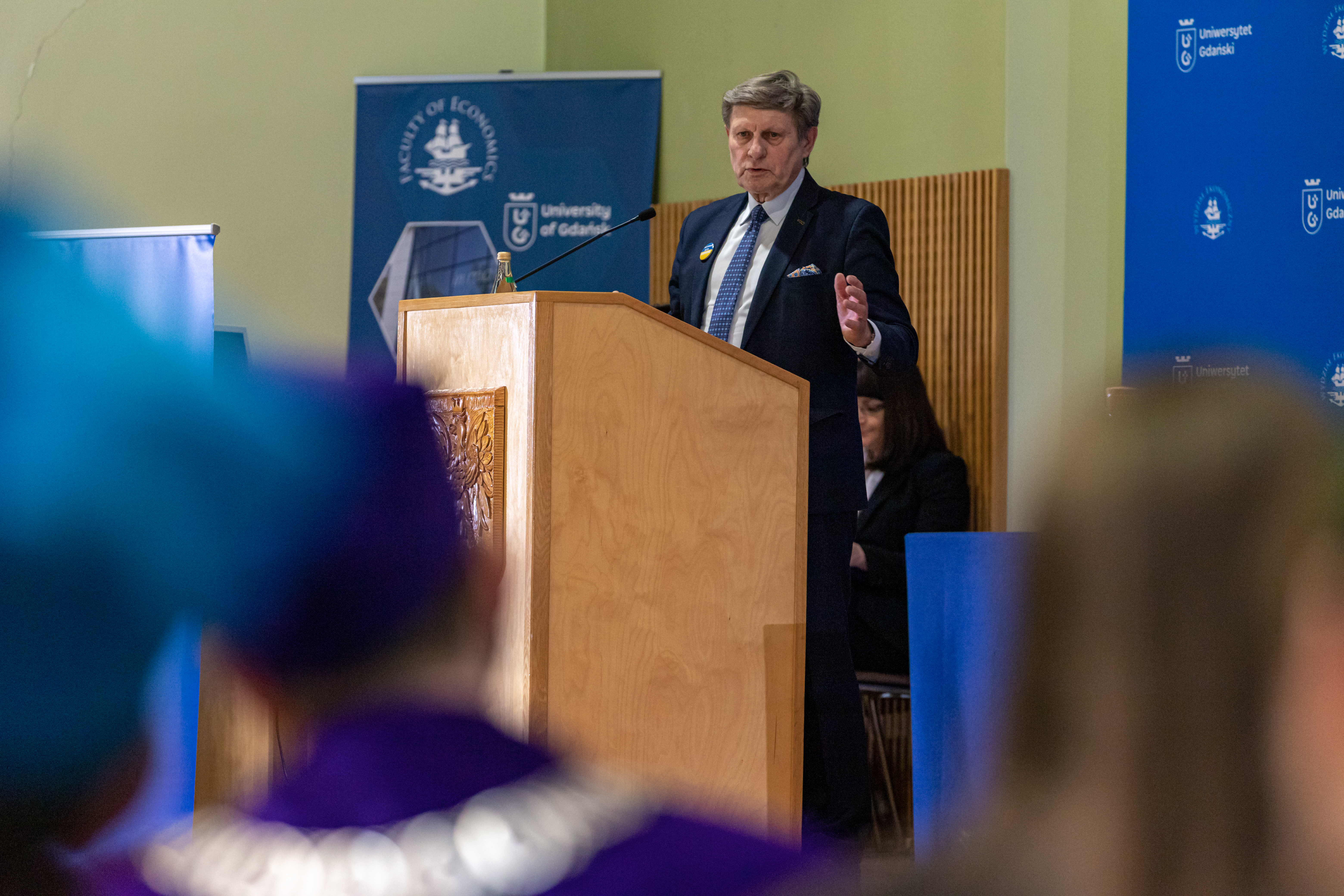 Prof. Leszek Balcerowicz, który jest doktorem honoris causa UG, podziękował Rektorowi i społeczności UG za uznanie i zaufanie, a następnie wygłosił przemówienie podkreślając m.in., że: - To ustrój decyduje, czy państwo wszczyna wojnę i jak żyje społeczeństwo w czasach pokoju.