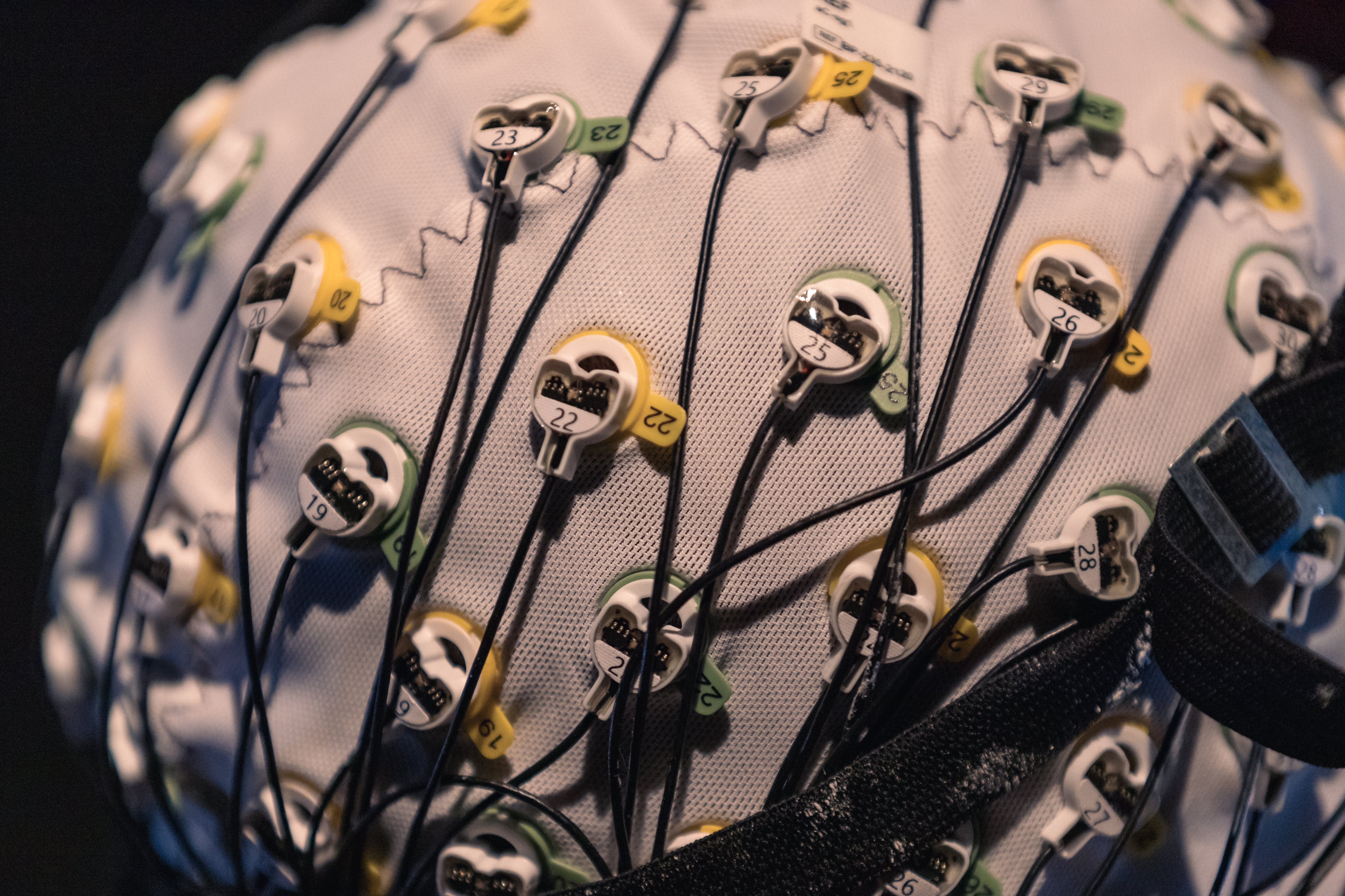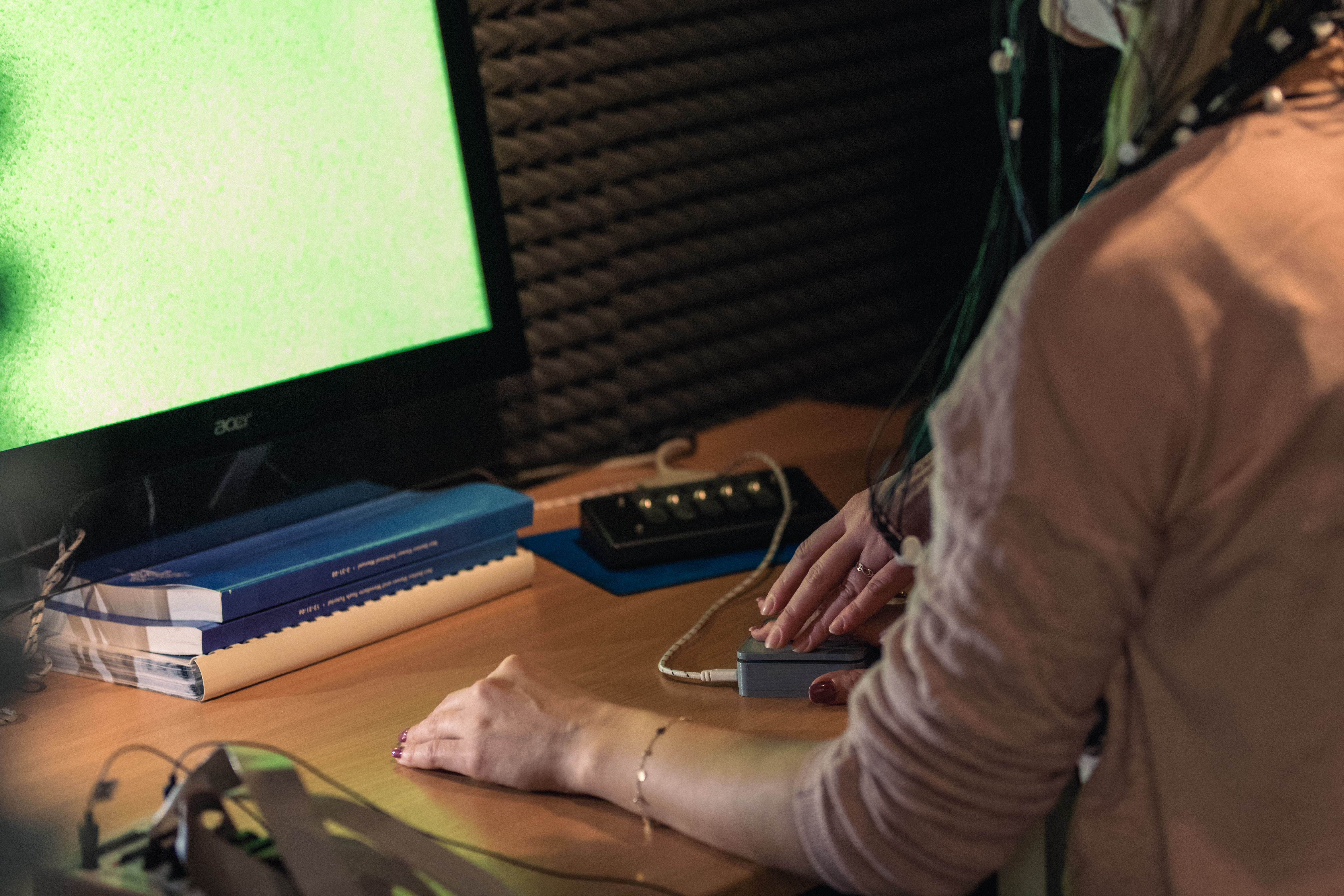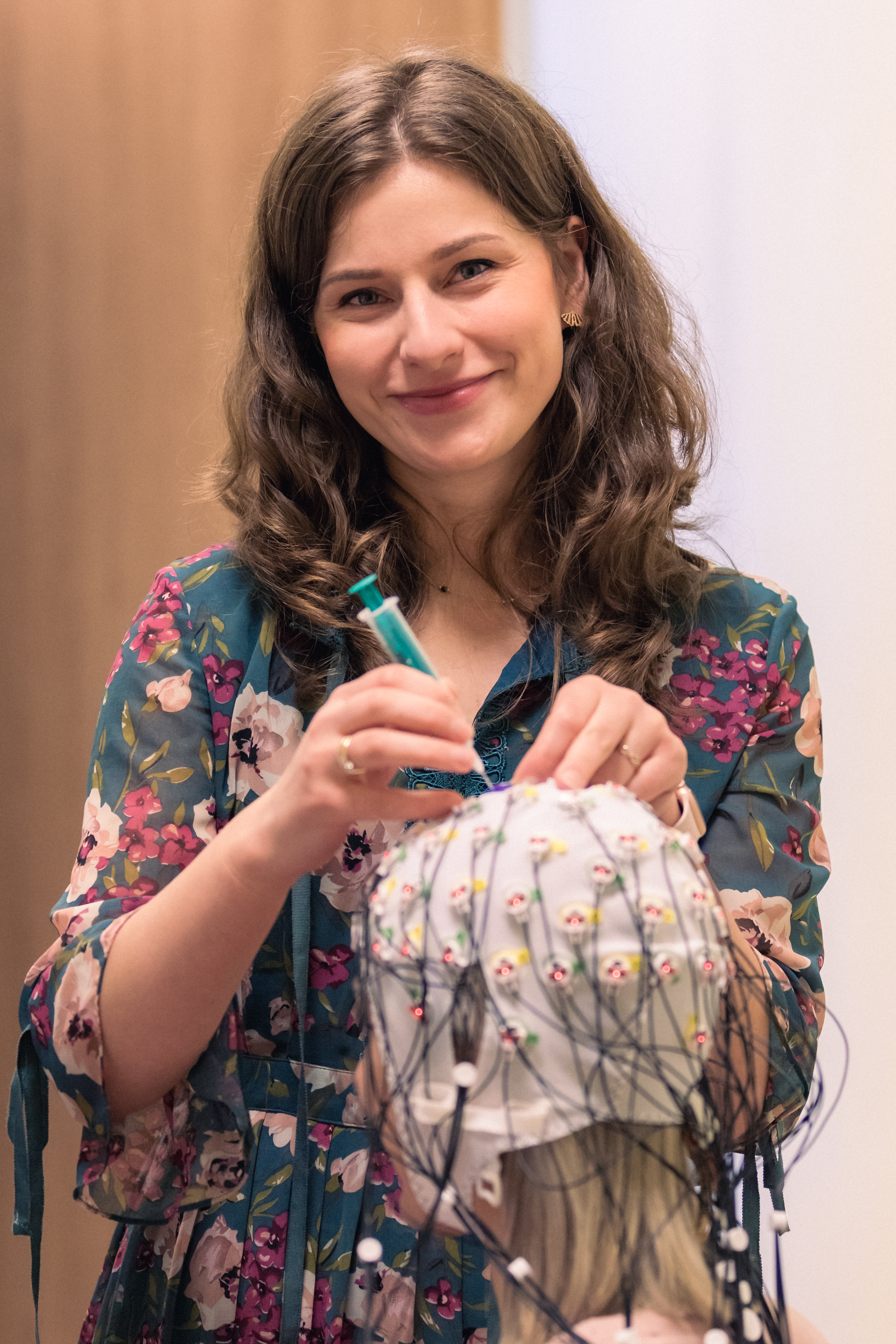 Podczas całego badania pacjenci mają na głowie czepek EEG. Warto dodać, że to badanie zupełnie bezinwazyjne, które mierzy aktywność elektryczną kory mózgowej, dzięki czemu, na żywo, z bardzo dobrą rozdzielczością czasową możemy stwierdzić czy sieci neuronalne, które są z punktu widzenia moich badań ważne, uległy oczekiwanemu wzbudzeniu podczas oglądania prezentowanych na ekranie zdjęć.