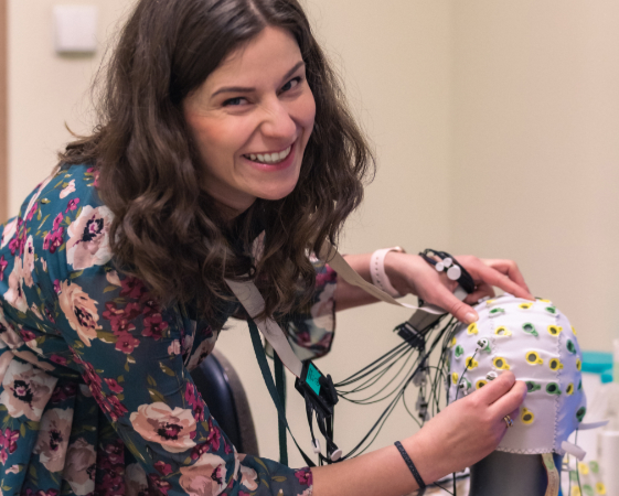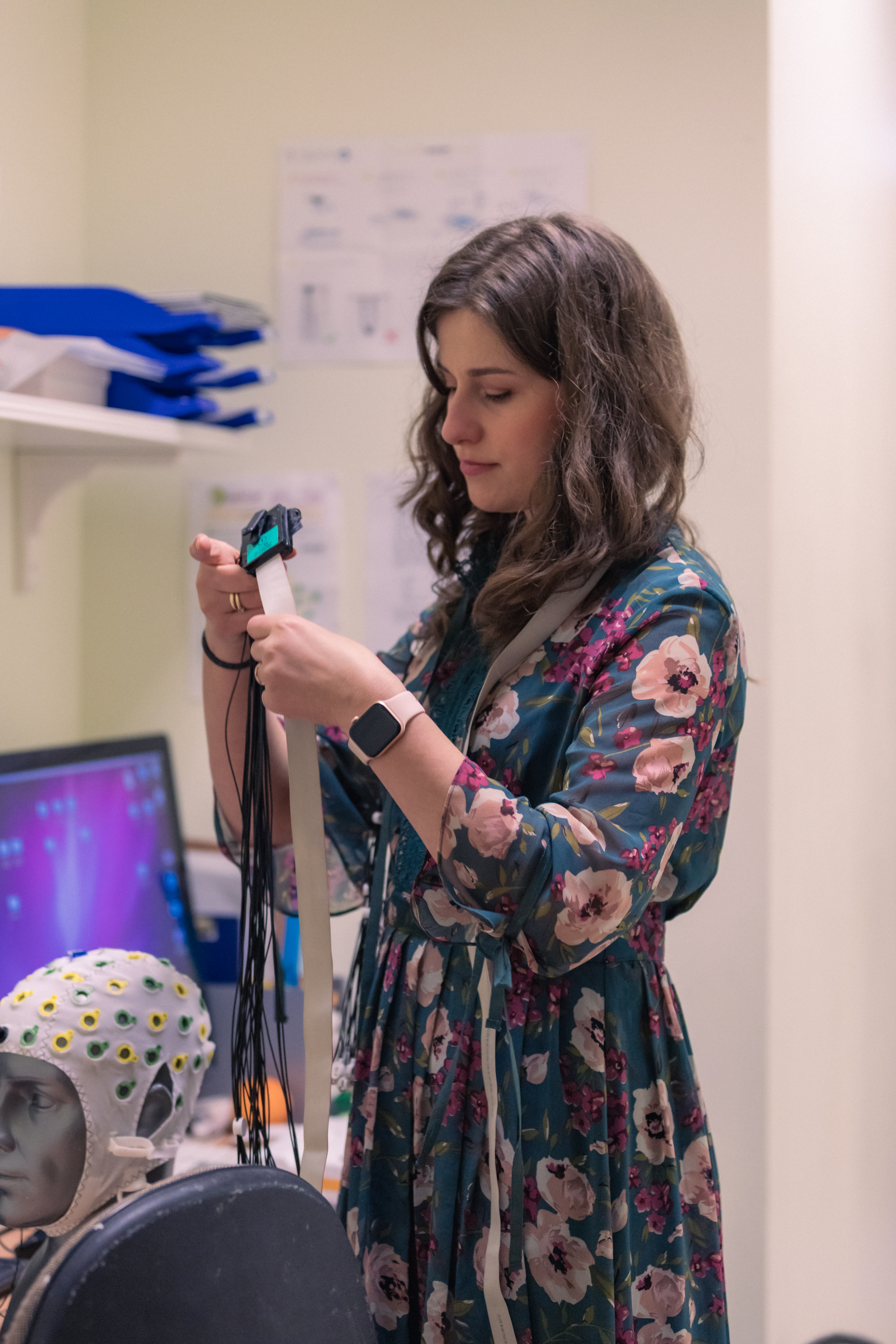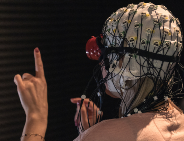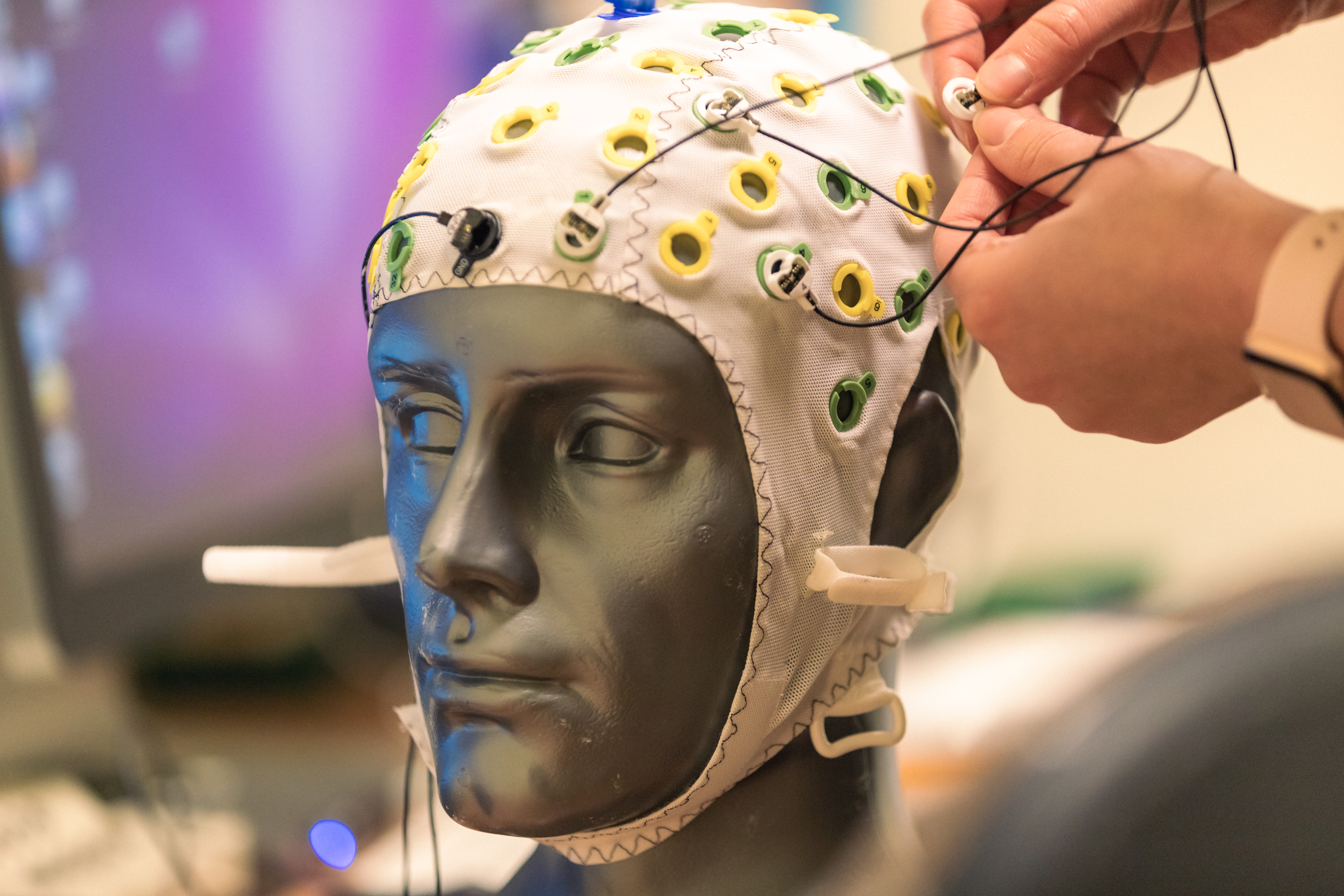 Podczas całego badania pacjenci mają na głowie czepek EEG. Warto dodać, że to badanie zupełnie bezinwazyjne, które mierzy aktywność elektryczną kory mózgowej, dzięki czemu, na żywo, z bardzo dobrą rozdzielczością czasową możemy stwierdzić czy sieci neuronalne, które są z punktu widzenia moich badań ważne, uległy oczekiwanemu wzbudzeniu podczas oglądania prezentowanych na ekranie zdjęć.