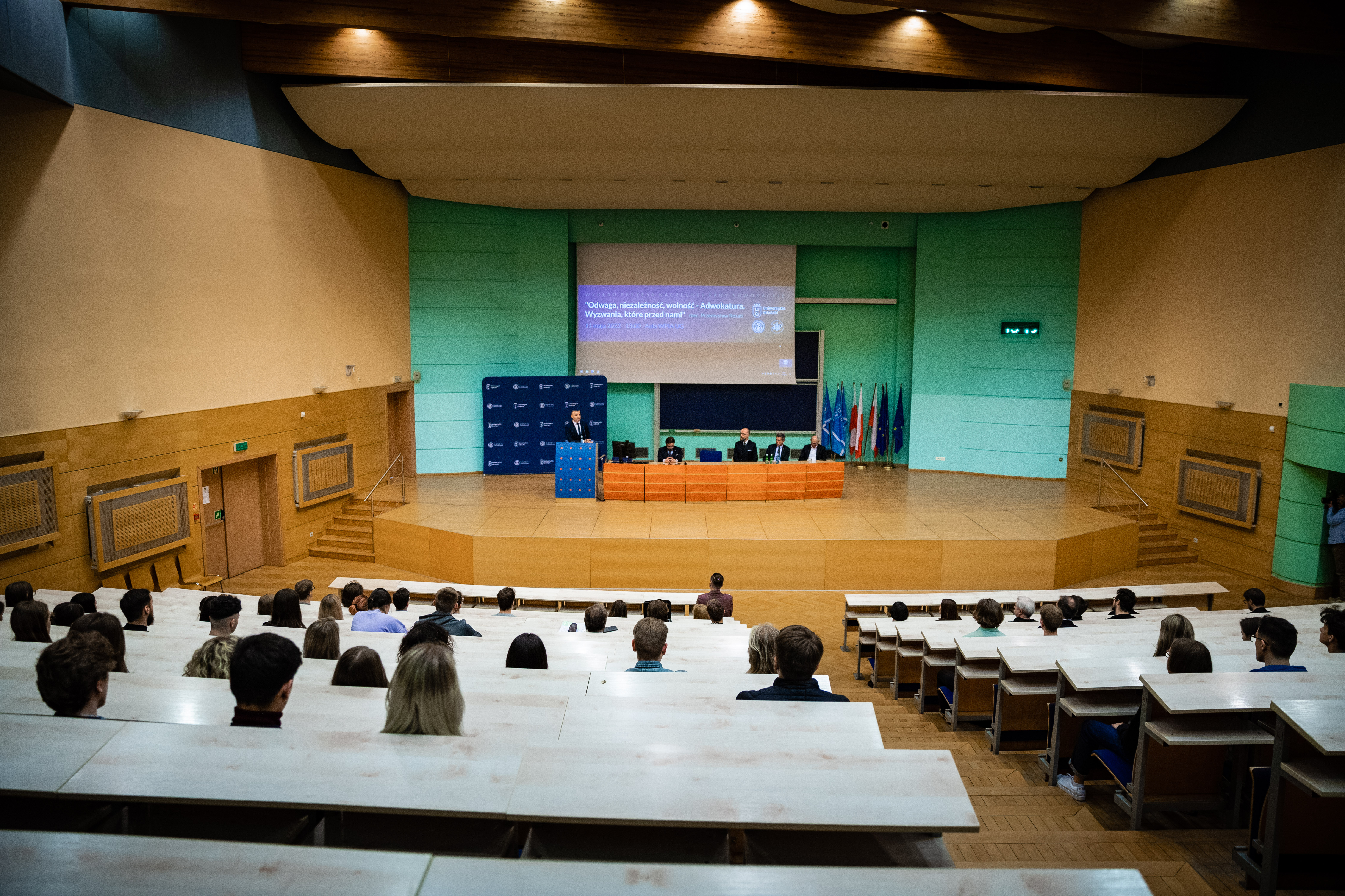 Po podpisaniu umowy adw. Przemysław Rosati wygłosił wykład w auli WPiA pt. “Odwaga, niezależność, wolność - Adwokatura. Wyzwania, które przed nami”. - Dzisiaj cały Wydział Prawa i Administracji jest zielony, bo to właśnie są kolory adwokatury - wprowadził prelegenta prof. Wojciech Zalewski. Prezes Przemysław Rosati przedstawił słuchaczom pięć wyzwań, które według niego stoją przed obecnymi i przyszłymi adwokatami - podstawowe powinności aplikanta adwokackiego i adwokata, informatyzacja, odważne upominanie się o poszanowanie praw i wolności obywatelskich, zaangażowanie w sprawę publiczną oraz zachowanie zdolności adwokatury do bycia czujnym, uważnym i gotowym do niezwłocznej reakcji kiedy naruszane są prawa obywatelskie.