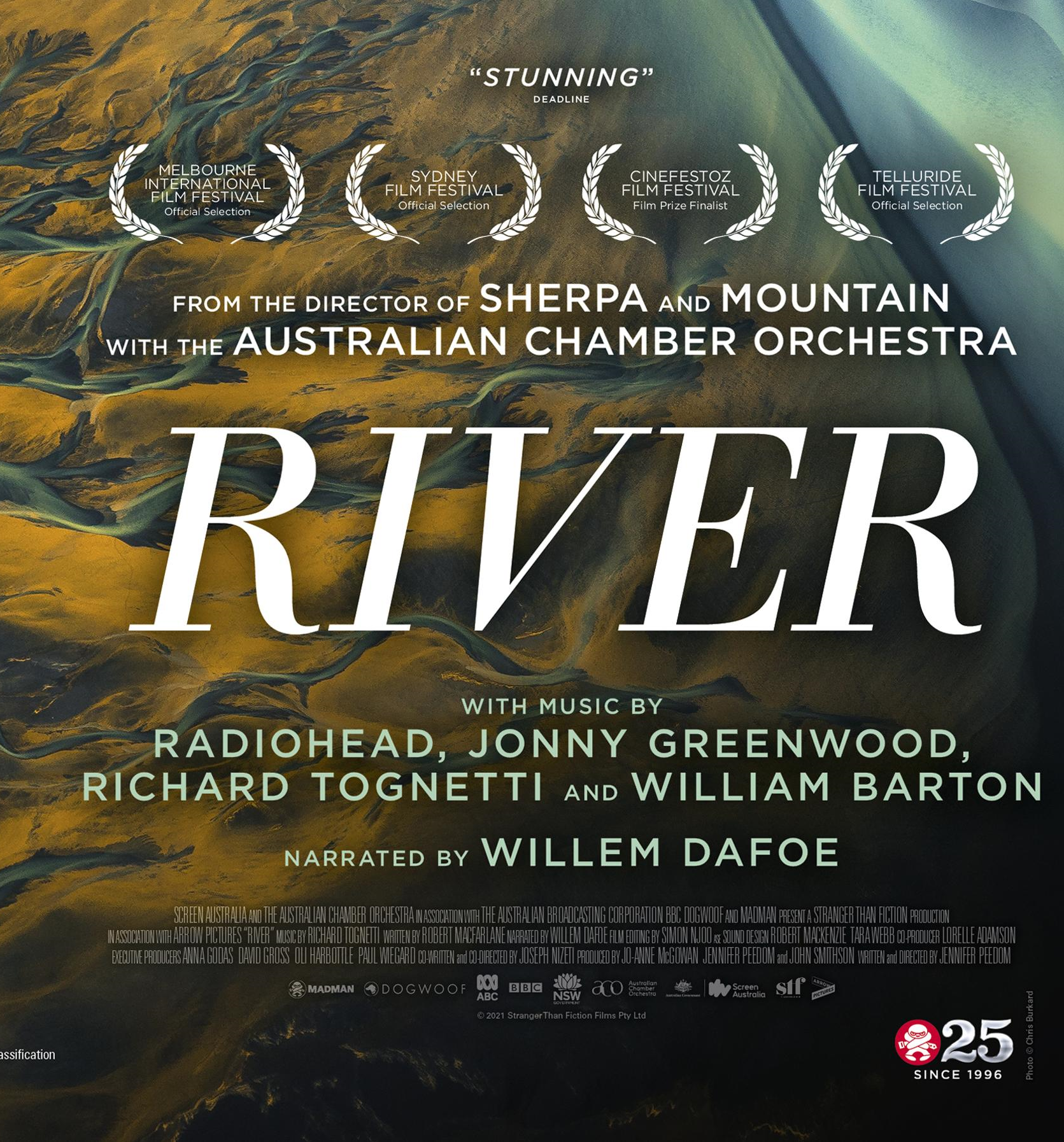 Film dokumentalny “Rzeka” opowiada o relacji ludzi z rzekami. Od czasów starożytnych, kiedy niewielkie strumienie były życiodajnym centrum osady po współczesność, kiedy tor i wielkość rzeki podlega nowym technologiom. Oprawę muzyczną filmu przygotował m.in. zespół Radiohead, a narrację do obrazu zapewnił Willem Defoe.