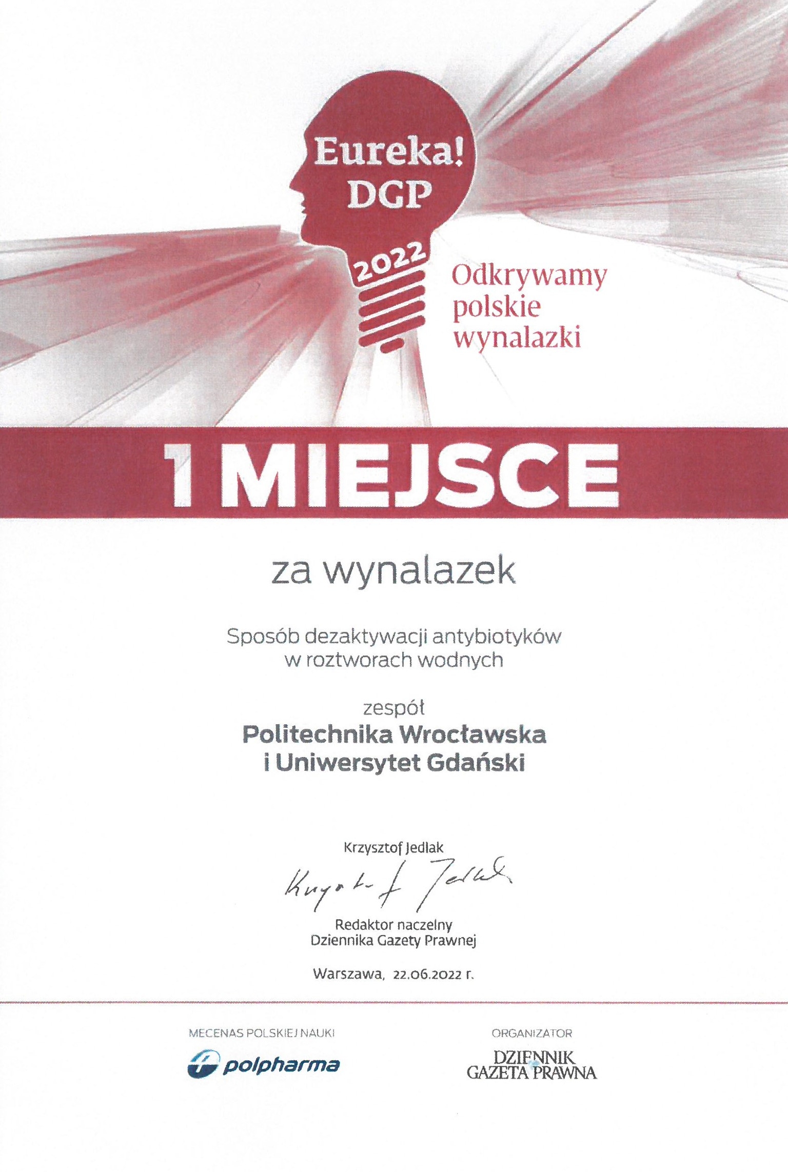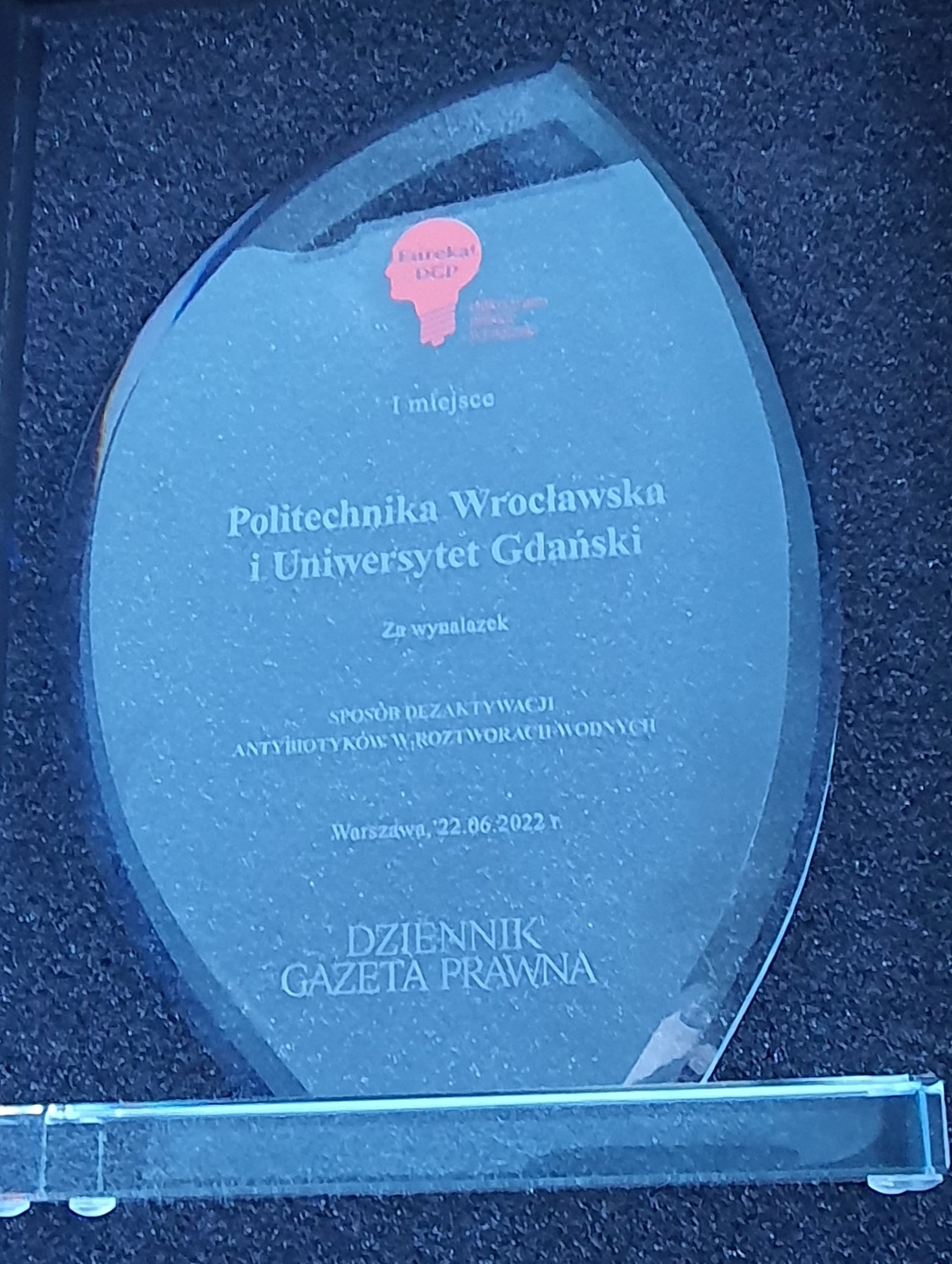 W ten sposób 1. miejsce w konkursie zdobył wynalazek „Sposób dezaktywacji antybiotyków w roztworach wodnych”, stworzony przez zespół w składzie: dr inż. Anna Dzimitrowicz (kierownik zespołu, PWr), dr inż. Wojciech Śledź (UG), dr Agata Motyka-Pomagruk (UG), prof. dr hab. inż. Paweł Pohl (PWr), mgr inż. Tymoteusz Kliś (PWr), prof. PWr dr hab. inż. Piotr Jamróz (PWr), prof. dr hab. Ewa Łojkowska (UG).