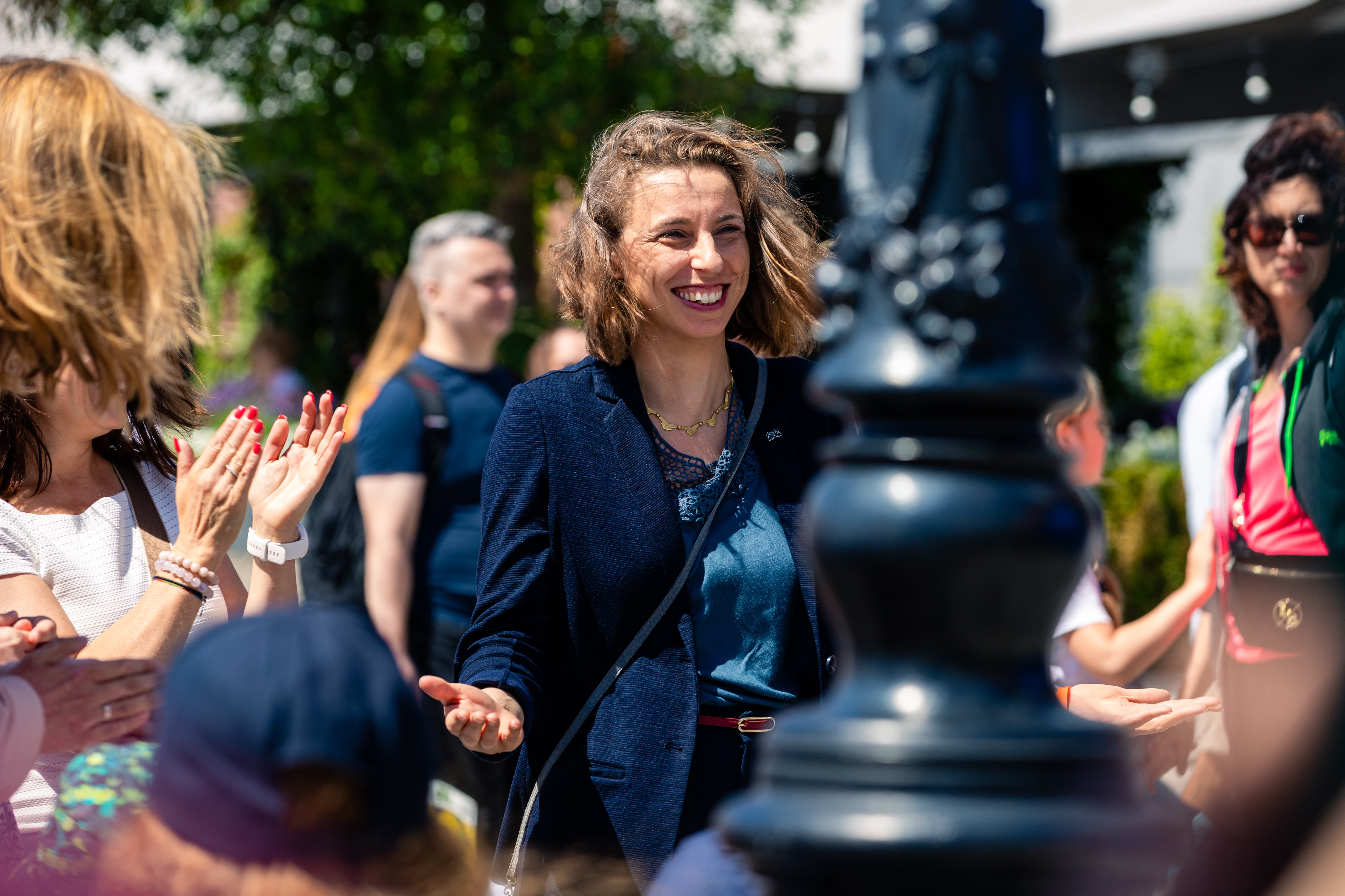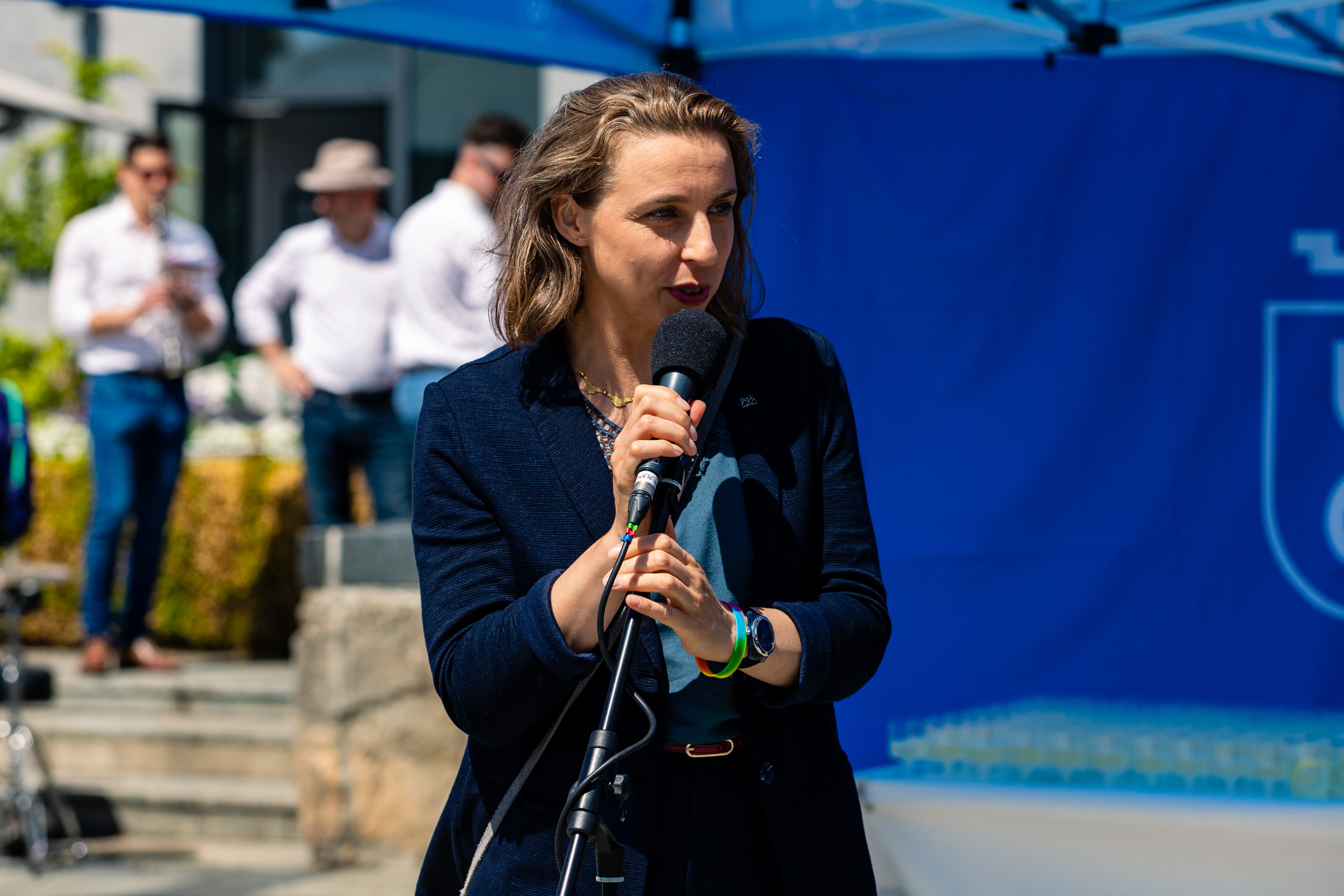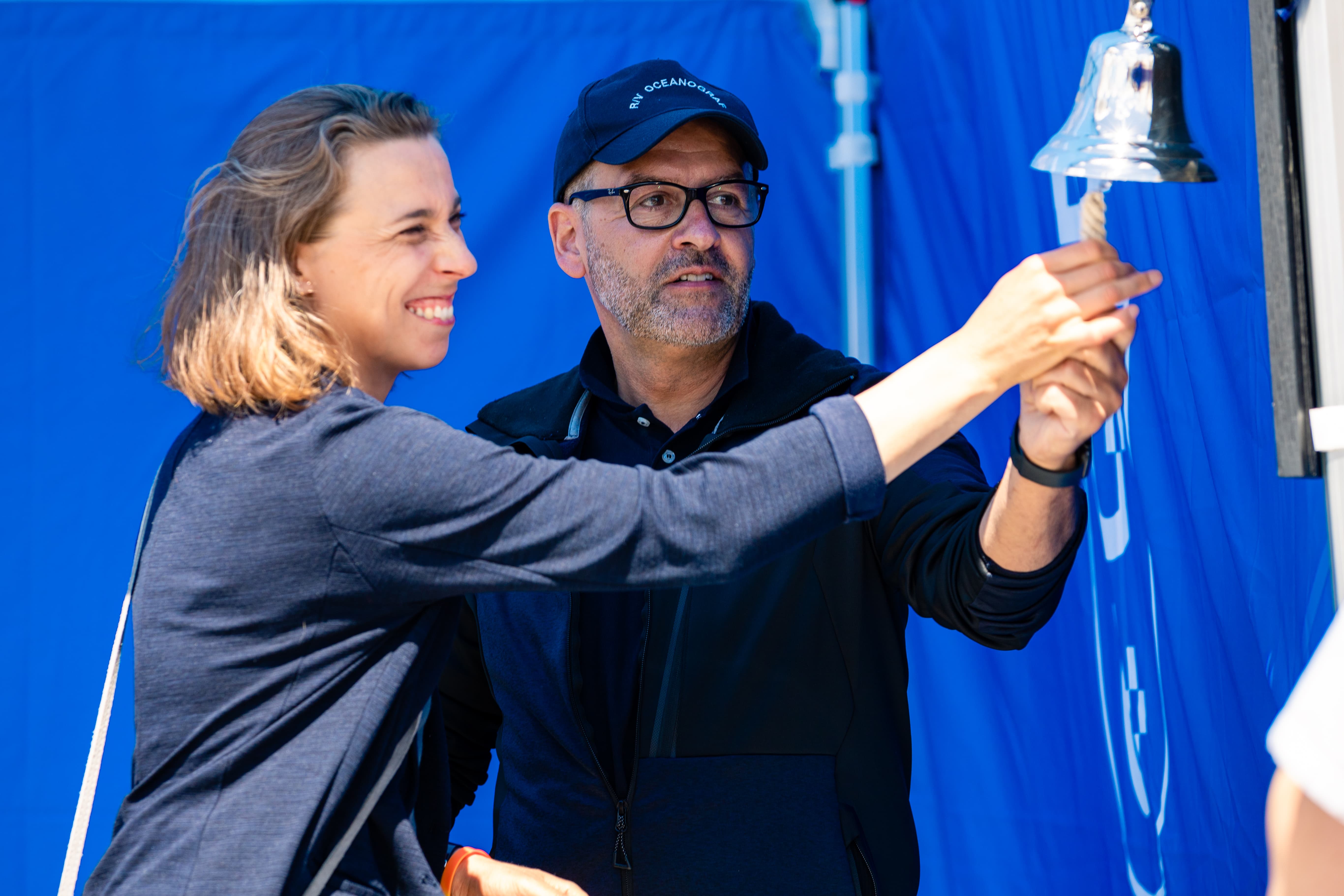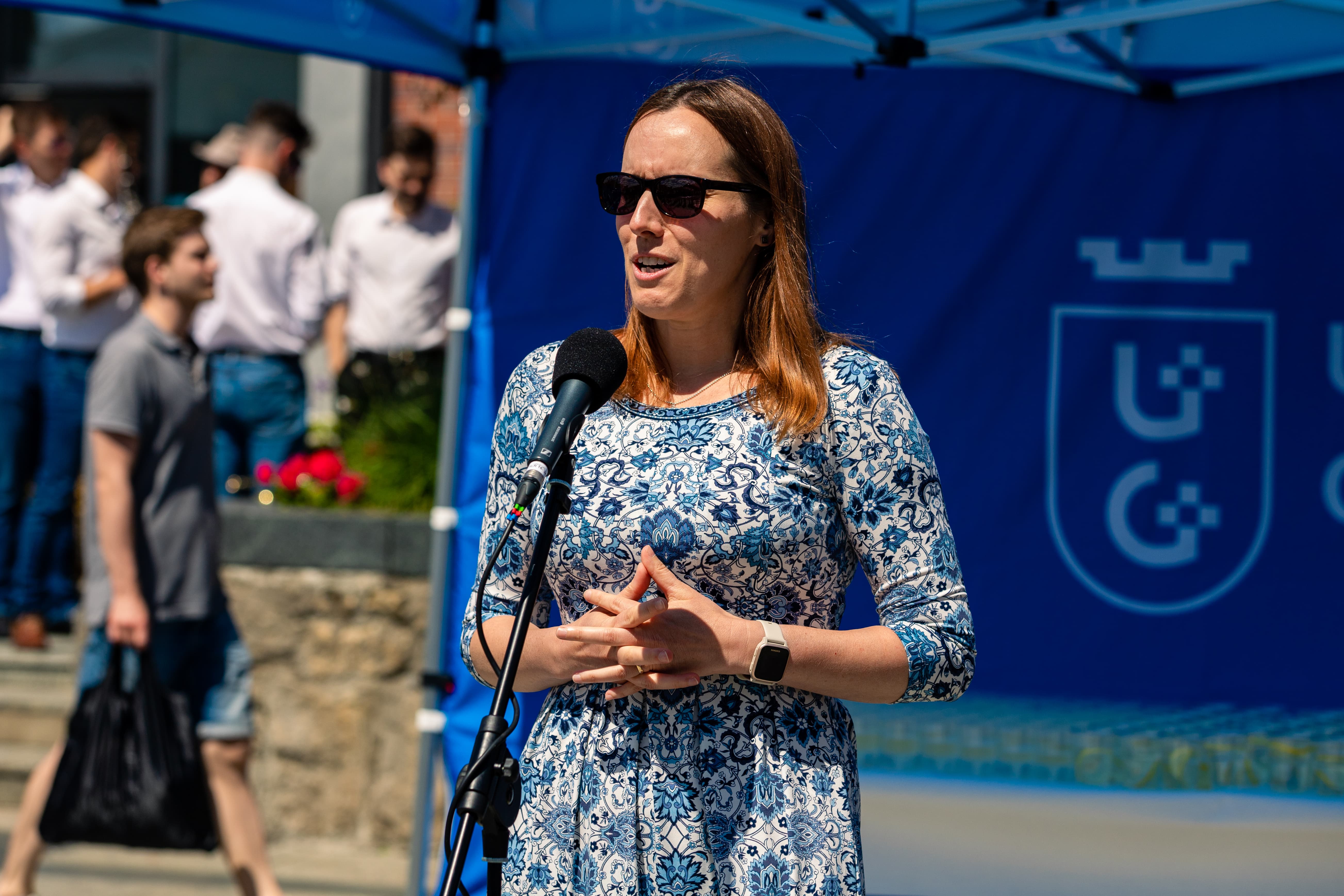 Prof. Piotr Stepnowski wraz z Panią Wiceprezydent Moniką Chabior symbolicznie zakończyli wyprawę bijąc wspólnie w dzwon.
