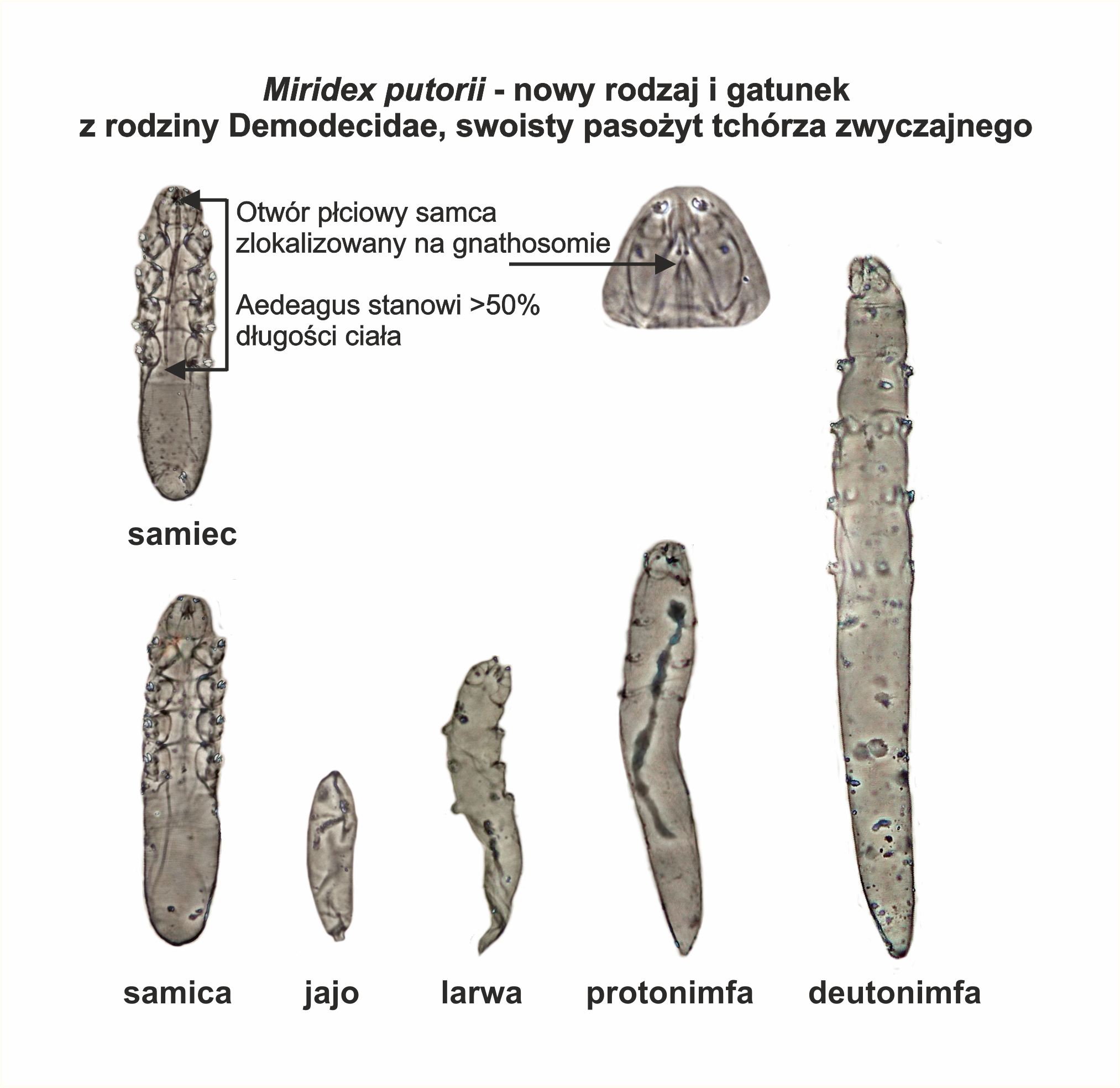 Okazuje się, że Miridex putorii Izdebska, Rolbiecki et Rehbein, 2022 to nie tylko nowy gatunek, ale też nowy dla nauki rodzaj (nazwa rodzajowa - Miridex - pochodzi od łacińskiego słowa mirus - osobliwy, niezwykły, dziwny; nazwa gatunkowa - putorii - od putorius, czyli tchórz). Roztocz ten zamieszkuje skórę głowy tchórza zwyczajnego Mustela putorius.