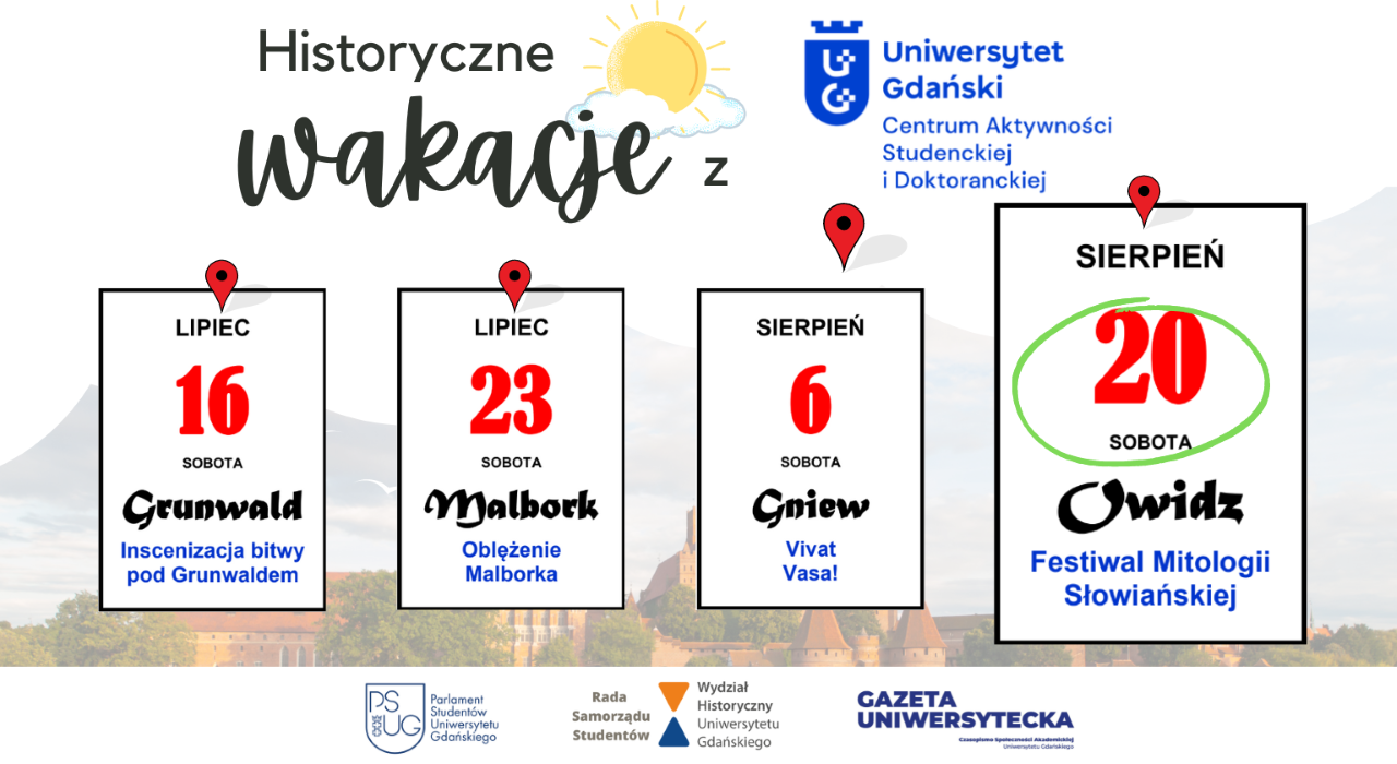 Zapraszamy do udziału w czwartej jednodniowej, sobotniej wycieczce z cyklu „Historyczne wakacje z CASiD”, organizowanej przez Centrum Aktywności Studenckiej i Doktoranckiej we współpracy z Parlamentem Studentów UG, Radą Samorządu Studentów Wydziału Historycznego UG i redakcją „Gazety Uniwersyteckiej”.