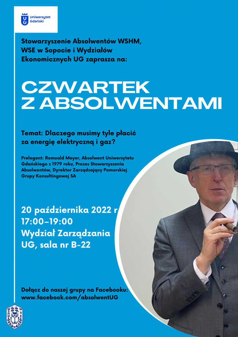 20 października o godz. 17:00 Stowarzyszenie Absolwentów WSHM, WSE i Wydziałów Ekonomicznych UG zaprasza na Wydział Zarządzania UG do sali nr B-22, na otwarte dla wszystkich zainteresowanych spotkanie poświęcone rosnącym w niebywałym tempie cenom energii elektrycznej i gazu. Głównym prelegentem będzie prezes Stowarzyszenia, Romuald Meyer, który podzieli się swoimi doświadczeniami zawodowymi. Jako dyrektor zarządzający Pomorskiej Grupy Konsultingowej SA (PGK) na co dzień współpracuje z samorządami w zakresie ich polityki energetycznej.