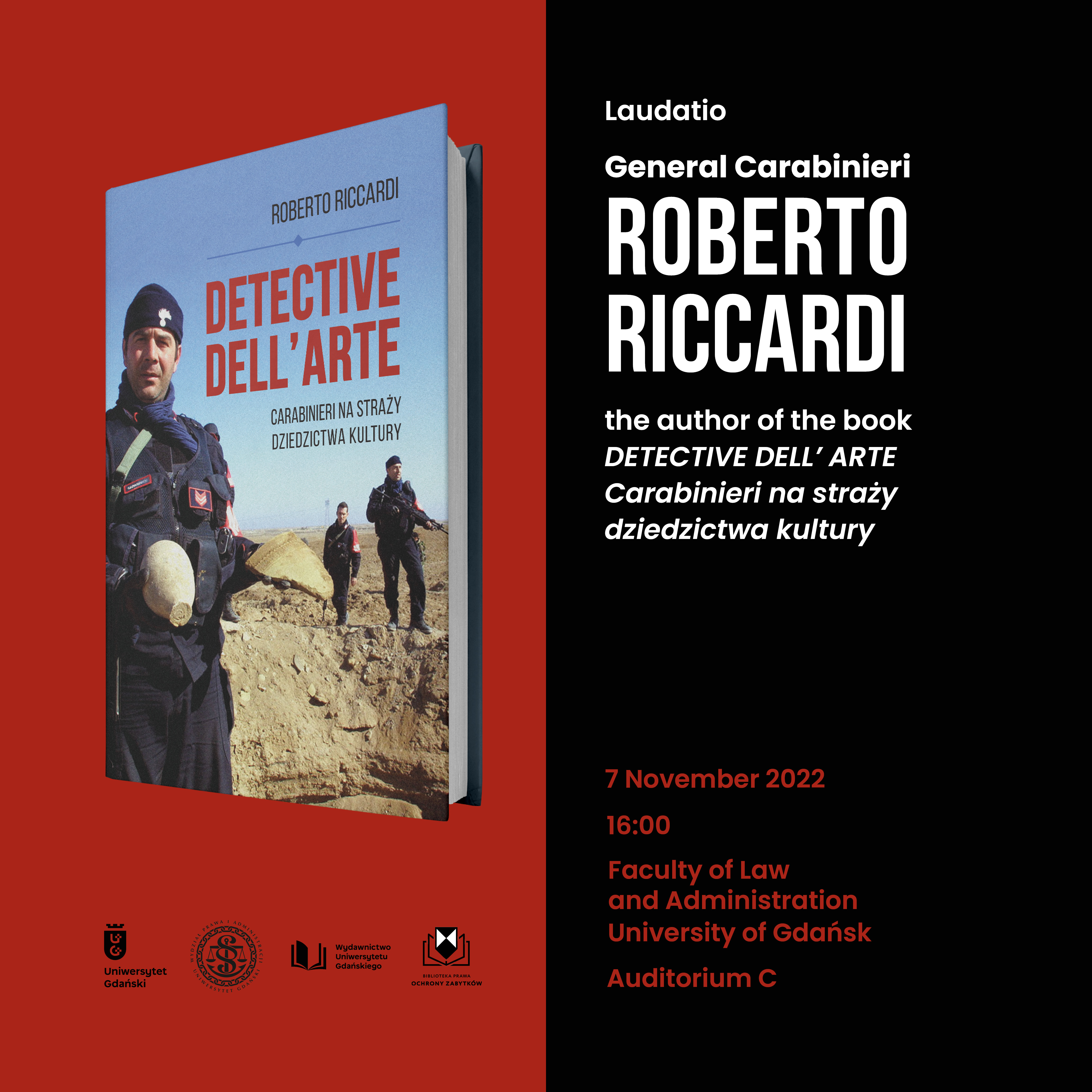 Zapraszamy do udziału w spotkaniu z generałem carabinieri Roberto Riccardim, które odbędzie się na Wydziale Prawa i Administracji w poniedziałek 7 listopada o godz. 16.00. Wydarzeniu towarzyszyć będzie promocja książki gen. R. Riccardiego pt. „Detective dell’arte. Carabinieri na straży dziedzictwa kultury”, która ukazała się nakładem Wydawnictwa UG we wrześniu br. W książce autor opisuje działalność carabinieri, odwołując się do konkretnych zdarzeń kradzieży dzieł sztuki zarówno z muzeów, galerii i kościołów, jak i pochodzących z nielegalnych wykopalisk archeologicznych.