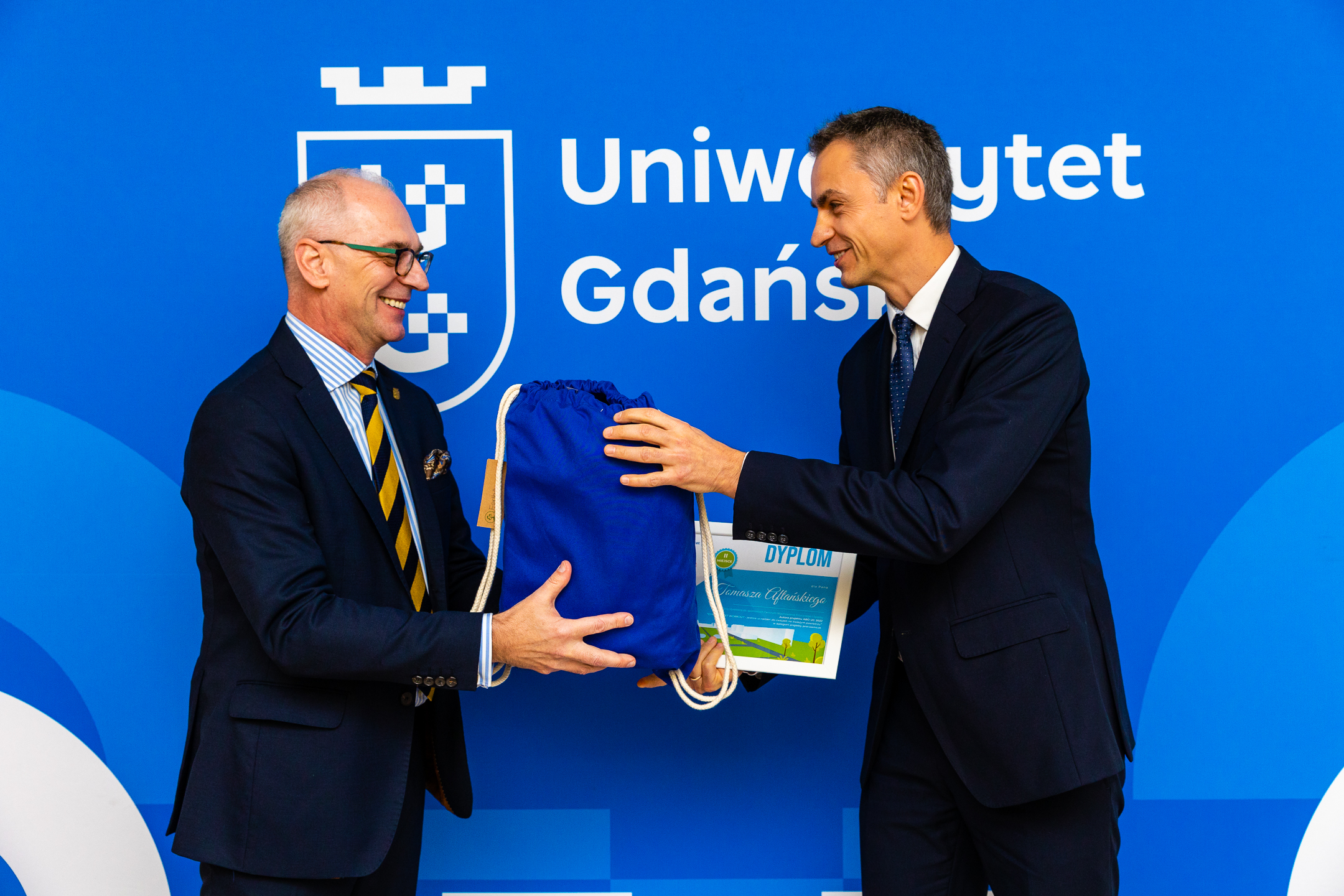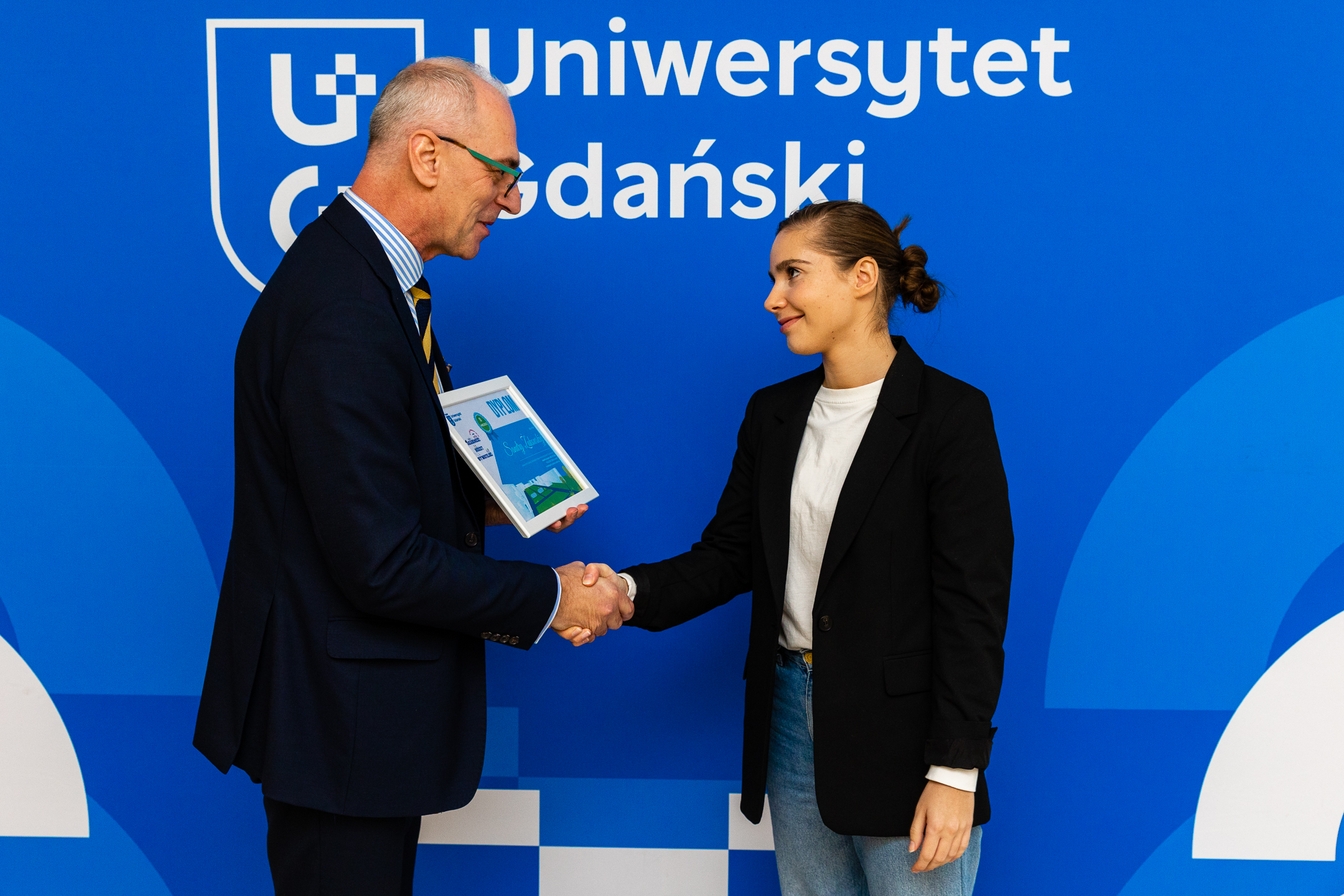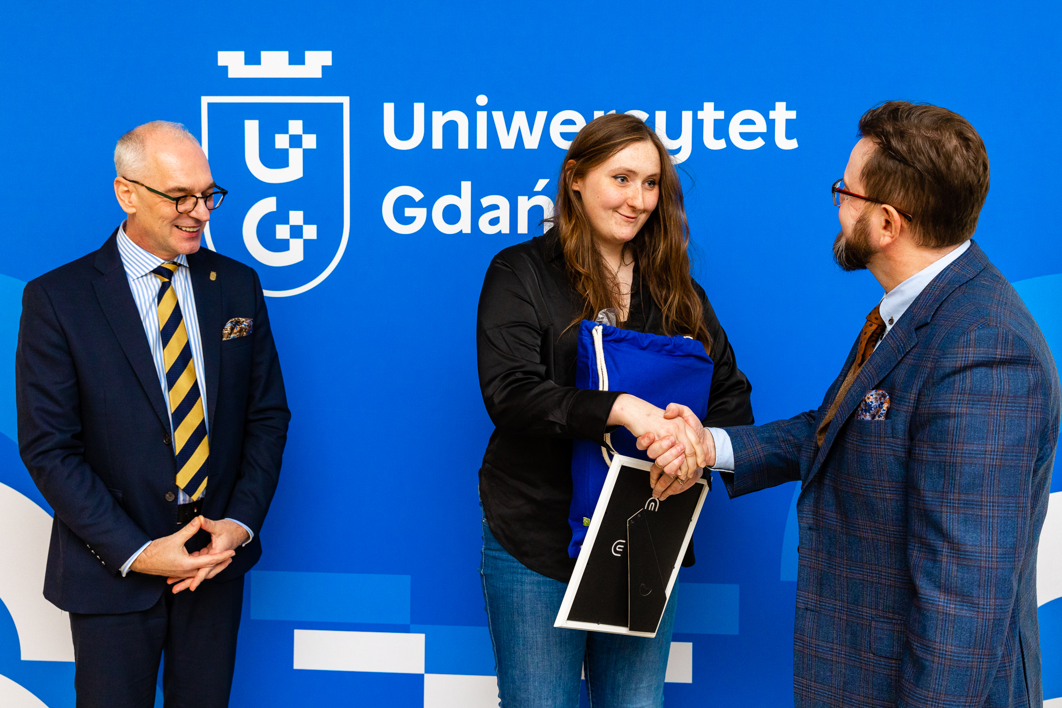 We wręczaniu nagród brali udział dziekani wydziałów. Na zdjęciu Dziekan WPiA dr hab. Wojciech Zalewski prof. UG wraz z prof. Arnoldem Kłonczyńskim gratuluje Milenie Kruszewskiej. fot. Alan Stocki