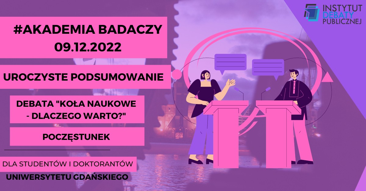 Wielkimi krokami zbliża się zakończenie tegorocznej Akademii Badaczy - projektu edukacyjnego dla studentów i doktorantów Uniwersytetu Gdańskiego, realizowanego przez Instytut Debaty Publicznej przy wsparciu Ministerstwa Edukacji i Nauki. Z tej okazji, w ramach uroczystego zamknięcia cyklu szkoleń, na 9 grudnia 2022 roku zaplanowała została gala finałowa, podczas której odbędzie się debata pod tytułem „Koła naukowe - dlaczego warto?”.