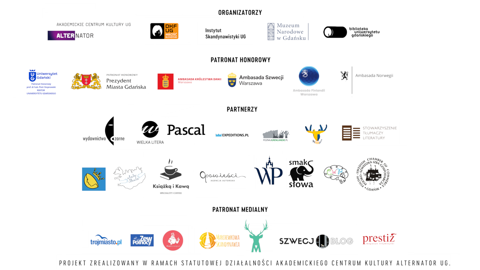 Partnerzy: Wydawnictwo Czarne, Wydawnictwo Poznańskie, Wydawnictwo Wielka Litera, Wydawnictwo Pascal, Expeditions.pl, Poznaj Grenlandię, Pofikasz? O Szwecji po polsku, Sztokholmianka, Utulę THULE, Agencja autorska "Opowieści", Akademickie Centrum Wsparcia Psychologicznego UG, Księgarnia Smak Słowa, Coffee-Moose Gdańsk, Polsko-Szwedzka Izba Gospodarcza, Stowarzyszenie Tłumaczy Literatury