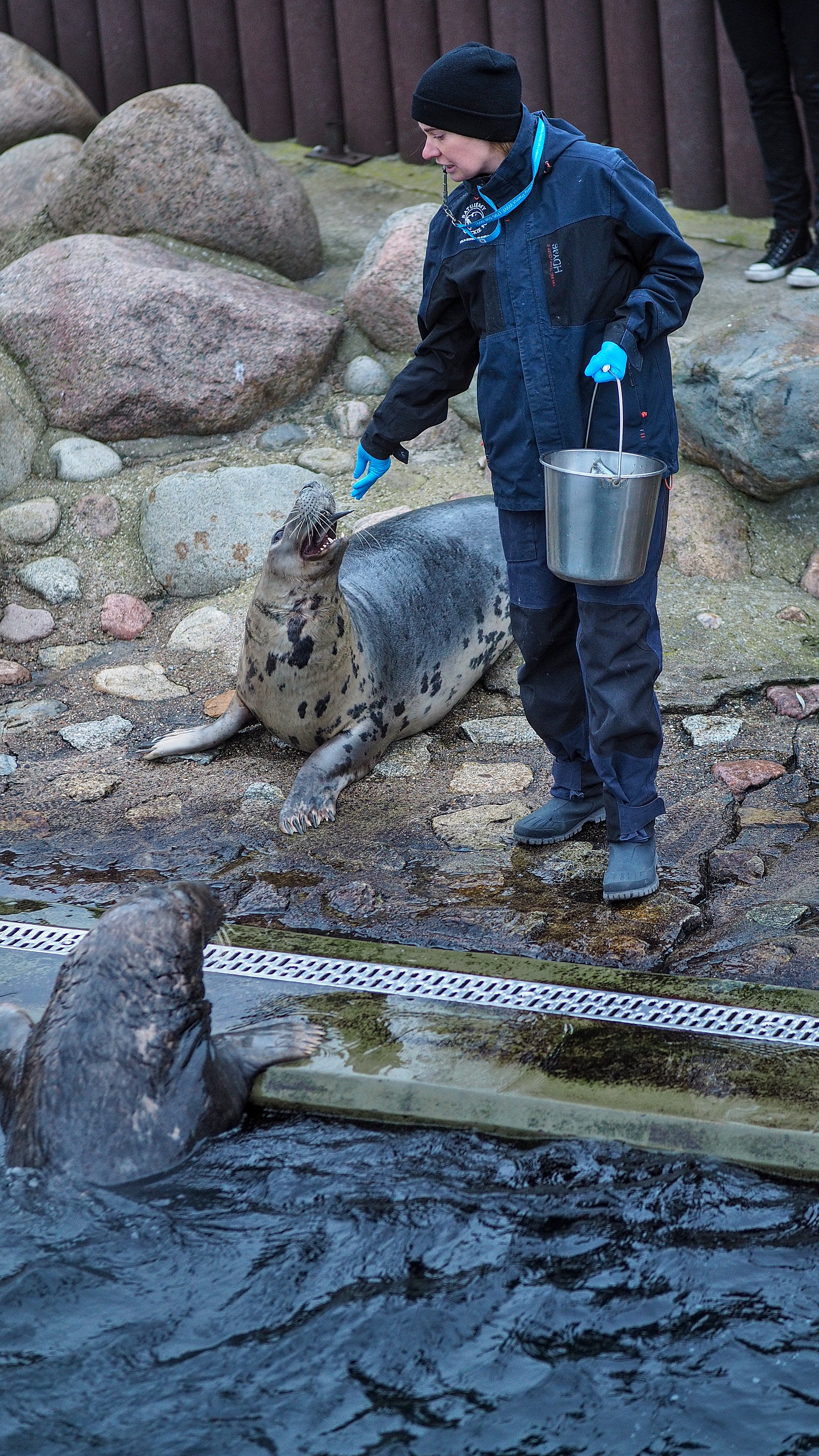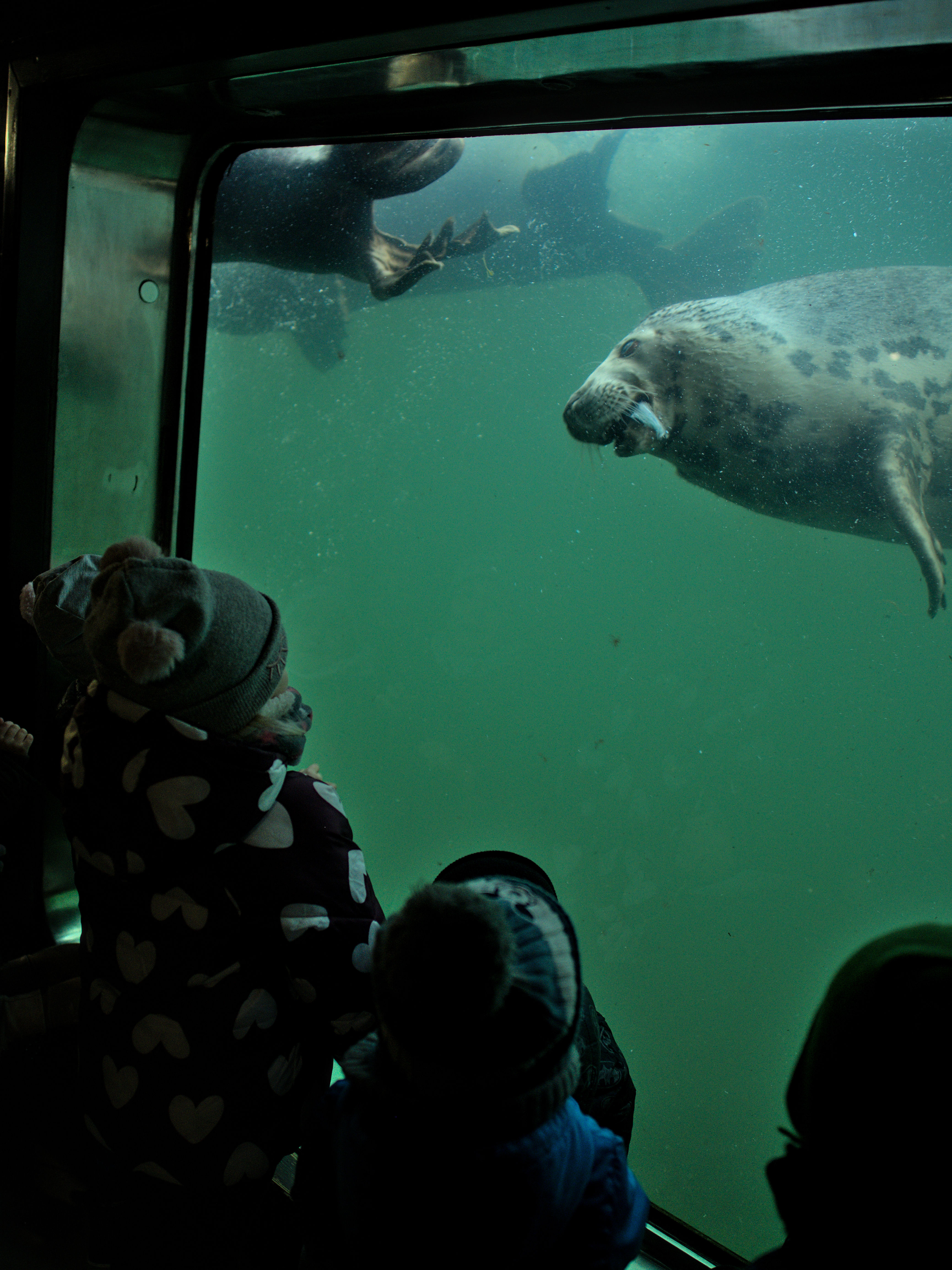 Opiekunowie wchodzą, za nimi główna atrakcja – grupa fok, które czekają na swoją porcję pokarmu. Karmiąc zwierzęta pracownicy zachęcają je do wykonywania ćwiczeń tj. aportowania ringo czy podrzucanie piłki. Dzieci się cieszą, wiwatują, a mi mimowolnie przypomina się skecz Tomasza Jachimka o tym, jak ostatnia z karmionych fok czuje zażenowanie, gdy robi z siebie kretynkę dla jednej ryby. Coś w tym jest. Pewnie dlatego część fok ma nas głęboko w poważaniu i postanawia zanurkować. Nawet tam nie mają spokoju, głównie przez przeszklone dno, do którego mamy dostęp. Niemniej, dzieci są zachwycone. Pukają w szybkę wypatrując ssaków, a z ich buzi słychać przeciągłe „Łooo”.