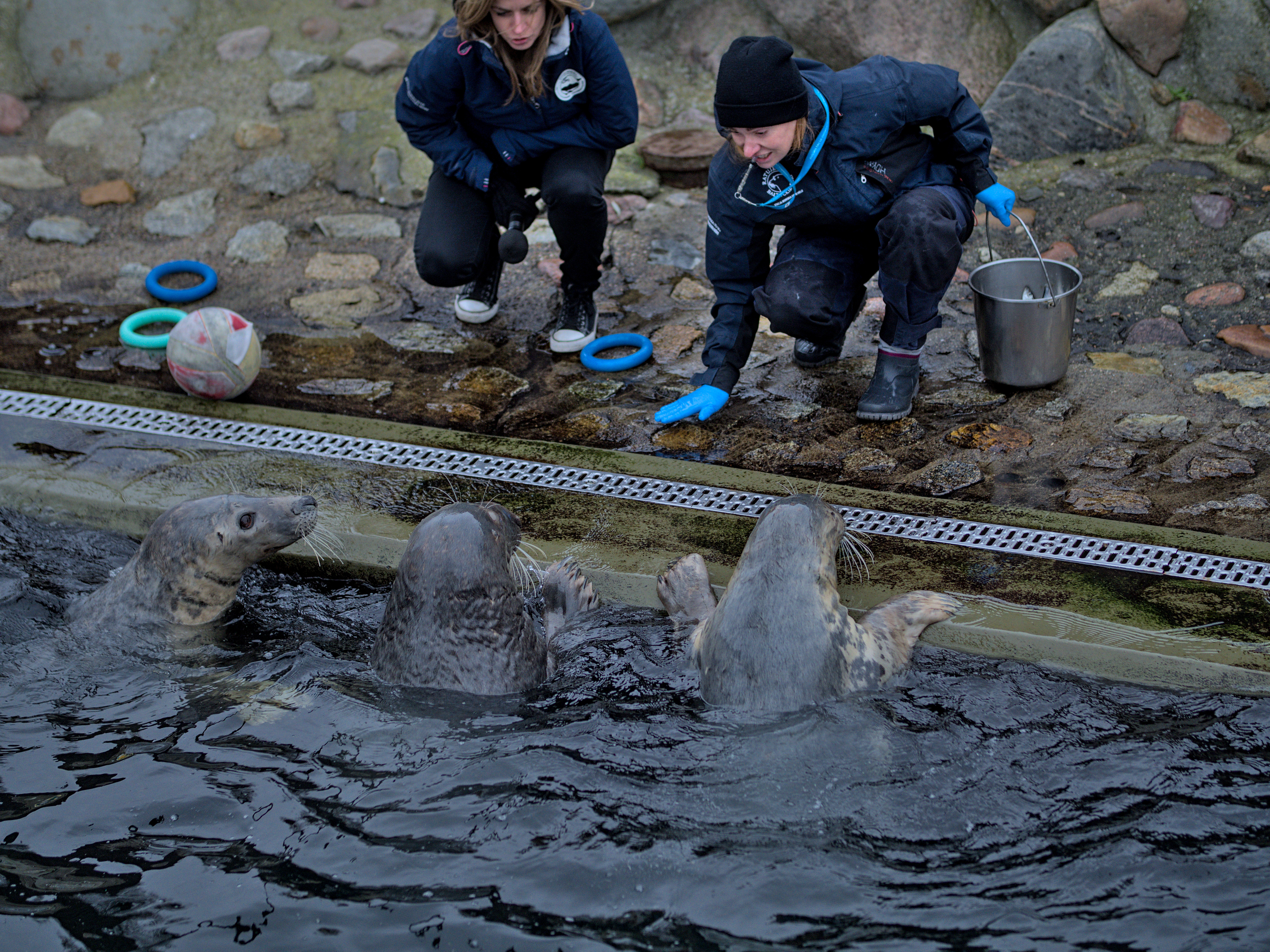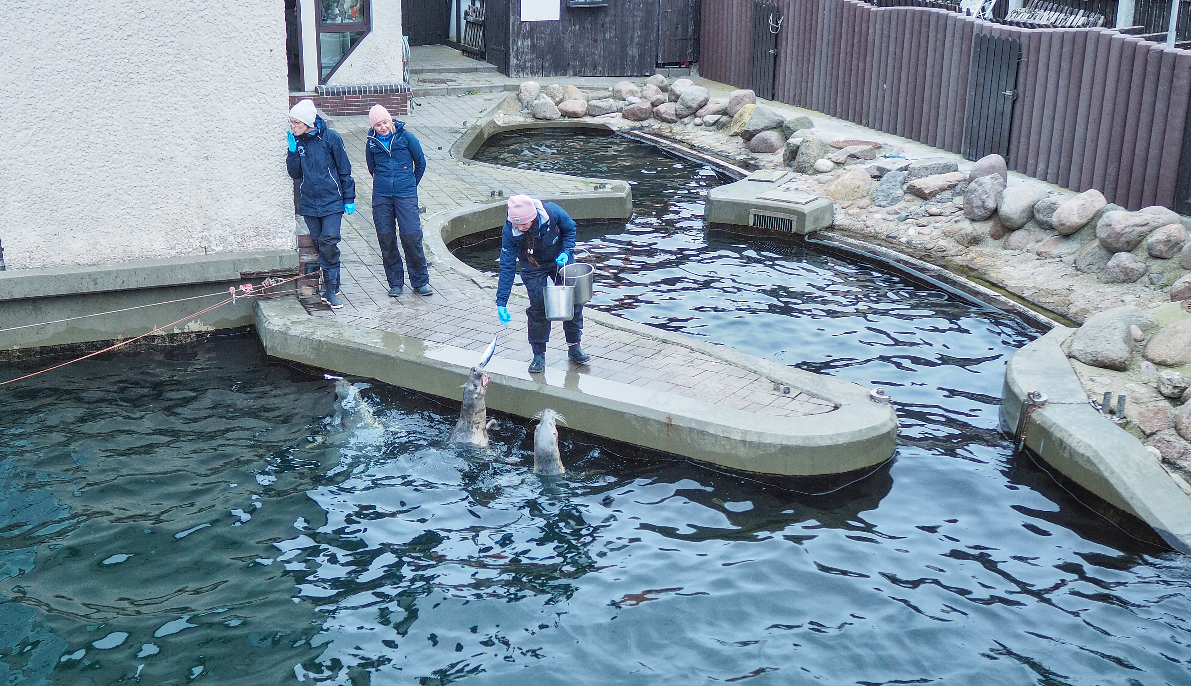 WM: Jest to zwierzętom kompletnie niepotrzebne, dlatego kiedy wykonujemy z nimi taki trening codziennie przy karmieniu to dodatkowo robimy też trening zabawowy. Ma to na celu głównie urozmaicić im życie tutaj. Kiedy muszą sobie zapracować na rybę dużo lepiej psychicznie znoszą niewolę. Pomiędzy karmieniami staramy się dbać o różnego rodzaju dodatkowe zabawy dla nich. Dostają na przykład butelki wypełnione rybą czy lody szprotkowe.