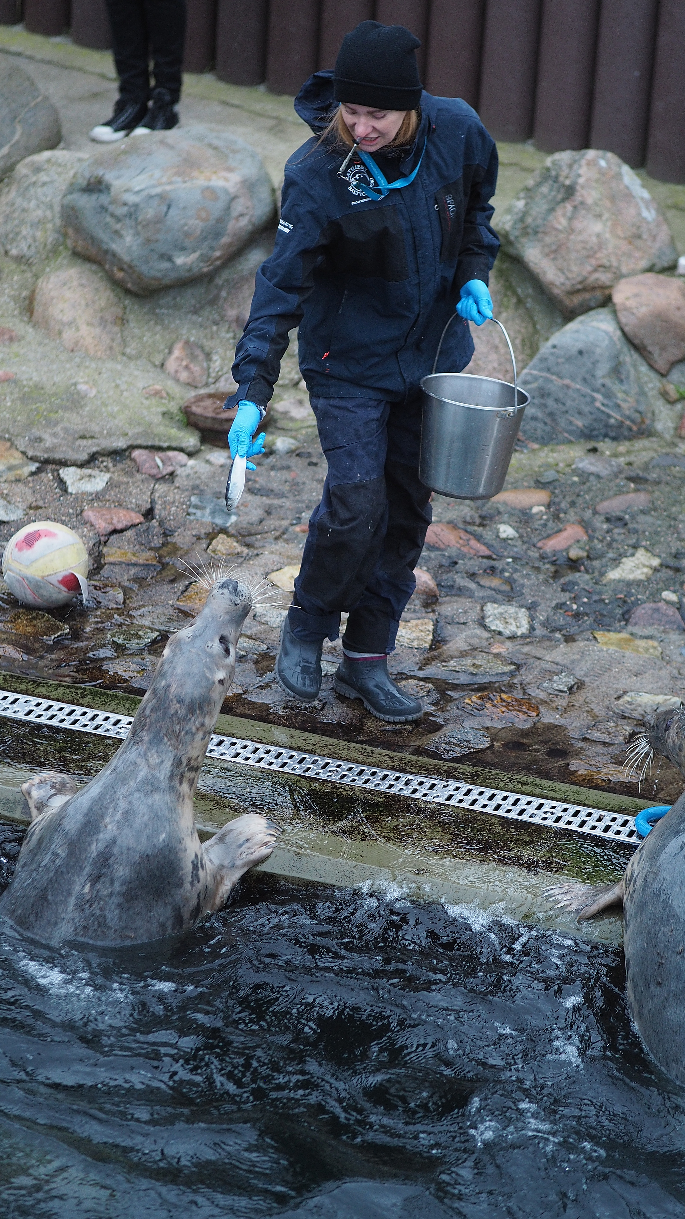 W ostatni, niezwykle mroźny, listopadowy dzień, około 8:30 wyruszyłyśmy w podróż do Helu w celu spotkania z opiekunami dzikich, morskich zwierząt – fok szarych. Blisko pustych, wyludnionych plaż leży Stacja Morska im. Profesora Krzysztofa Skóry Instytutu Oceanografii w Helu. Placówka prowadzi m.in. ośrodek rehabilitacji fok. Do tego miejsca trafiają jedynie schorowane oraz ranne osobniki, które potrzebują pomocy człowieka. Ośrodek to schronienie, w którym zwierzęta dzięki rehabilitacji zyskują szansę na godne i zdrowe życie w swym naturalnym środowisku. W prowadzonym w Stacji Morskiej fokarium, gdzie żyje rezydentalne stado fok szarych niezwykle ważnym (o ile nie najważniejszym) elementem jest trening medyczny, który ma na celu ułatwienie opiekunom wykonywania badań i zabiegów weterynaryjnych. Ćwiczenia oparte są o metodę pozytywnego wzmocnienia. Po wykonaniu odpowiedniej komendy zwierzę dostaje w nagrodę rybę (foki rezydentki najbardziej lubią makrelę oraz śledzie), dzięki czemu zapamiętuje i podtrzymuje wyuczone reakcje. Ta strategia opiera się przede wszystkim na budowaniu lepszego porozumienia między zwierzęciem a opiekunem, ponieważ dzięki niemu uczy się tolerować ludzi wokół siebie, co zmniejsza stres podczas wykonywania koniecznych dla jej życia badań, podania leku, zrobienia zastrzyku, czy zwykłego oczyszczenia uszu. Opiekunowie troszczą się również o ich komfort psychiczny podczas pobytu w niewoli, gdyż podczas treningu dbają o urozmaicenie ich życia poprzez różne zabawy m.in. z piłką. Trening medyczny można obejrzeć podczas karmienia, połączonego z prelekcją w godzinach: 11.00 i 14.00. Pierwsze, co zauważyłam podczas obserwacji ich karmienia, to przemoczone nogawki spodni każdej z pracownic oraz stale ochlapujące je wodą foki. Przy -2 °C od razu pomyślałam o poświęceniu i poczuciu odpowiedzialności wobec morskich zwierząt.