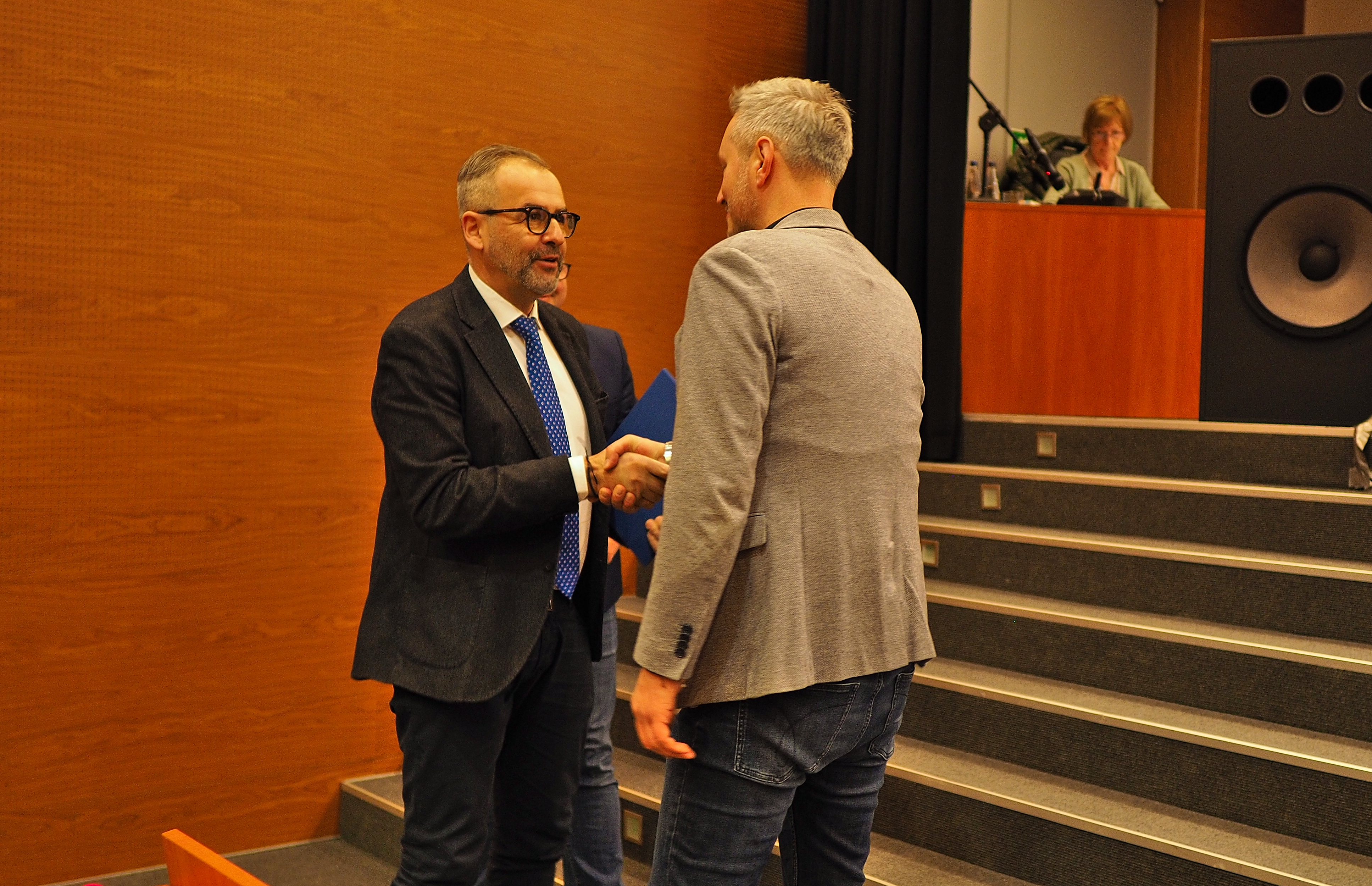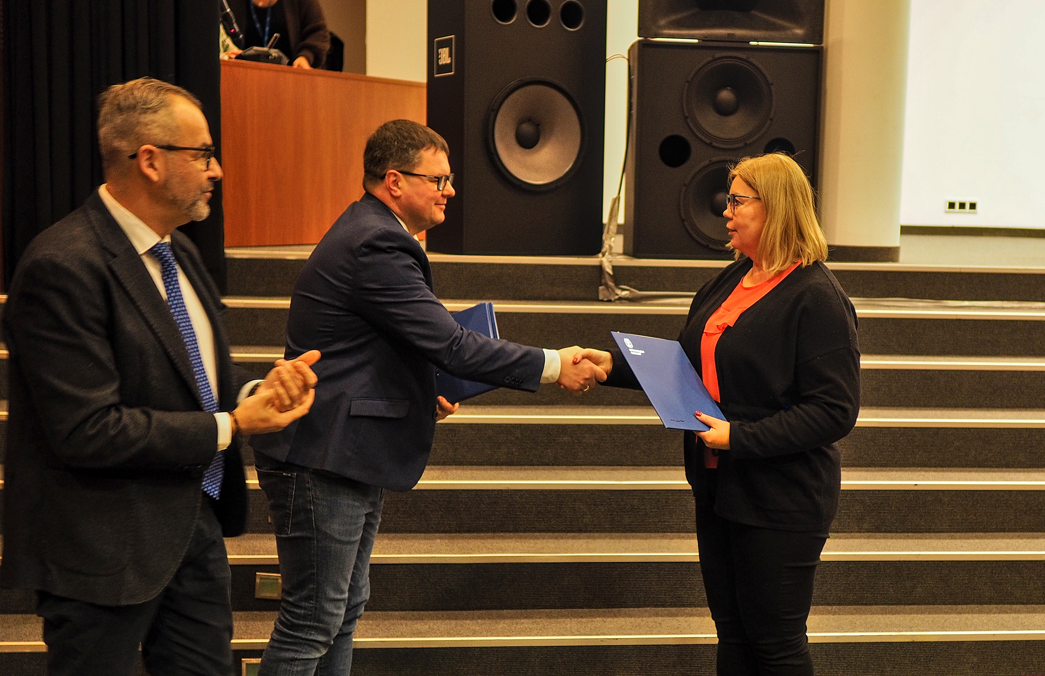 Rektor UG oraz Prorektor ds. Badań Naukowych prof. dr hab. Wiesław Laskowski wręczyli dyplomy reprezentantom wydziałów i jednostek, których dyscypliny otrzymały kategorię A: