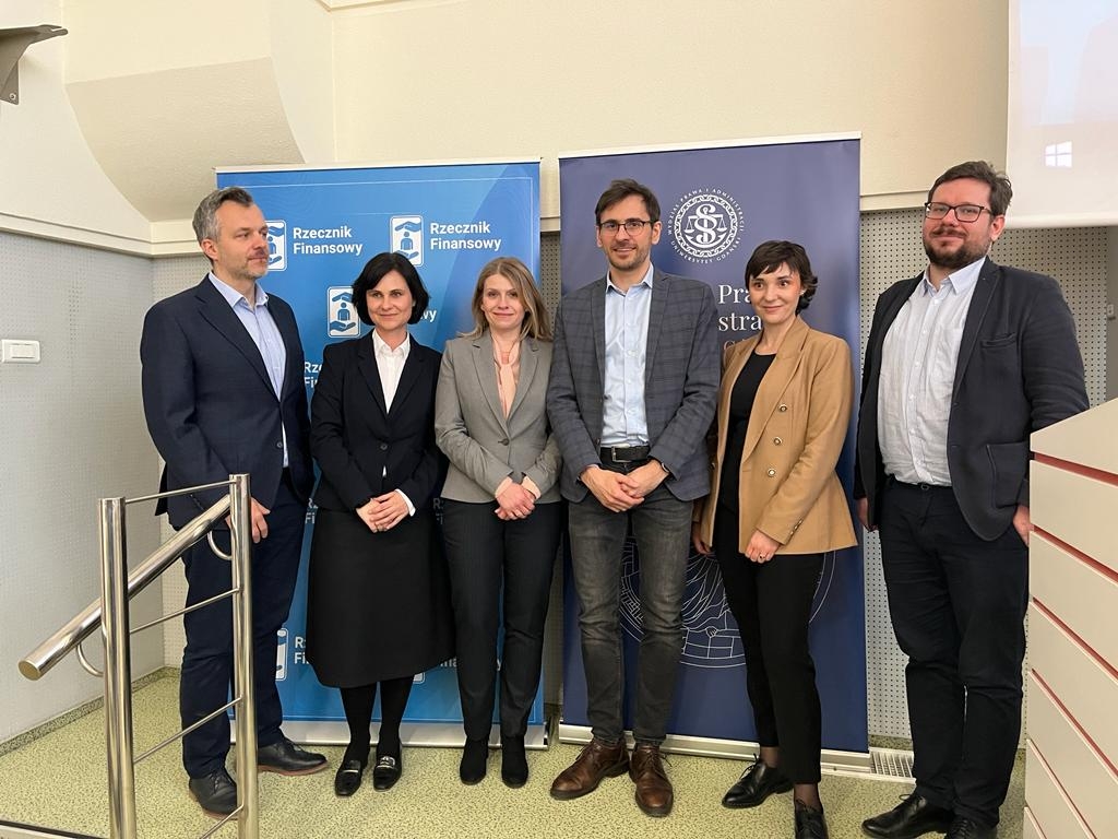 Na zdjęciu od lewej: Maciej Sawa, zastępca dyrektora Wydziału Edukacji  i Komunikacji, dr hab Małgorzata Balwicka-Szczyrba, prof UG, Prodziekan ds. kształcenia WPiA , Anna Gadomska, dyrektor Wydziału Pozasądowego Rozwiązywania Sporów, Jakub Borowski, kierownik Zespołu Prawnego w Wydziale Klienta Rynku Ubezpieczeniowo-Emerytalnego, Dorota Węgrzyńska-Jarząbek, radca prawny w Wydziale Klienta Rynku Bankowo-Kapitałowego, dr Marek Jakubiec, zastępca dyrektora Wydziału Edukacji I Komunikacji.