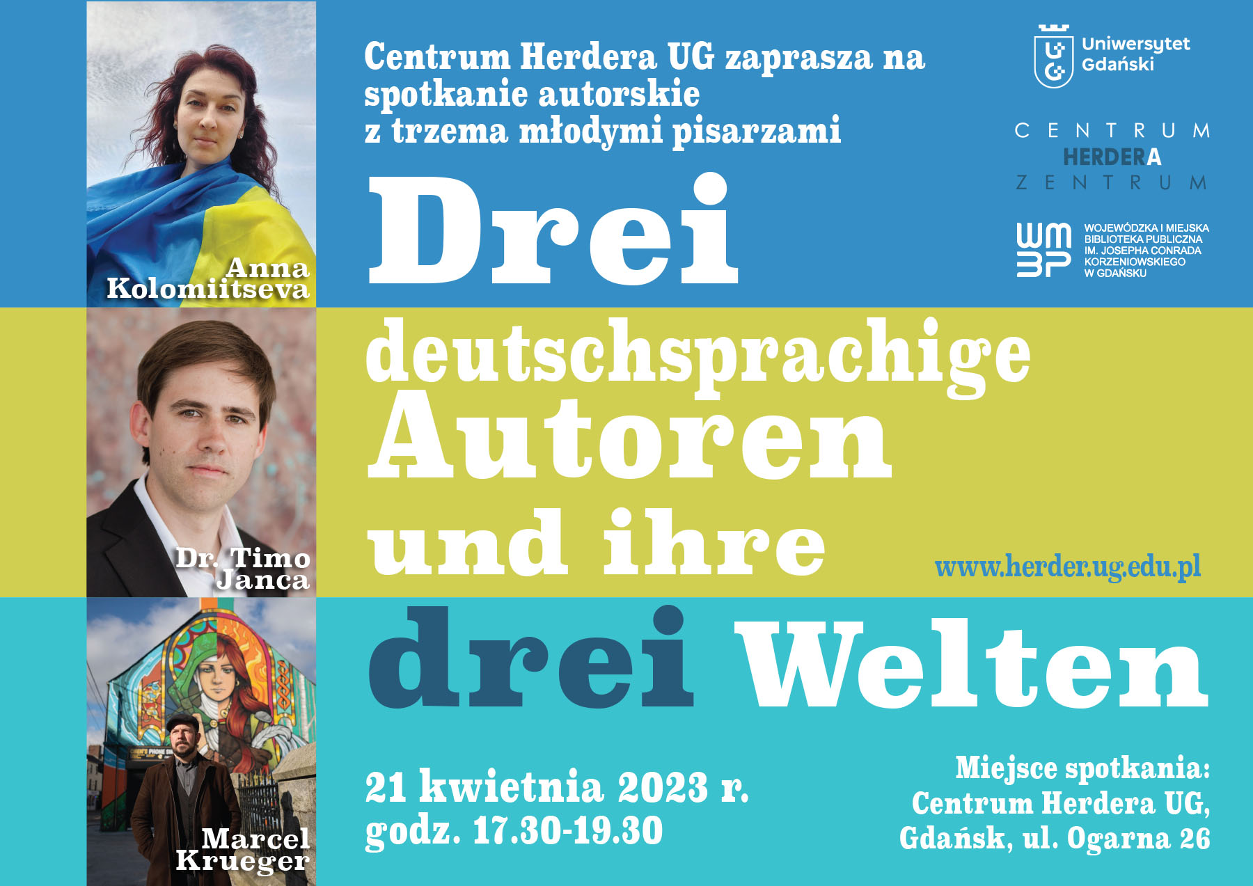 O wojnie w Ukrainie, historii Europy, czy o kulturze niemieckiej piszą goście nadchodzącego wydarzenia w Centrum Herdera UG. Już 21 kwietnia 2023 w godz. 17.30-19.30 odbędzie się spotkanie z trzema niemieckojęzycznymi pisarzami młodego pokolenia.