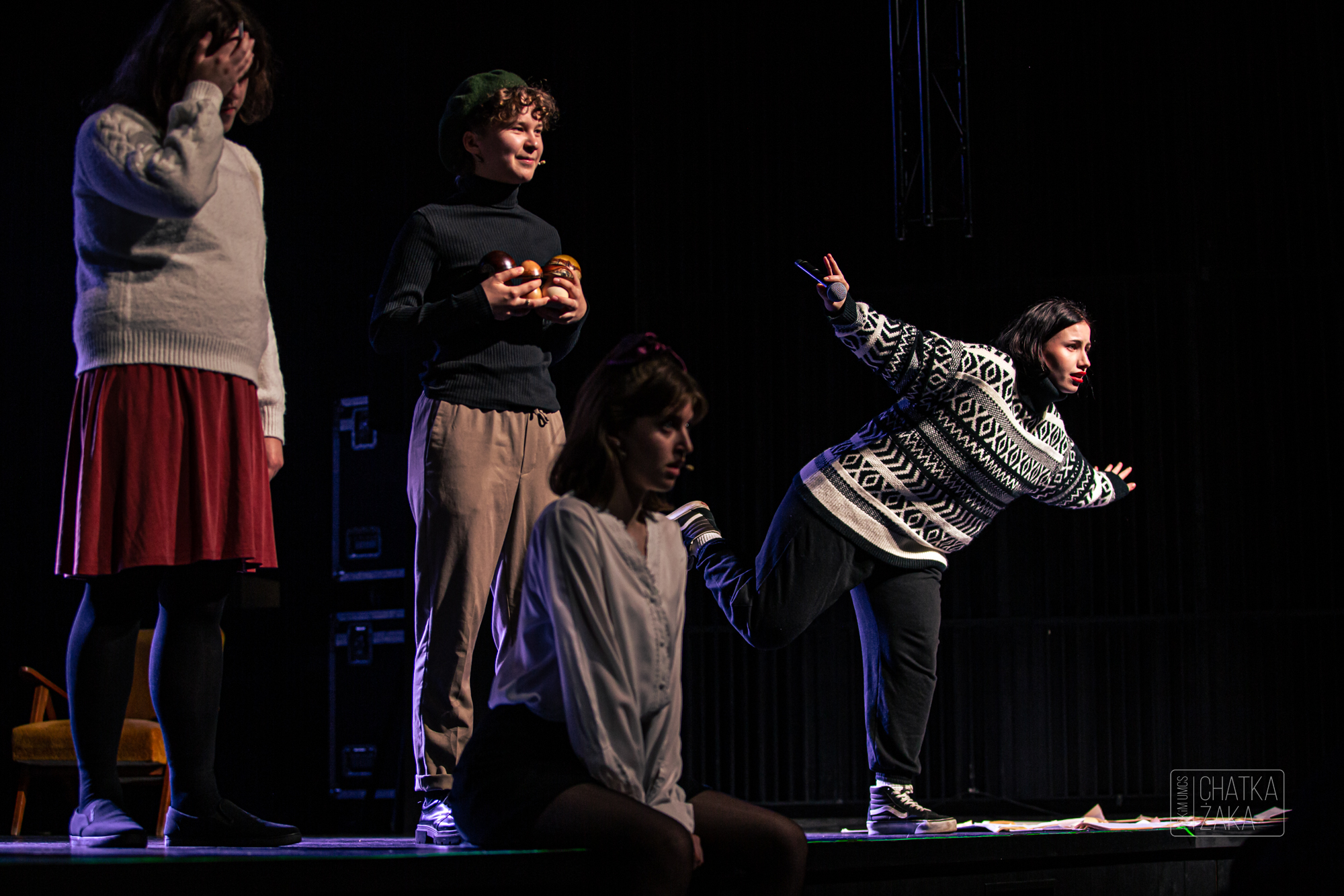 Zmultiplikowana Wisława ma na scenie różnej oblicza - jedna przez cały spektakl przygotowuje się nerwowo do wygłoszenia odczytu noblowskiego, druga z atencją segreguje bibeloty w szufladach, trzecia jest dziecięcym wcieleniem poetki i robi to co, na co właśnie ma ochotę... Wszystkie one razem pozwalają zobaczyć poetkę jako osobę niezwykle złożoną i bardzo interesującą.