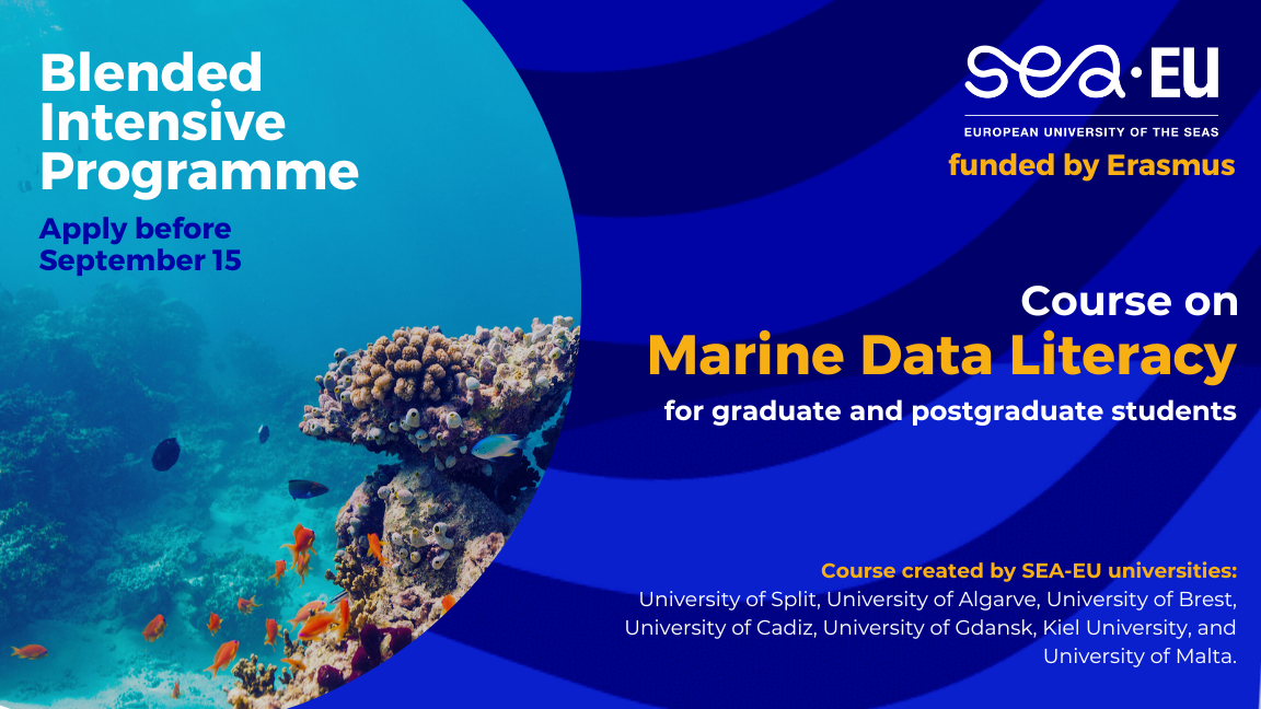 Marine Data Literacy to pionierski projekt, którego głównym celem jest podniesienie kompetencji w zakresie wyszukiwania, rozumienia i wykorzystania danych dotyczących środowiska morskiego. Zajęcia w formie wykładów i warsztatów będą prowadzone przez zespół ekspertów z uniwersytetów współpracujących w ramach SEA-EU (uczelni ze Splitu, Algarve, Brestu, Kadyksu, Gdańska, Kilonii i Malty). Przewidywana jest możliwość uzyskania punktów ECTS.