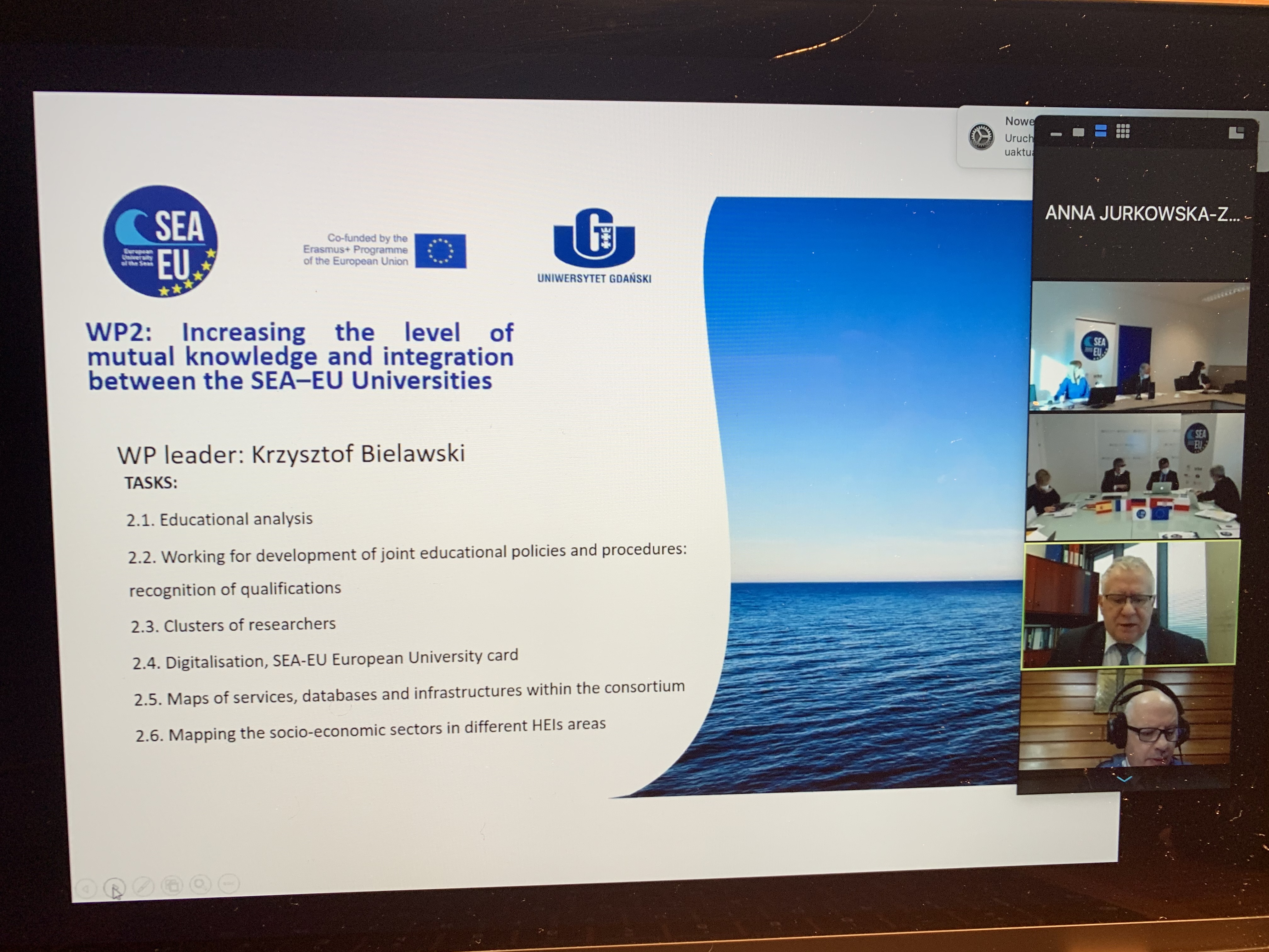Konsorcjum European University of the Seas – SEA-EU, którego partnerem jest Uniwersytet Gdański, zorganizowało kolejne spotkanie SEA-EU Governing Board. Tym razem gospodarzem spotkania, które odbyło się 15 grudnia w formule online był Uniwersytet w Splicie. Uniwersytet Gdański reprezentowali JM Rektor prof. dr hab. Piotr Stepnowski, Prorektor ds. Studentów i Jakości Kształcenia dr hab. Arnold Kłonczyński, prof. UG – członkowie Governing Board z ramienia Uniwersytetu Gdańskiego, Prorektor ds. Innowacji i Współpracy z Otoczeniem Społeczno-Gospodarczym prof. dr hab. Krzysztof Bielawski – Lider WP2 oraz Prorektor ds. Współpracy Międzynarodowej dr hab. Anna Jurkowska-Zeidler, prof. UG – Kierownik Projektu SEA-EU.