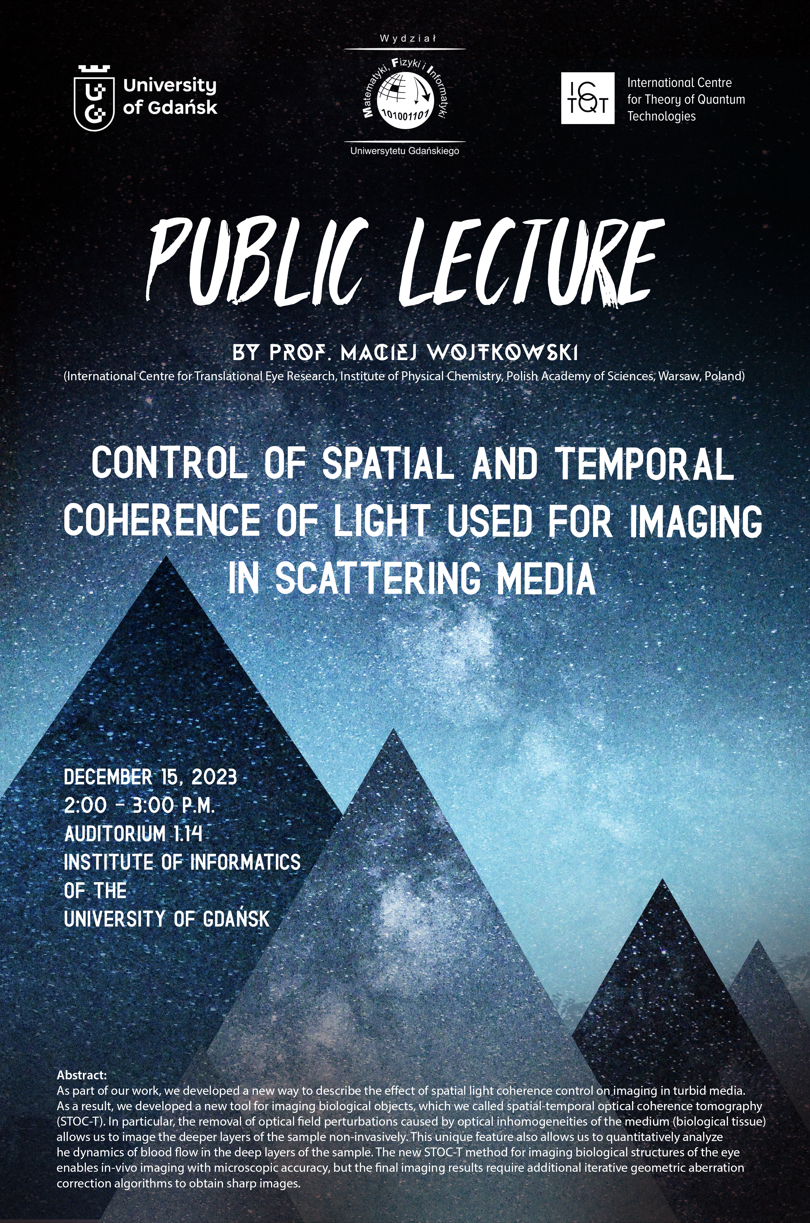 Instytut Fizyki Teoretycznej i Astrofizyki Wydziału Matematy, Fizyki i Informatyki UG wraz z Międzynarodowym Centrum Teorii Technologii Kwantowych zapraszają na wykład otwarty prof. Macieja Wojtkowskiego pt. „Control of Spatial and Temporal Coherence of Light Used for Imaging in Scattering Media”.