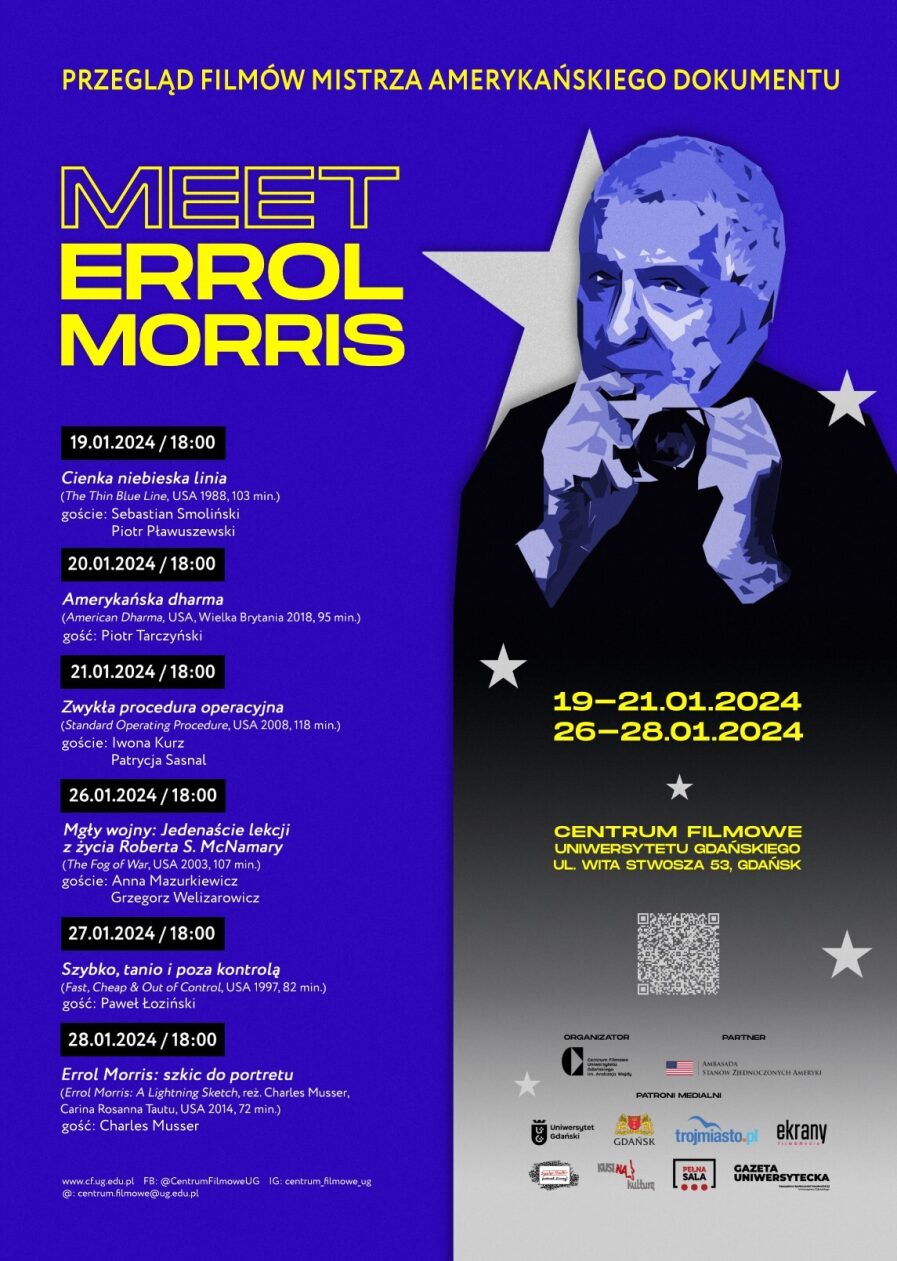 Meet Errol Morris to przegląd najważniejszych filmów w dorobku amerykańskiego reżysera. W programie naszej retrospektywy znalazły się Cienka niebieska linia, Amerykańska dharma, Zwykła procedura operacyjna, Mgły wojny: Jedenaście lekcji z życia Roberta S. McNamary, Szybko, tanio i poza kontrolą, a także film dokumentalny poświęcony samemu twórcy, Errol Morris: szkic do portretu (reż. Charles Musser, Carina Rosanna Tautu, 2014). Projekcjom towarzyszyć będą spotkania z filmoznawcami, kulturoznawcami, dziennikarzami oraz dokumentalistami, którzy porozmawiają zarówno o obrazie współczesnej Ameryki, zawartym w filmach Morrisa, jak i o samym medium, jakim jest film dokumentalny. Wśród zaproszonych gości znaleźli się: Iwona Kurz, Paweł Łoziński, Anna Mazurkiewicz, Charles Musser, Piotr Pławuszewski, Patrycja Sasnal, Sebastian Smoliński, Piotr Tarczyński, oraz Grzegorz Welizarowicz.