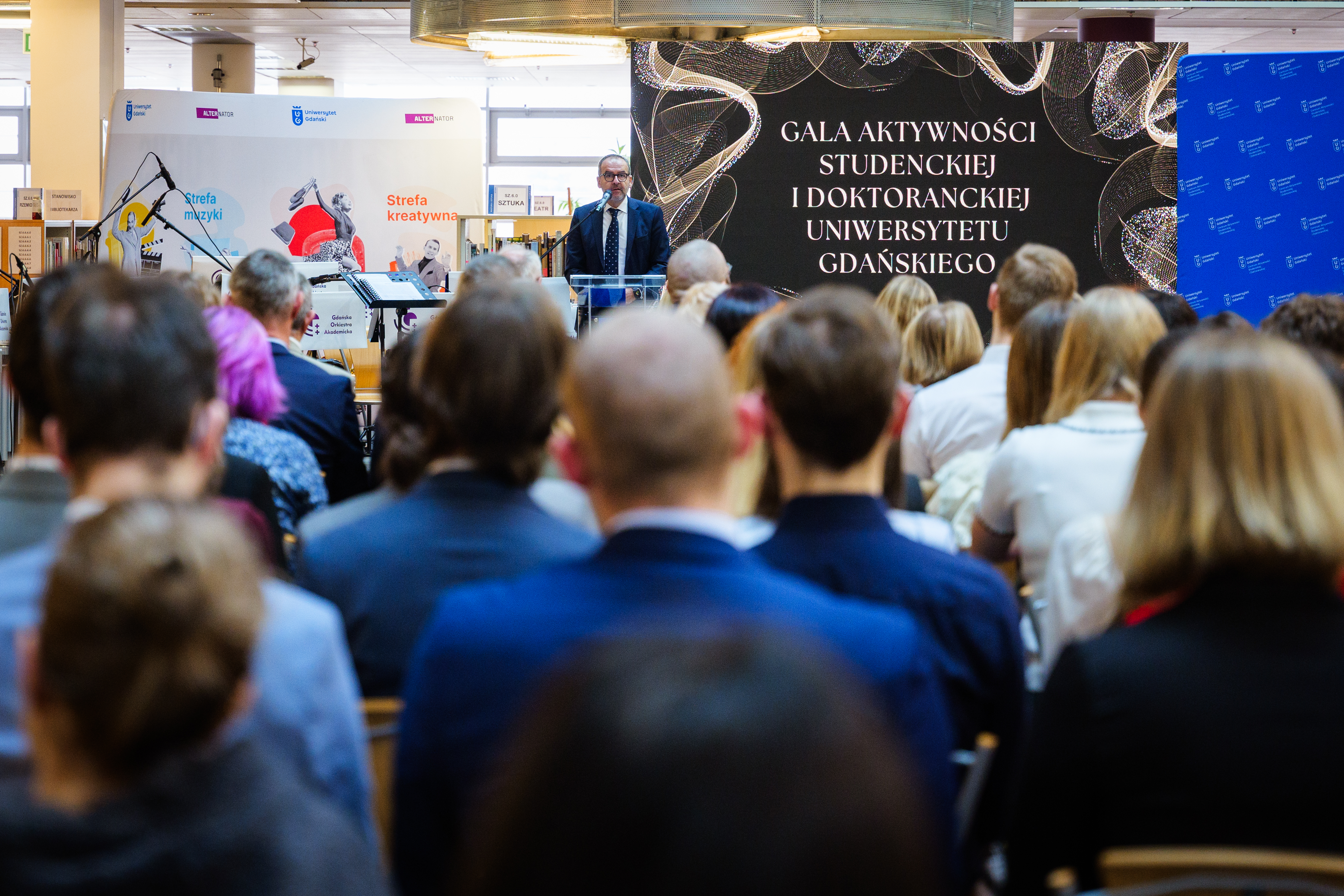 Następnie uczestników gali powitali Rektor UG prof. Piotr Stepnowski i Prorektor ds. Studentów i Jakości Kształcenia dr hab. Arnold Kłonczyński, prof. UG. Rektor w swoim wystąpieniu podkreślił znaczenie działalności pozanaukowej studentów i doktorantów dla wspólnoty środowiska akademickiego Uniwersytetu Gdańskiego oraz konieczność nagradzania tych wysiłków. Zauważył, jak ważne jest działanie razem na rzecz wspólnoty akademickiej, która nie byłaby pełna, gdyby nie udział studentów i doktorantów. Z kolei Prorektor ds. Studentów i Jakości Kształcenia, prof. Arnold Kłonczyński, wskazał na ogromne znaczenie, jakie dla uniwersytetu oraz tworzenia tzw. wielobarwności życia uniwersyteckiego ma aktywność studencka i doktorancka w obszarze naukowym, organizacyjnym, artystycznym i sportowym. Profesor zauważył, że organizacja wydarzeń naukowych i pozanaukowych wymaga wiele wysiłku oraz zaangażowania, co również powinno być docenione, a takie docenienie jest możliwe właśnie w ramach tej gali.